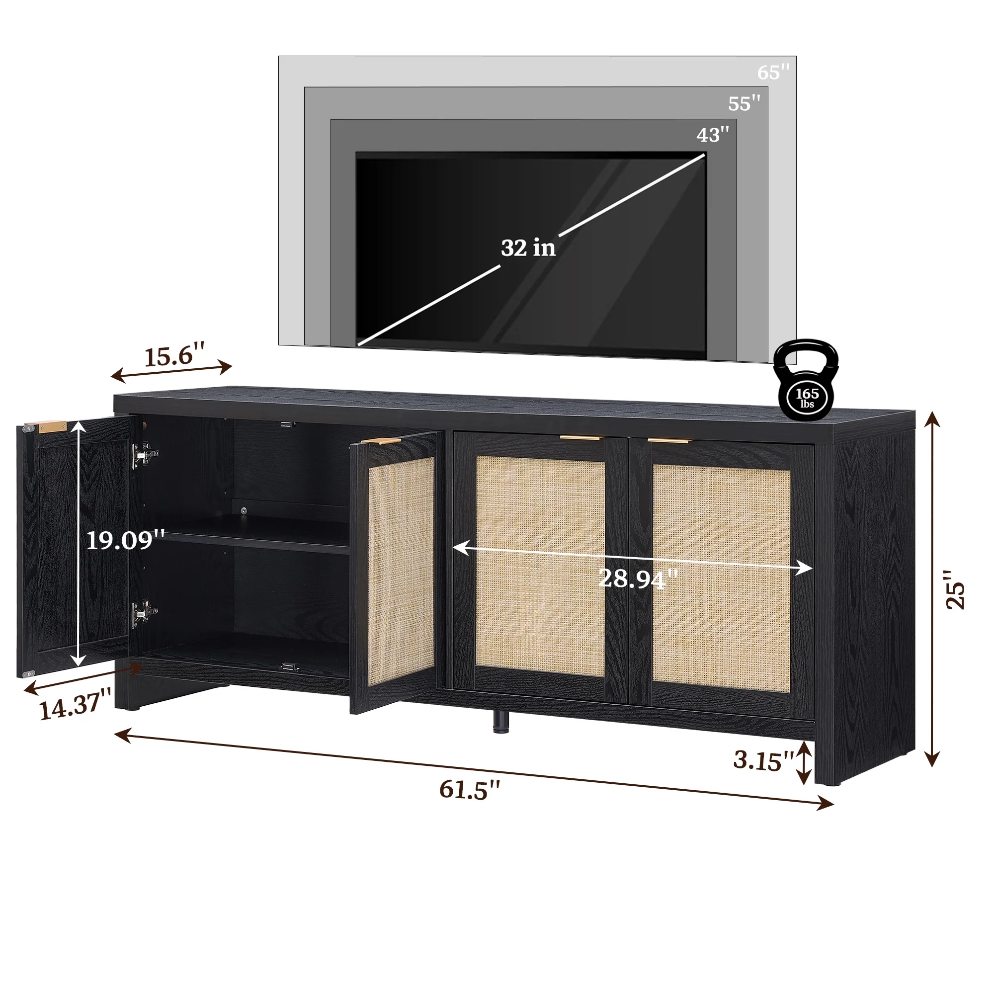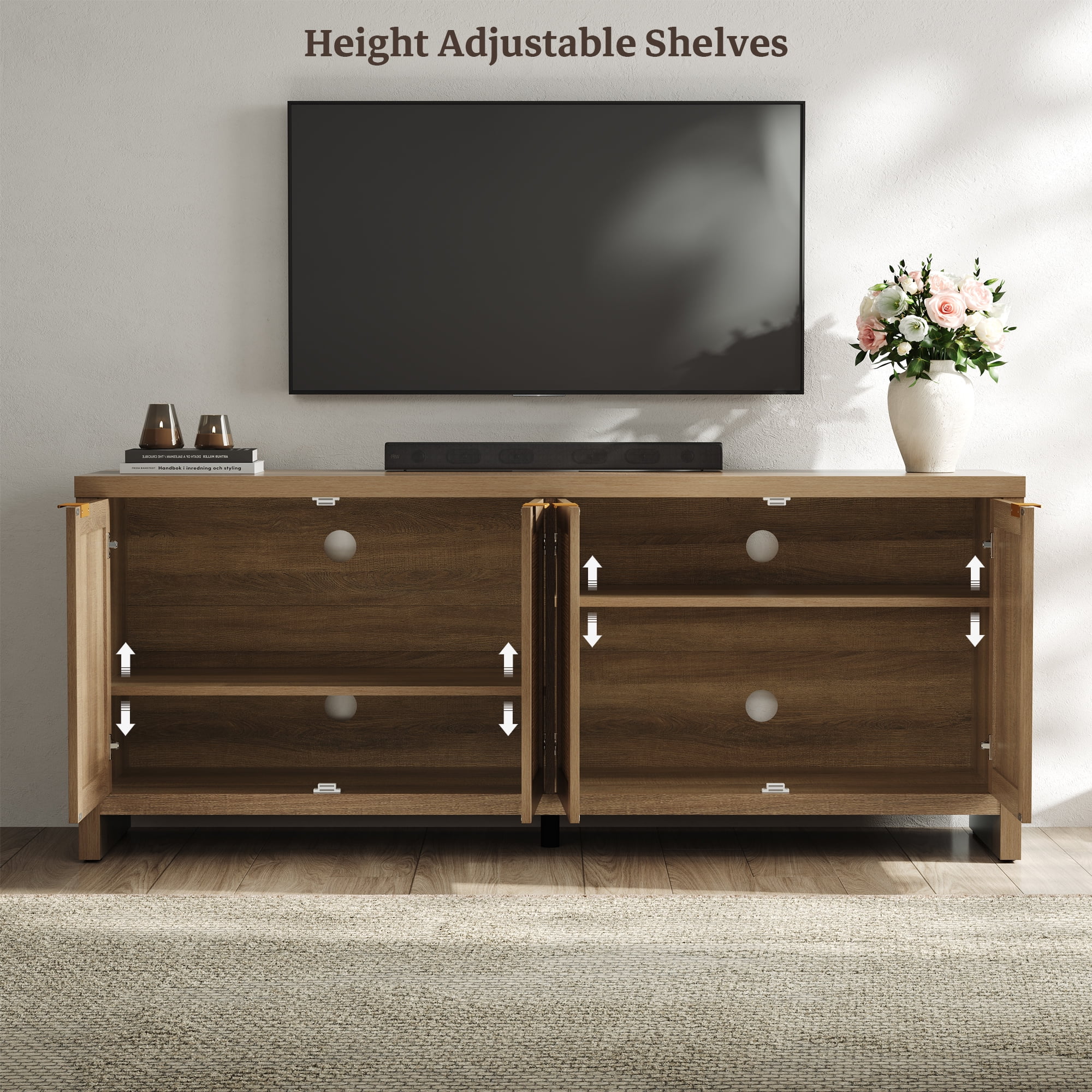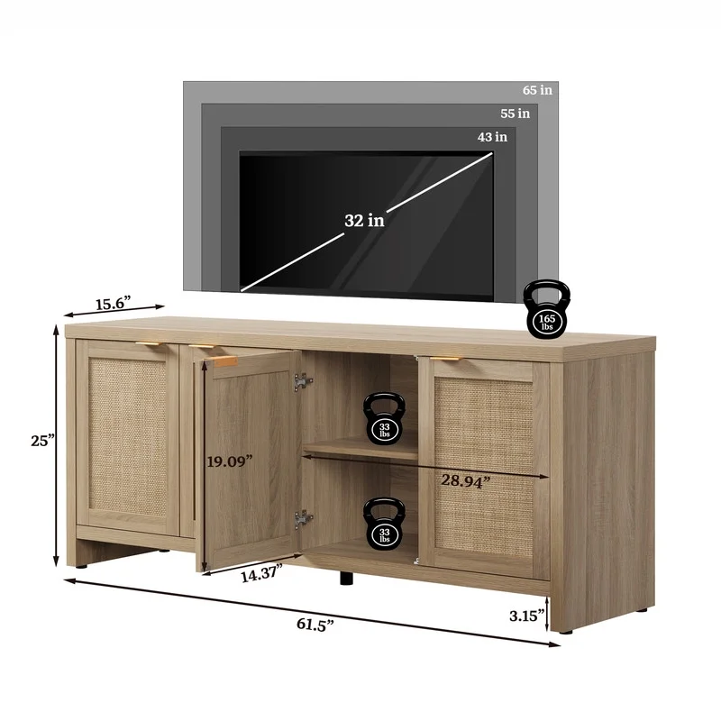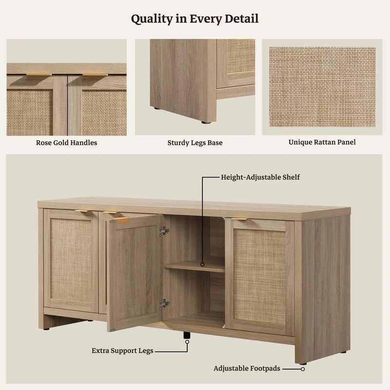 Product Description: Upgrade your living room with the SICOTAS Rattan TV Stand, a perfect blend of boho charm and farmhouse functionality. Designed to support TVs up to 61.5 inches, this media console features a sturdy construction, spacious countertop, and versatile storage with 4 cabinets and adjustable shelves. The woven rattan panel and rose gold handles add a touch of rustic elegance, while the hidden handles and cable management holes ensure a clean, clutter-free look. With adjustable footpads for stability and a 165 lb weight capacity, this TV stand is built for both style and durability. Whether you need organized storage for gaming consoles, books, or d��cor, this piece seamlessly fits into small apartments or spacious living rooms, making it a must-have for modern homes.