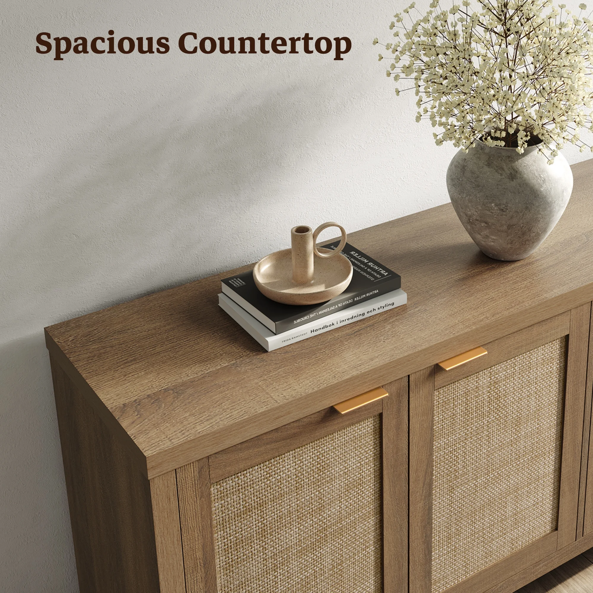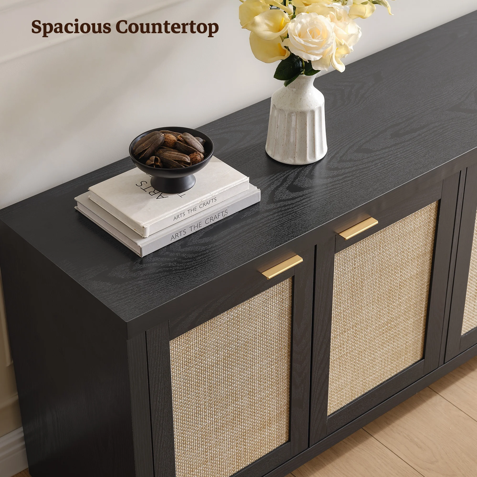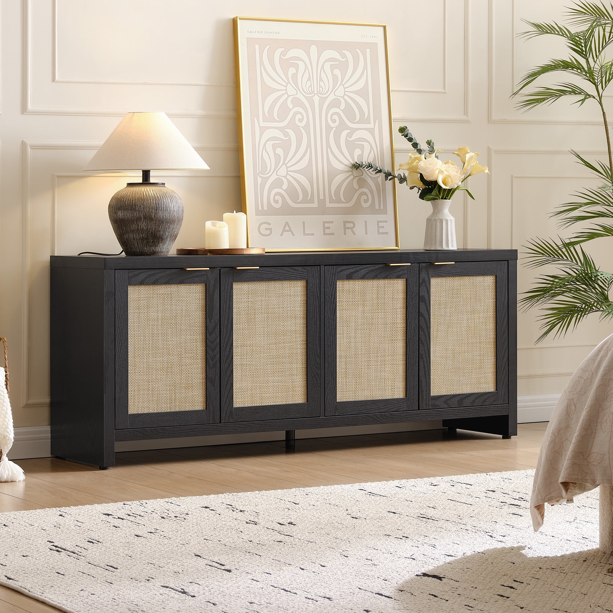 Product Description: Upgrade your living room with the SICOTAS Rattan TV Stand, a perfect blend of boho charm and farmhouse functionality. Designed to support TVs up to 61.5 inches, this media console features a sturdy construction, spacious countertop, and versatile storage with 4 cabinets and adjustable shelves. The woven rattan panel and rose gold handles add a touch of rustic elegance, while the hidden handles and cable management holes ensure a clean, clutter-free look. With adjustable footpads for stability and a 165 lb weight capacity, this TV stand is built for both style and durability. Whether you need organized storage for gaming consoles, books, or d��cor, this piece seamlessly fits into small apartments or spacious living rooms, making it a must-have for modern homes.