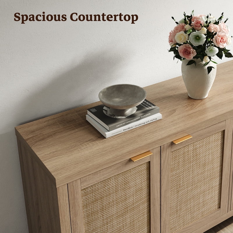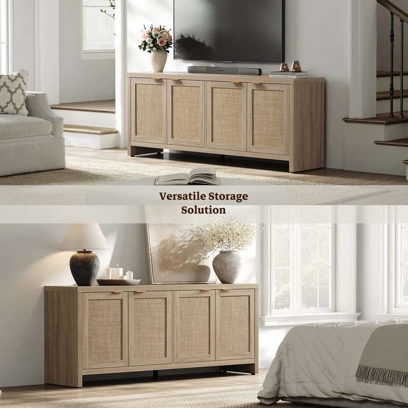 SICOTAS 61.5"w Rattan TV Stand with 4 Doors, Boho Entertainment Center with Adjustable Shelves & Spacious Countertop - Large Boho Farmhouse Media Console for Living Room, Reclaimed Caramel Oak
