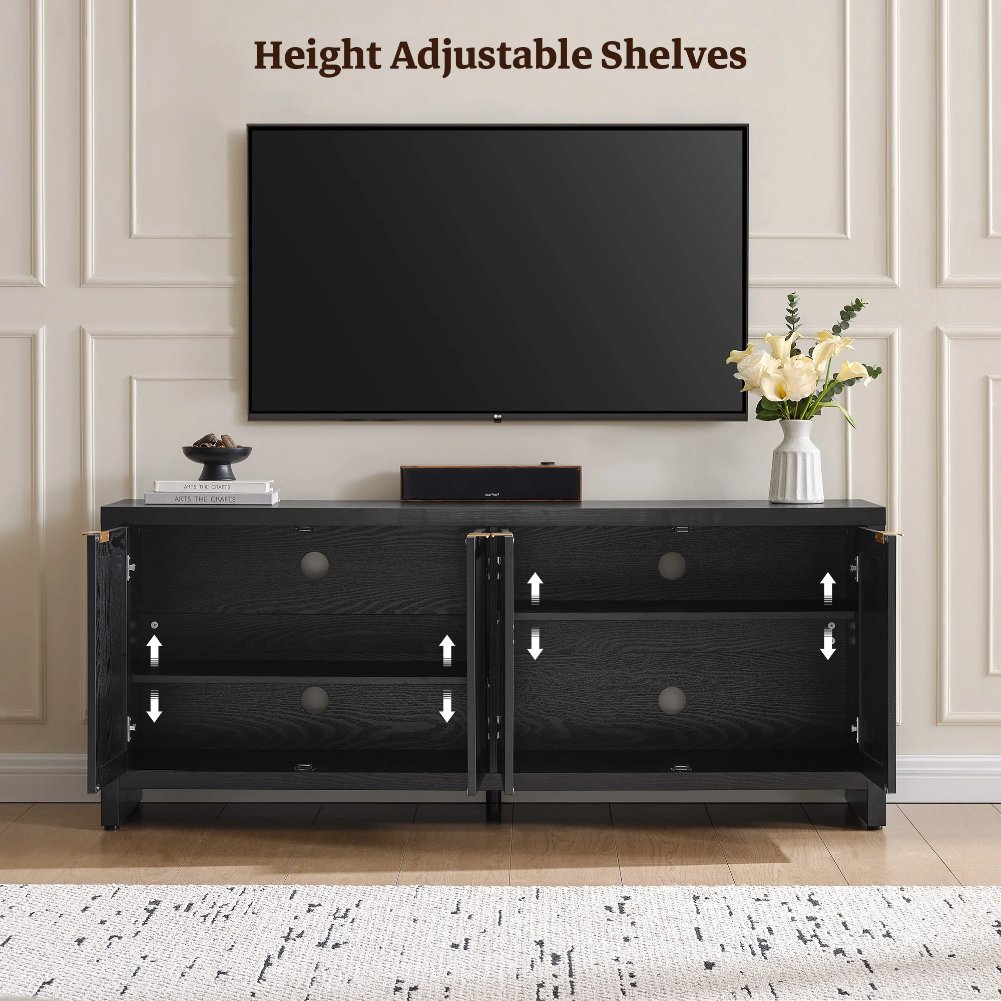 - ��Versatile Storage Solution Large TV Console��- With 4 doors and height-adjustable shelves, this TV stand offers customizable storage for gaming consoles, DVDs, and living room essentials. The 4 cable holes keep wires organized, while the hidden handles maintain a sleek, clutter-free look.