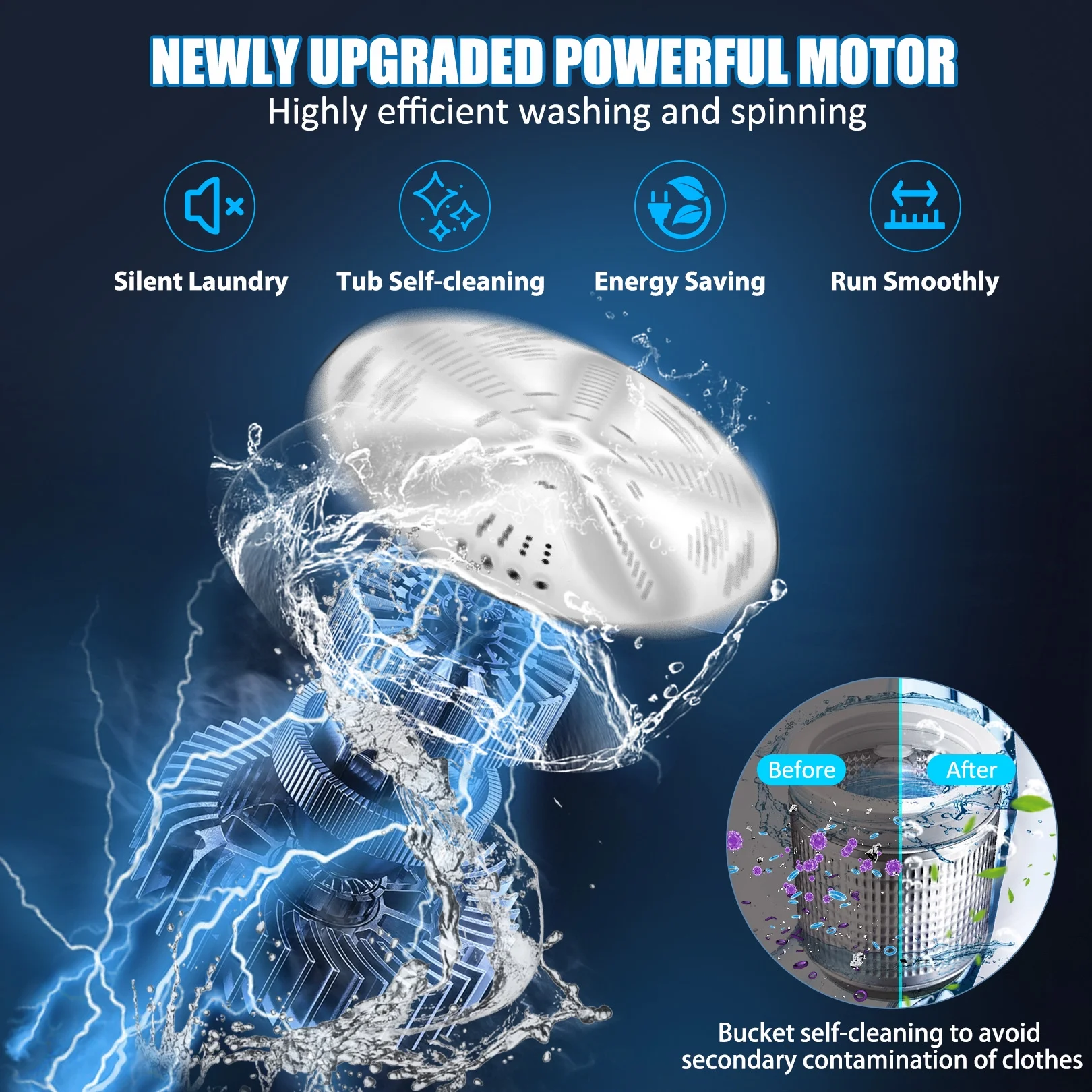 - HIGH POWER MOTOR HIGH PERFORMANCE: This fully automatic washing machine is equipped with a high-quality, durable motor that provides consistent power to ensure your clothes get cleaner. Our portable washer saves your family money by being up to 95% more energy efficient than similar models. The 3D wheel ensures that your clothes won't tangle during the wash and prevents your clothes from getting out of shape after washing.