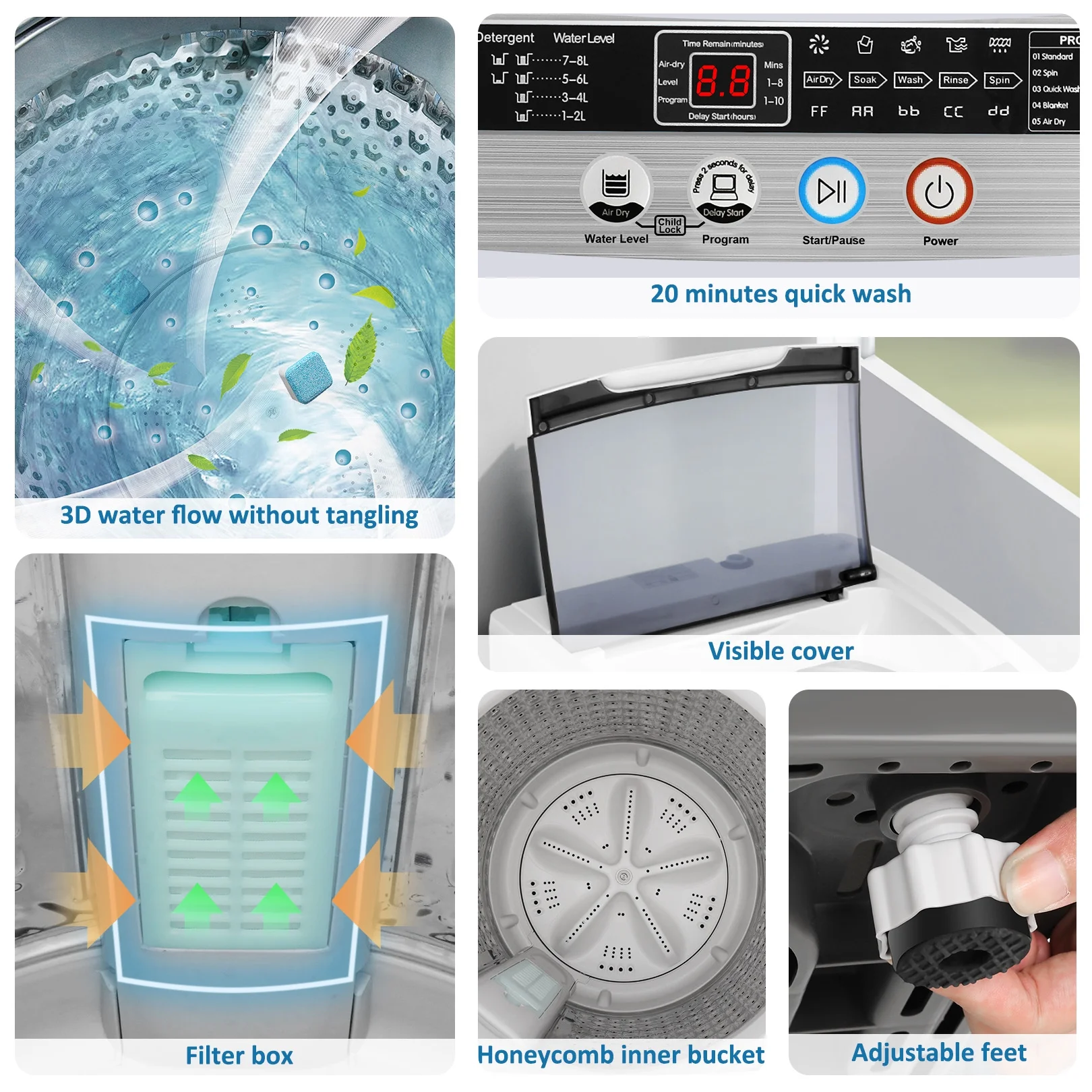 - FULLY AUTOMATIC AND EASY TO USE: This fully automatic portable washing machine has 10 programs (standard, spin, quick wash, blanket, air dry, soak, wash, tub clean, water recycle, rinse spin) and 8 water levels to choose from. You can quickly start the appliance the way you like. It also has an LED display that shows you exactly what the machine is doing and a transparent lid that allows you to view and monitor the water.