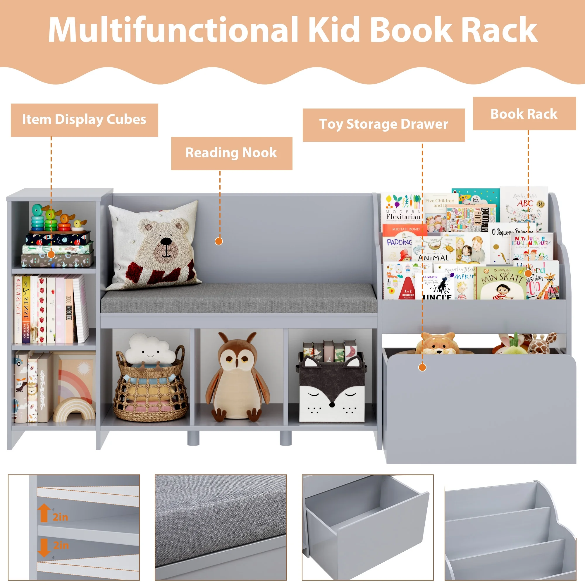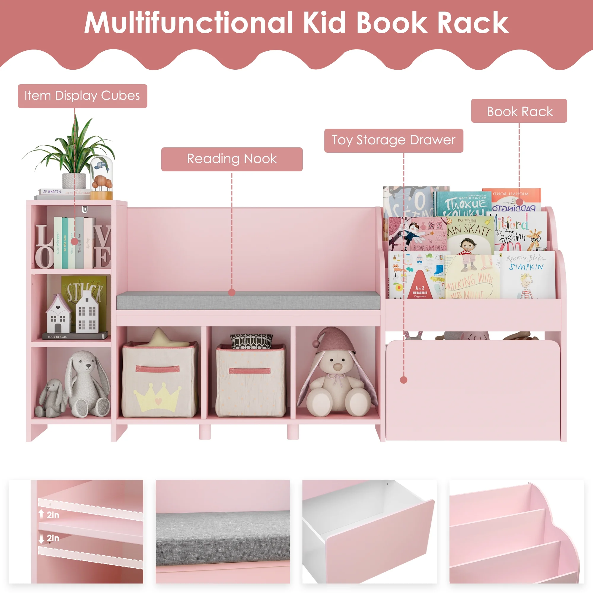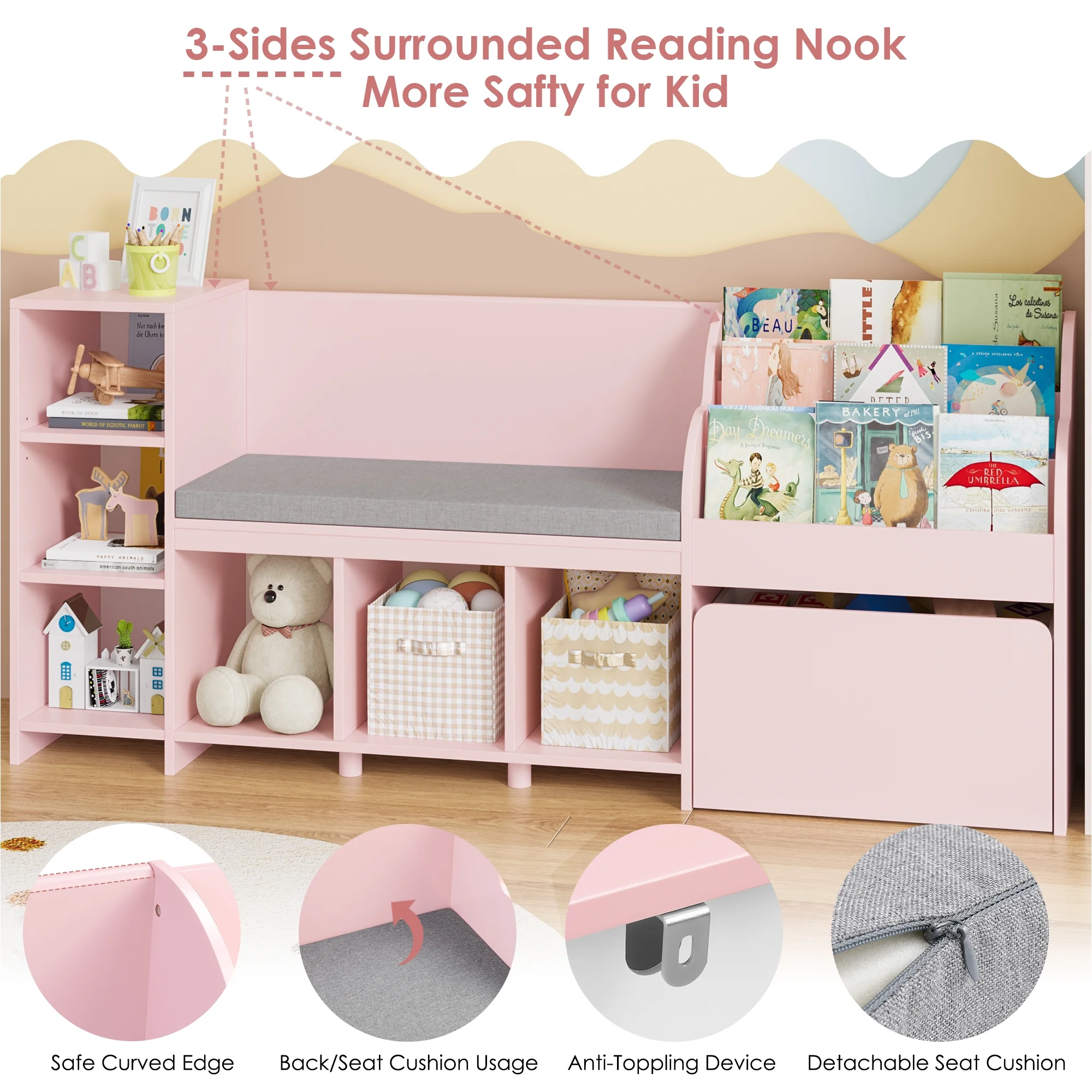 - ��Sturdy Structure & Anti-Falling Device��Scientific assembly way ensure the stable structure of this kids storage bookcase. 1 anti-falling device to prevent this kid cubby shelf with reading nook from falling down!
