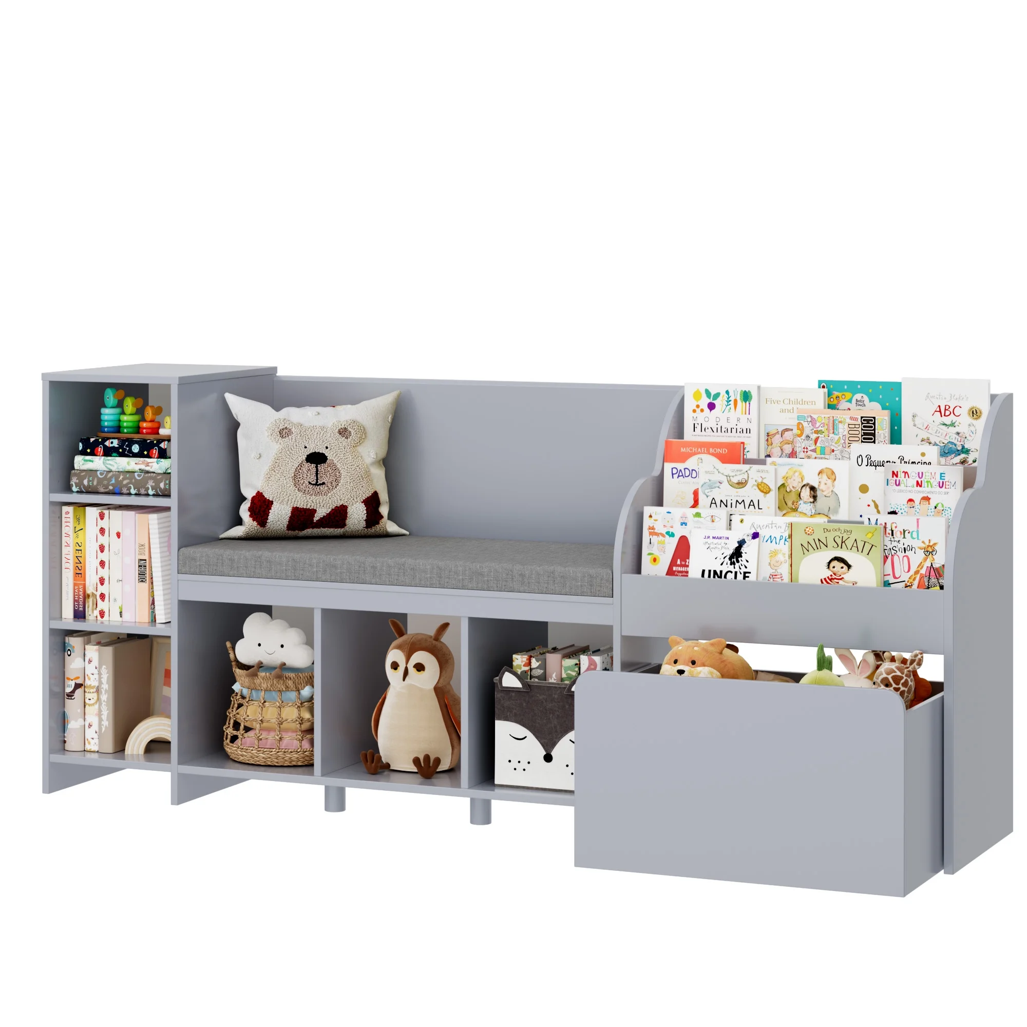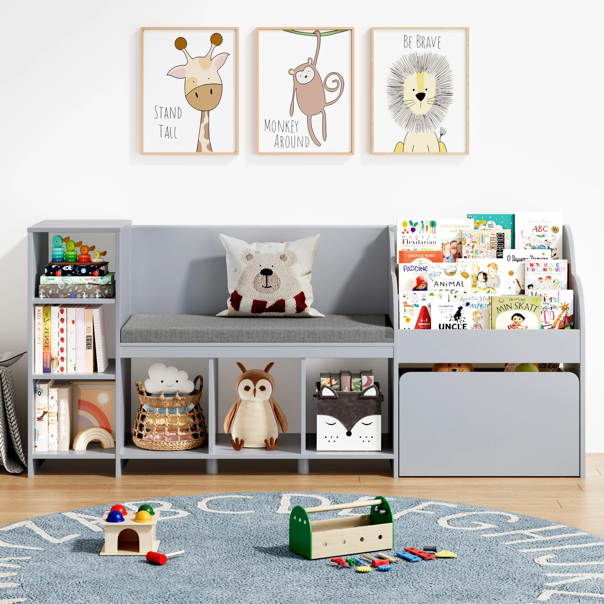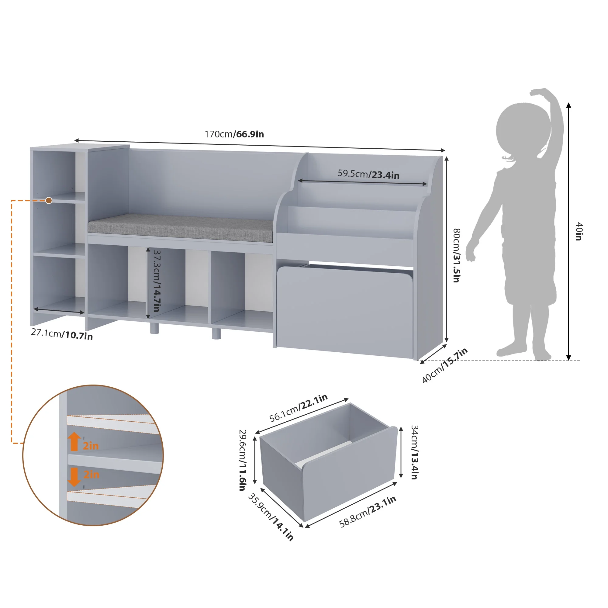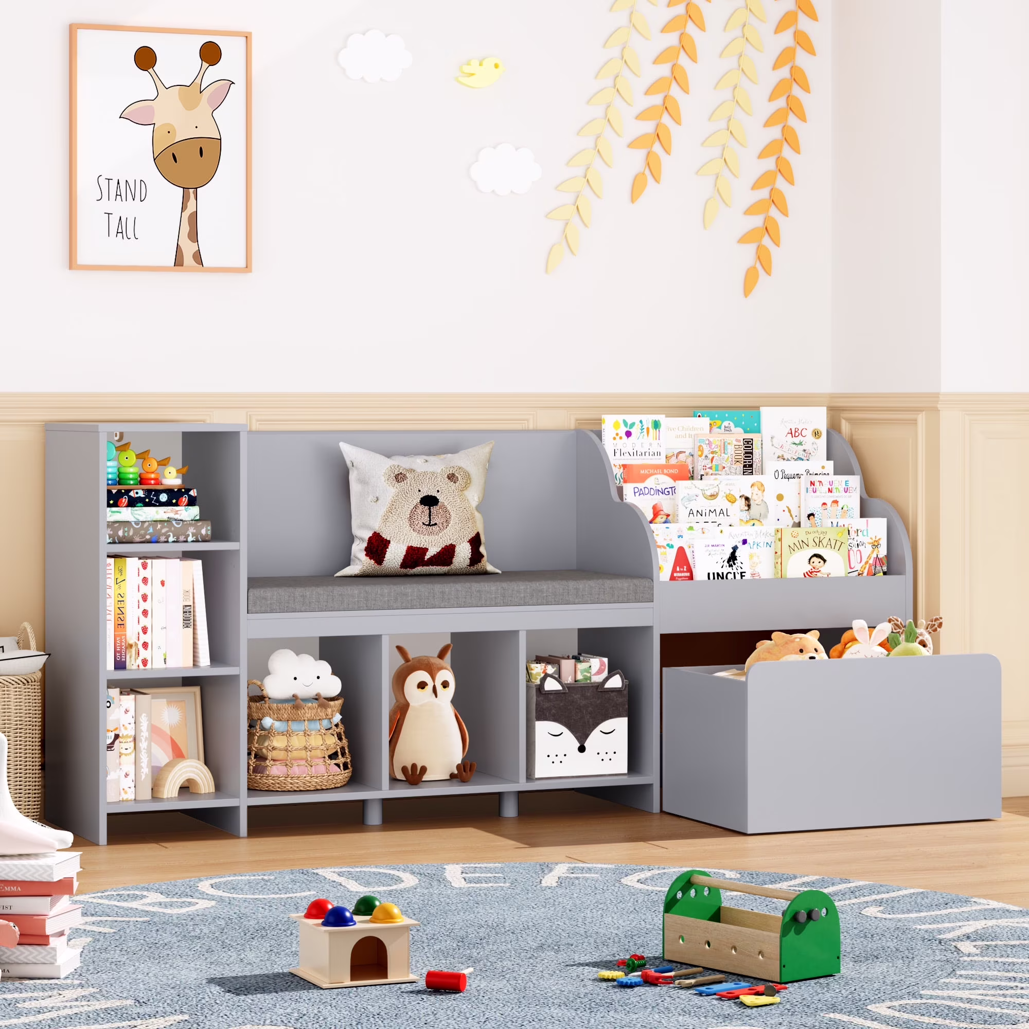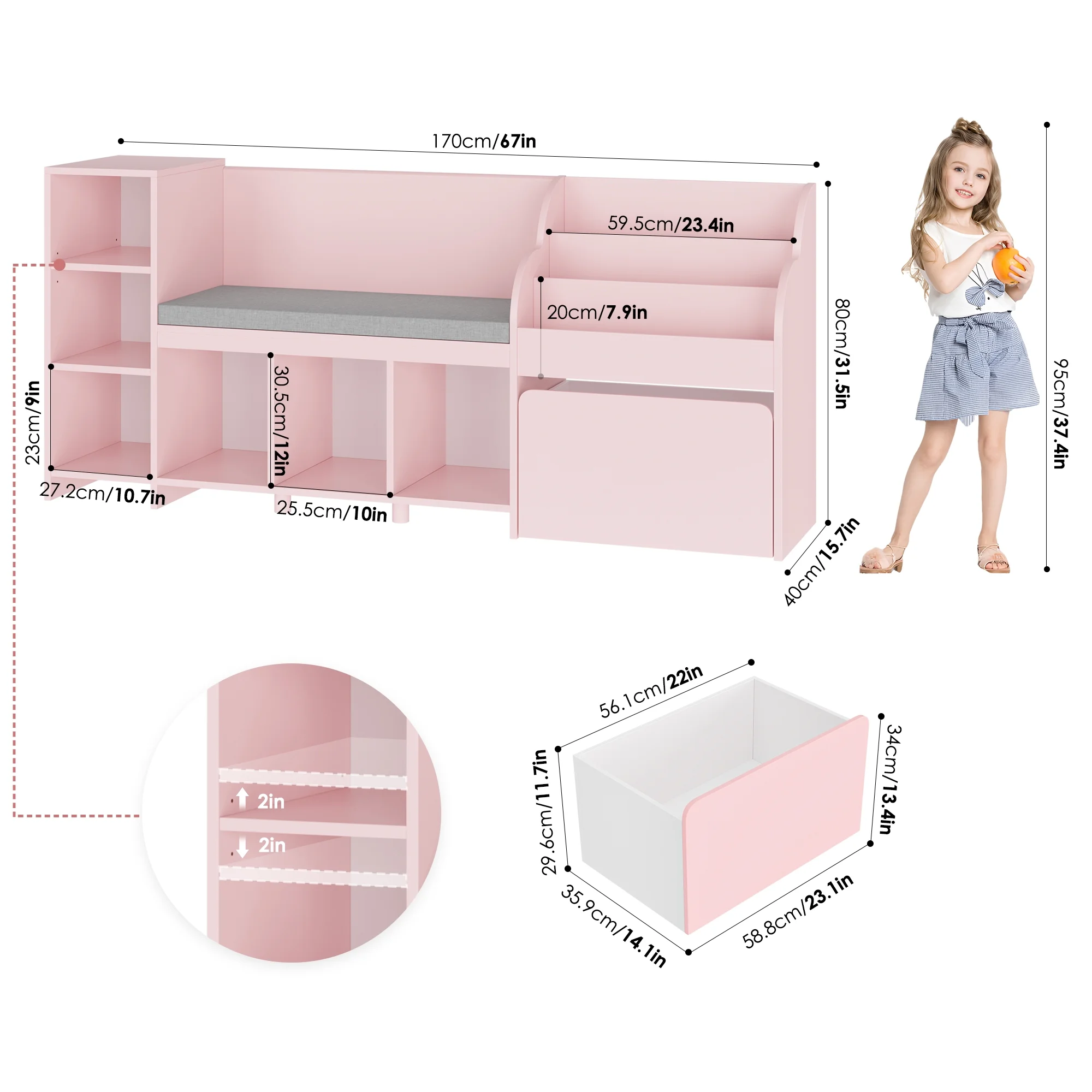 The 31.5'' height wooden toy and bookshelf for kids is perfect for your little one, since even items placed on the top of this kids storage shelf with bench can be easily accessed. The wider 3-tier display book rack can also update the capacity for children's illustrated books. Besides, 6 cubby shelf, two of which equipped with adjustable board, and 1 large-capacity mobile toy bin on wheels will meet various child's daily toy organize needs, cultivating their good storage habits while stimulating child's creative potential.?