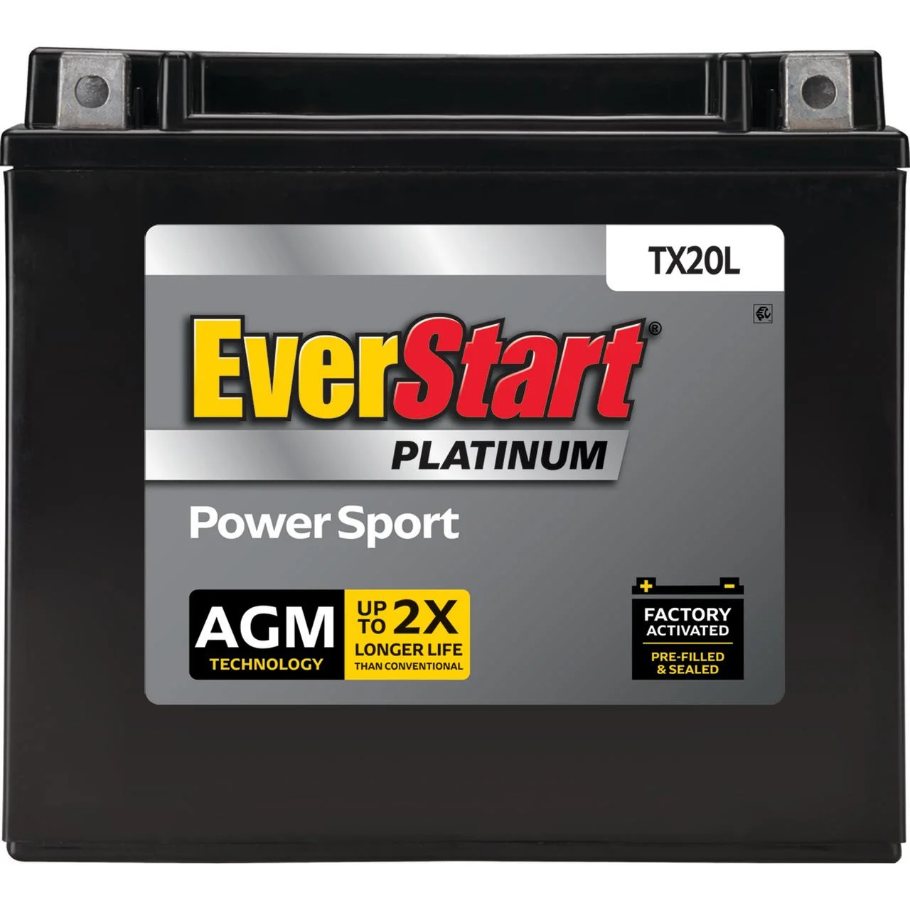 Get back on the road with this EverStart Premium AGM PowerSport Battery, Group Size TX20L (BOXED). It offers 310 CCAs with a 18 AH rating and is Ready to Ride, prefilled, sealed, and charged. Each battery is freshly charged, with no need to hassle with measuring, filling, and waiting for a charge �C so they��re ready when you��re ready. It��s designed for use with a motorcycle, side-by-side, ATV, UTV, snowmobile or water craft. Because EverStart batteries feature AGM technology, they��re built to handle whatever the road, dirt, water, and snow can dish out and still deliver high performance. Superior vibration resistance and proven AGM technology ensure consistent, high-amp starting. Specs/Images of batteries on this site may differ slightly from the physical product in the store.