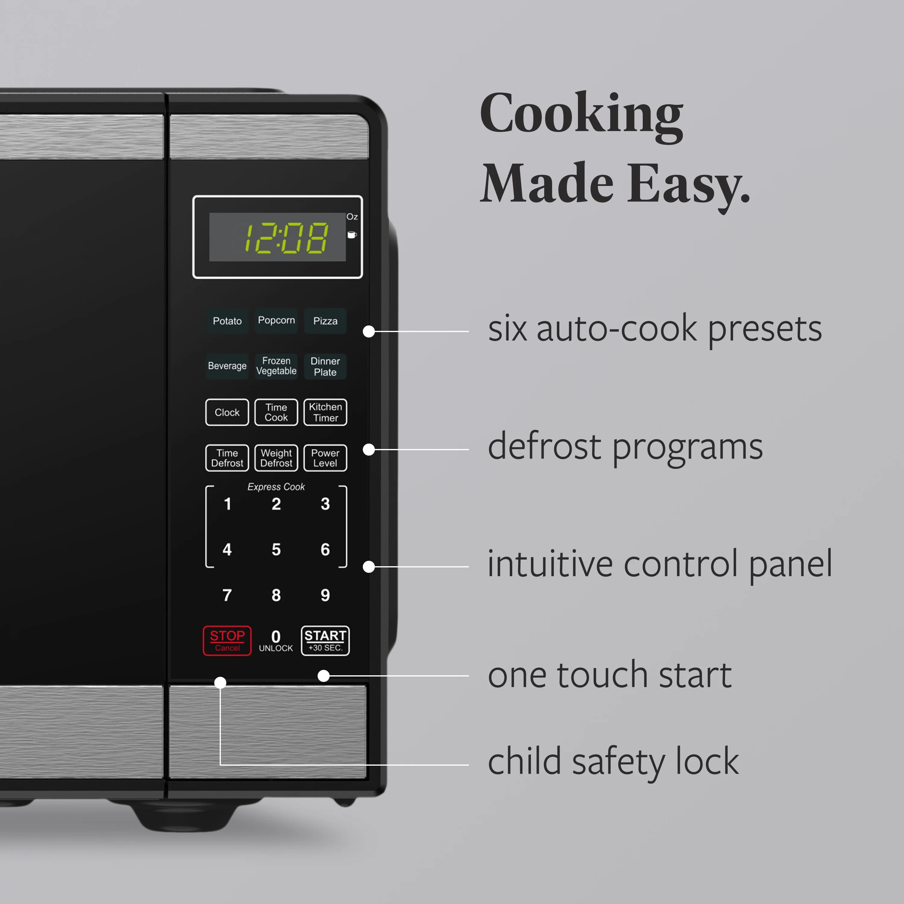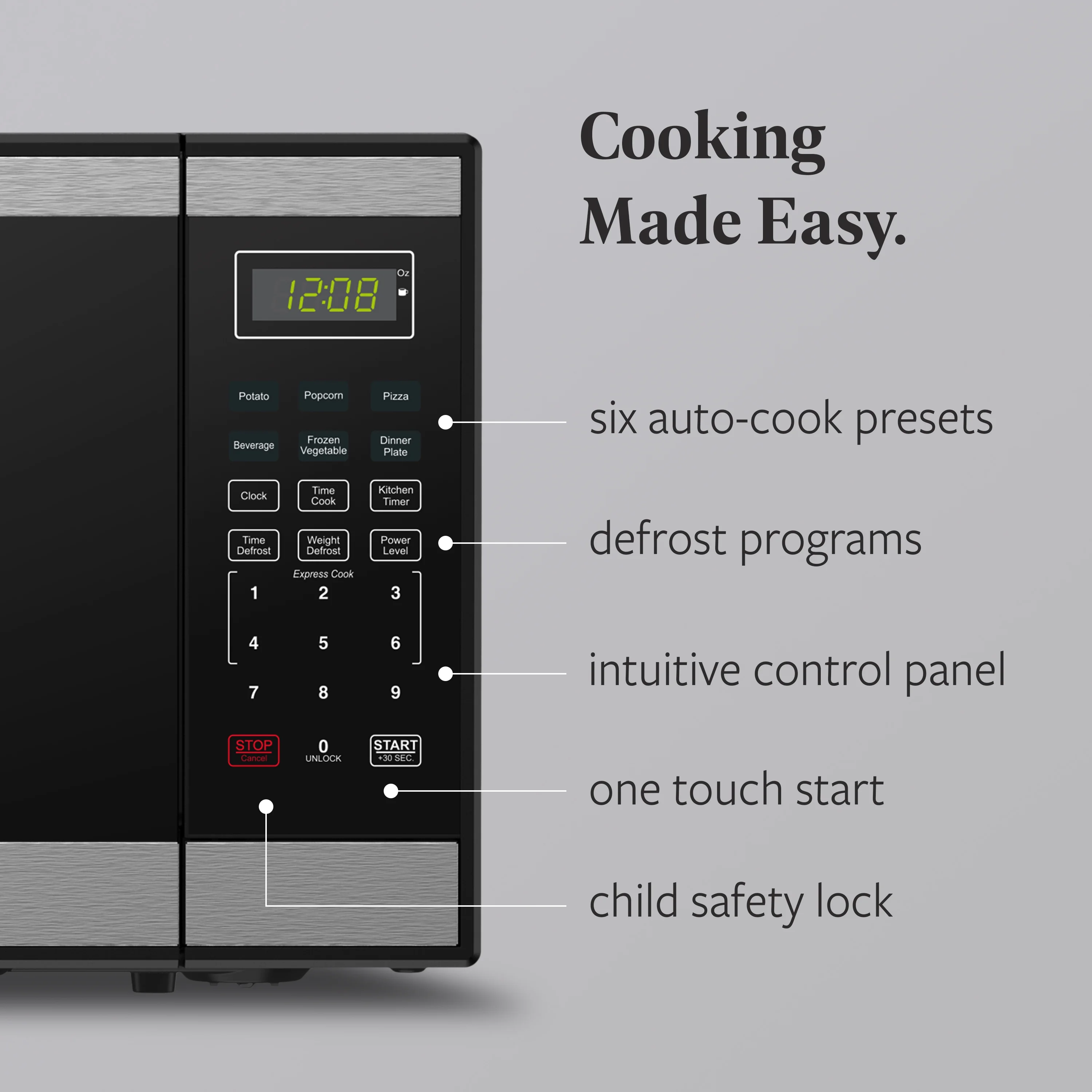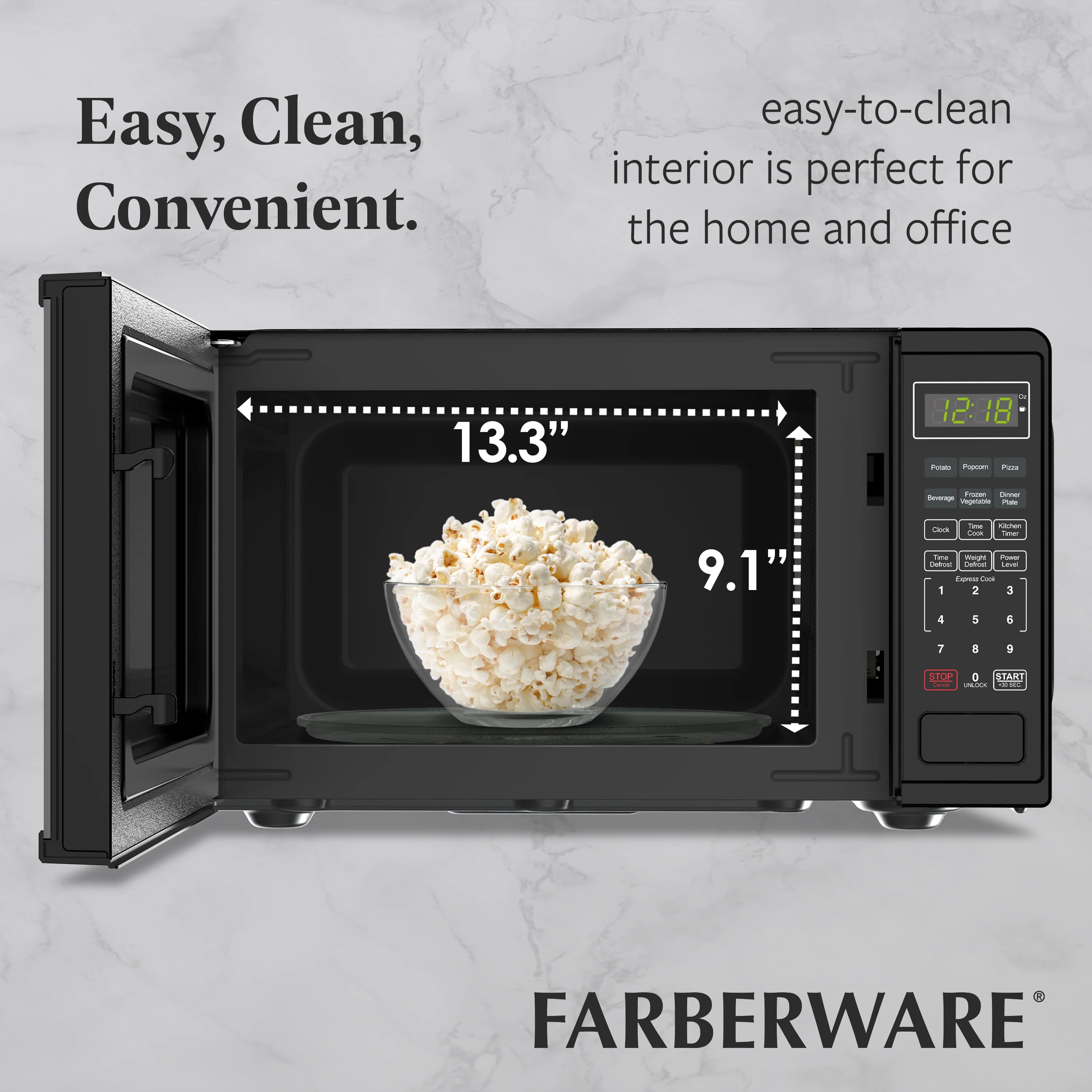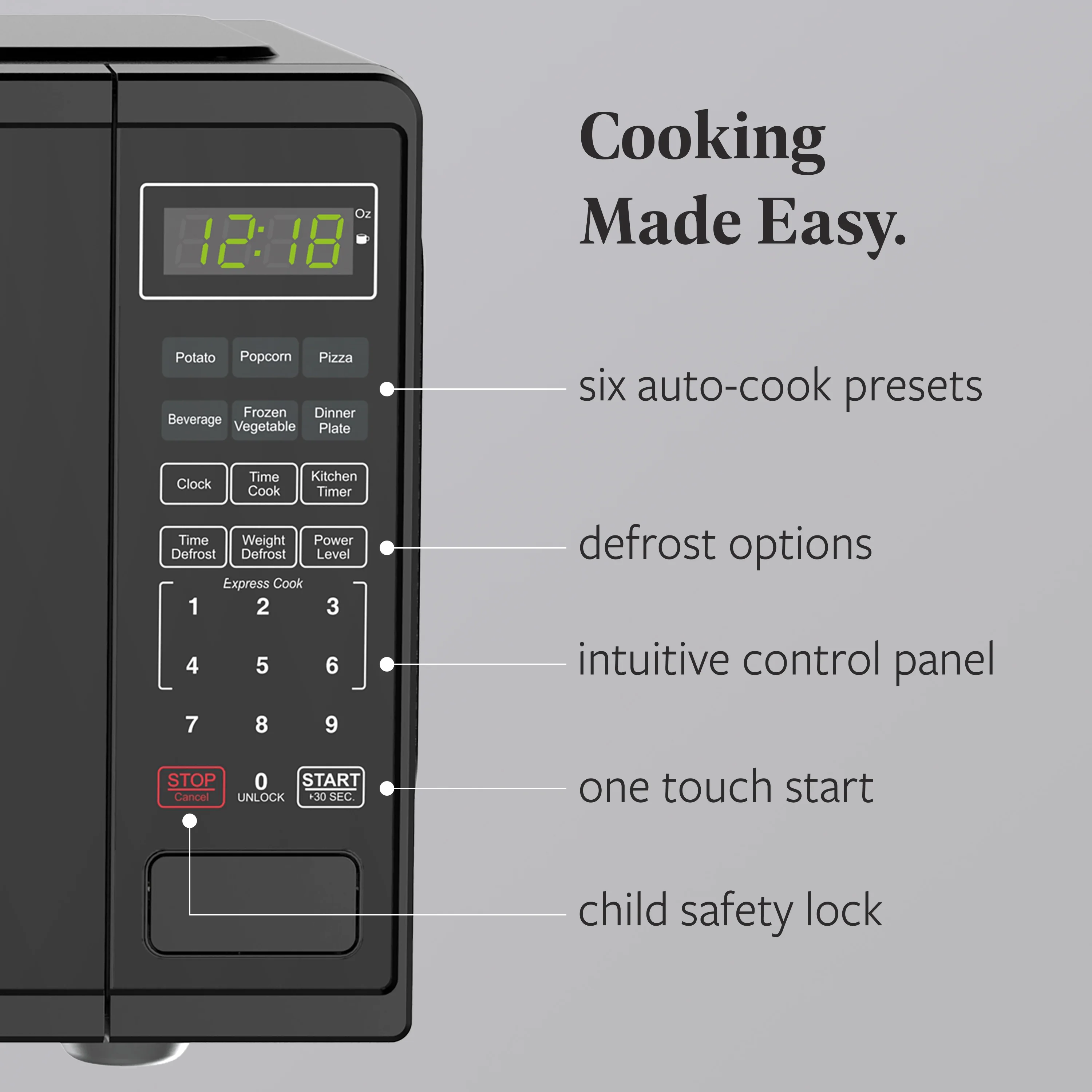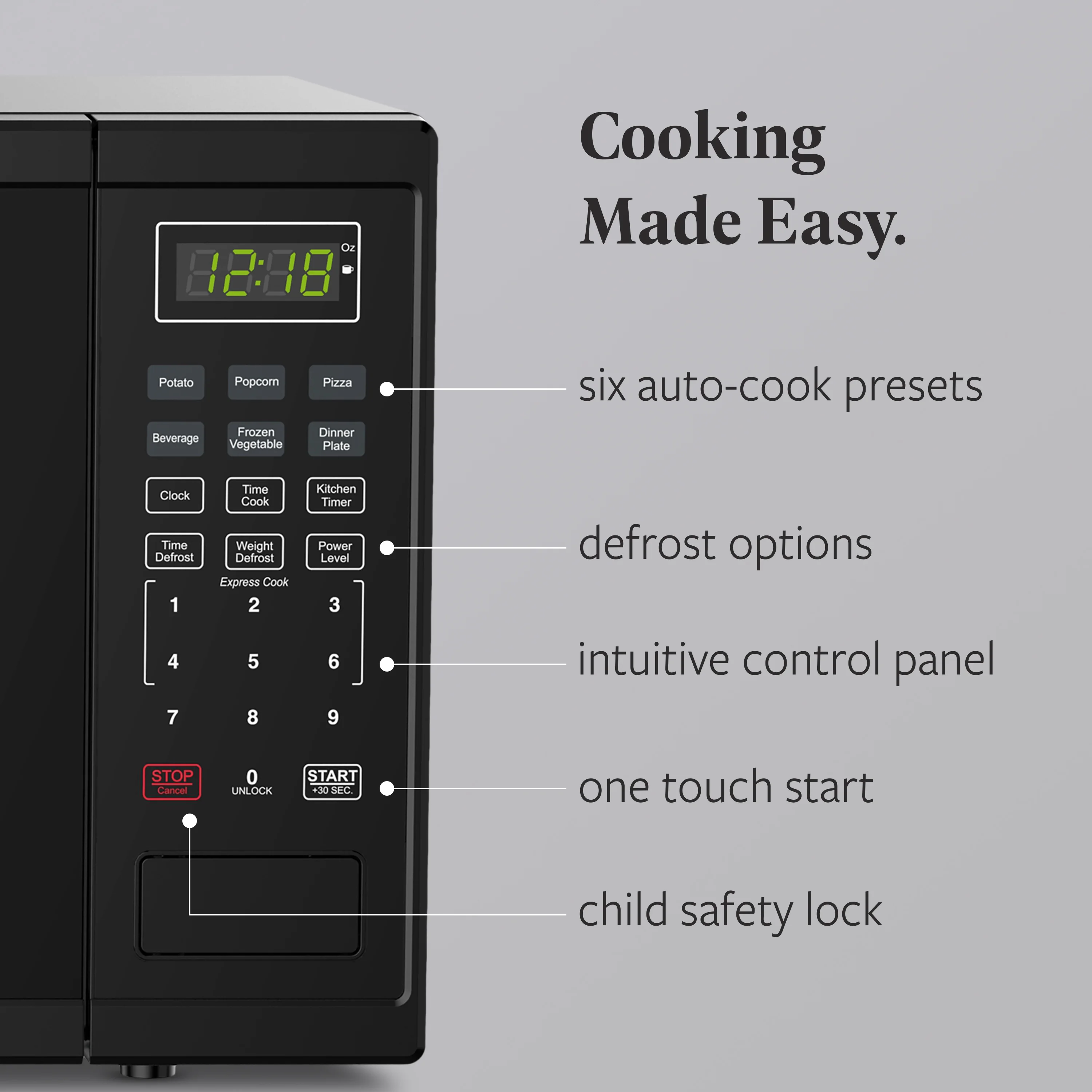 - ALL YOU NEED: This microwave has a clear LED display with a kitchen timer and clock that lets you easily keep track of time. Easy-to-view interior lighting lets you keep an eye on your dish, and a child safety lock adds additional security.