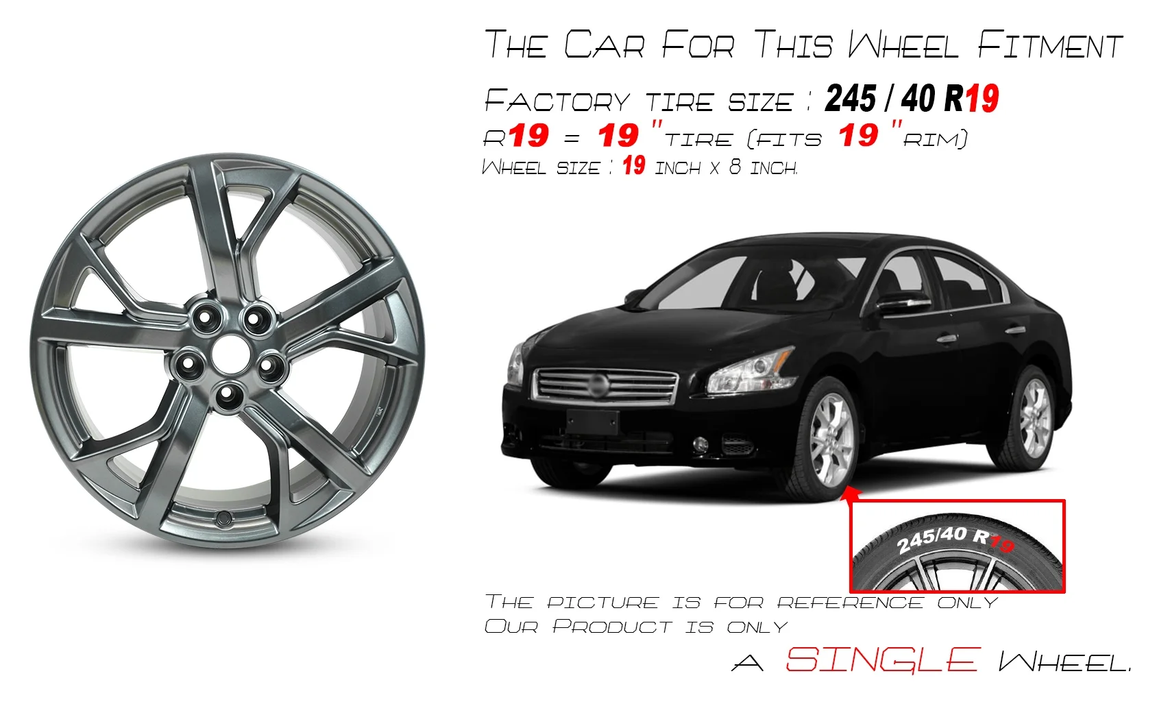 - ? This Fits: ? MAXIMA 2012-2014 19x8 (alloy, 5 spoke, painted), bright hyper silver ? OEM Tire Size: 245/40R19, 245/40ZR19 ? Color/Finish: GREY