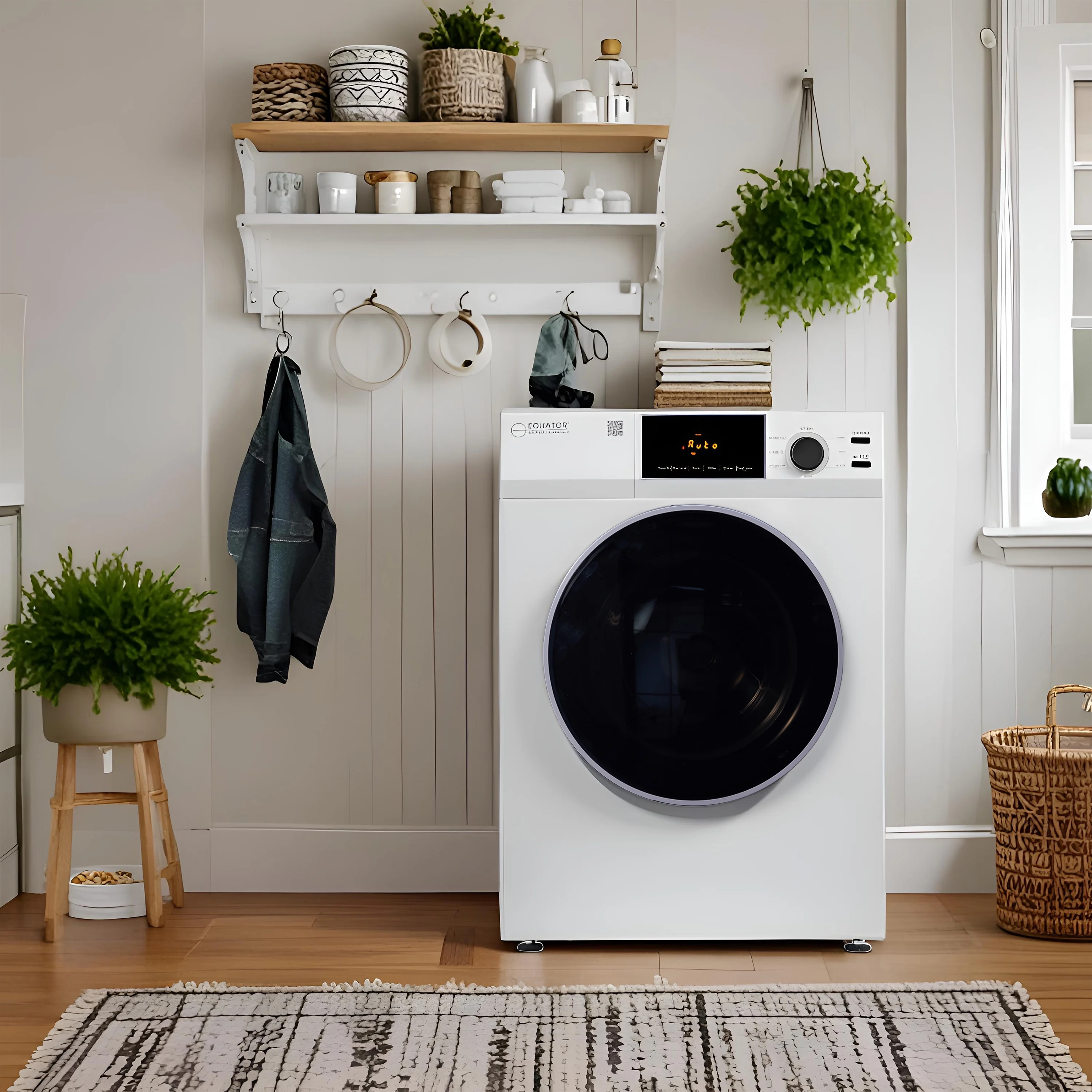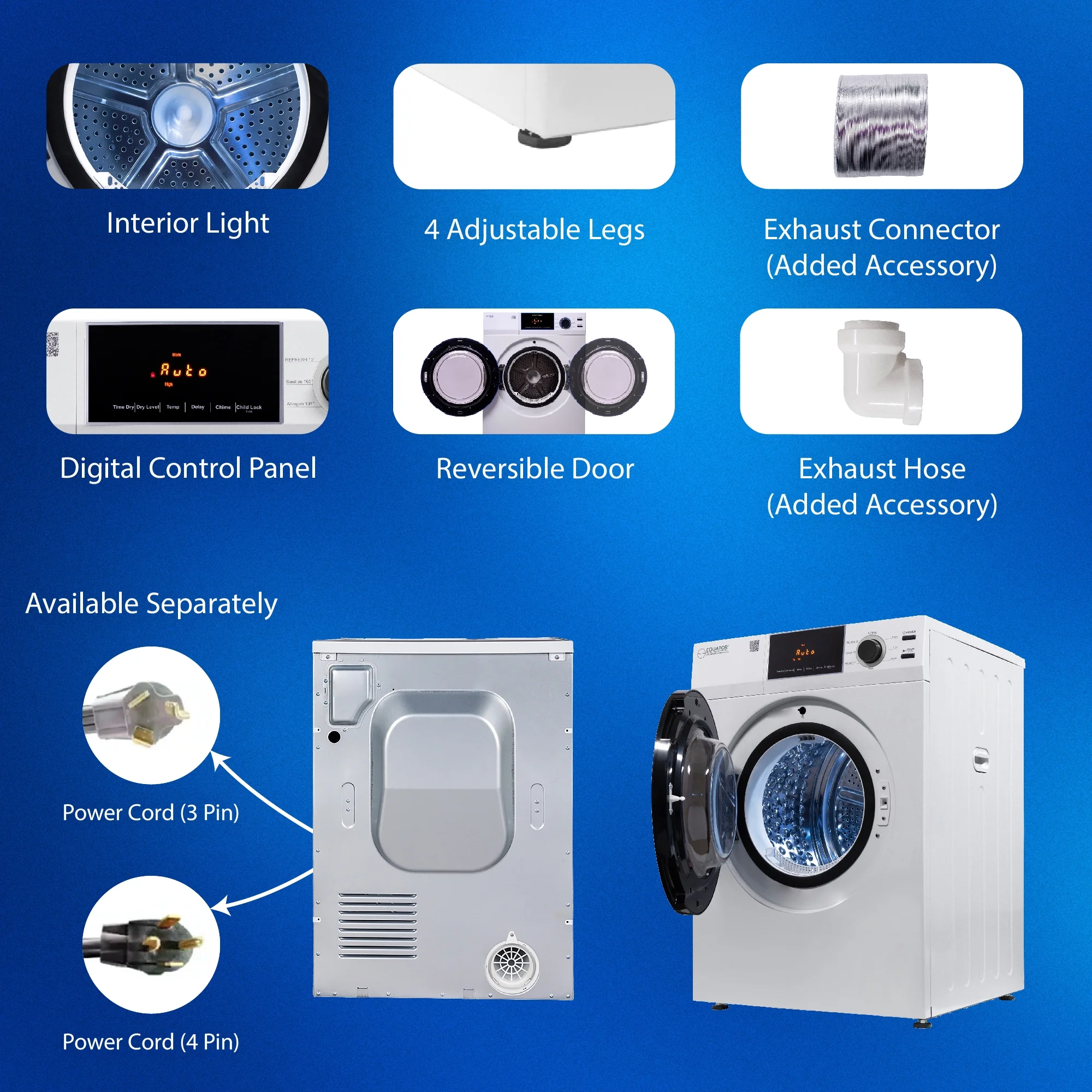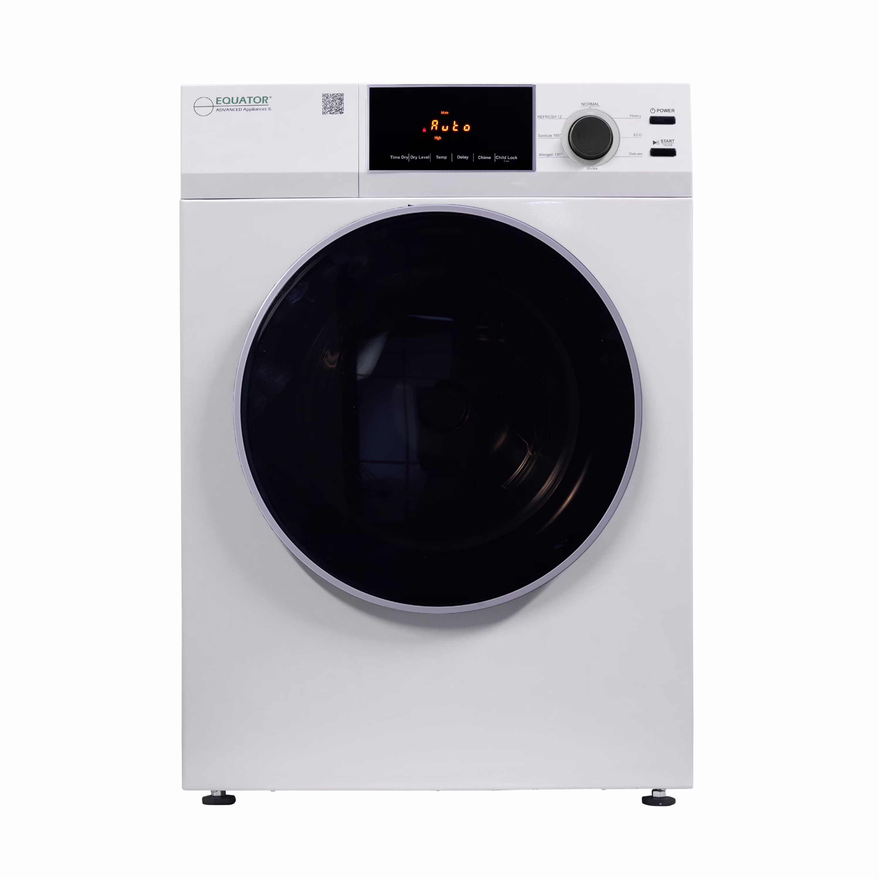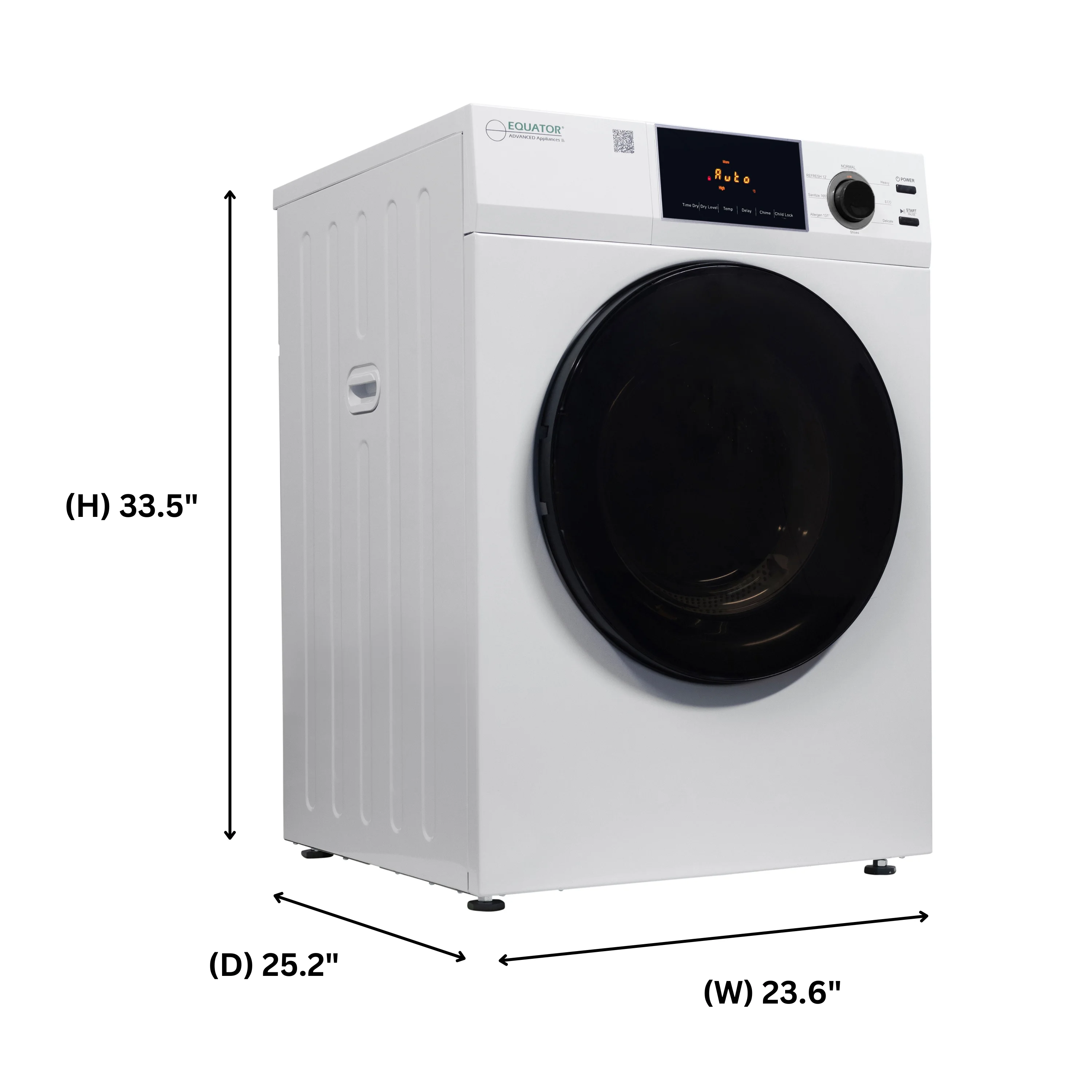 Dry laundry to the optimum level when using the Equator 4 cu.ft. White Vented Dryer ED 880. Measuring 33.5" x 23.6" x 25.2" (HxWxD). Using the front-facing digital display, easily select from multiple drying programs including Normal, Heavy, Eco, Delicate, Shoes, Allergen, Sanitize, and Refresh. Additional built-in programs such as sensor dry, 3 heat levels, and 4 dry levels make drying more precise. There are additional features such as a delay start, a diagnostic menu, on/off the chime, a secure child lock, a reversible door, an interior light, a Clean Lint Filter reminder, a remaining time display, and automatic temperature control. Included with the ED 880 is an exhaust elbow and exhaust hose to connect to the wall. A 220V (3 or 4 Pin) Power Cord is necessary to be installed to operate the machine. Additional accessories sold separately are the Stacking kit to stack it with the Equator Washer, Pedestal to raise the height by 11".