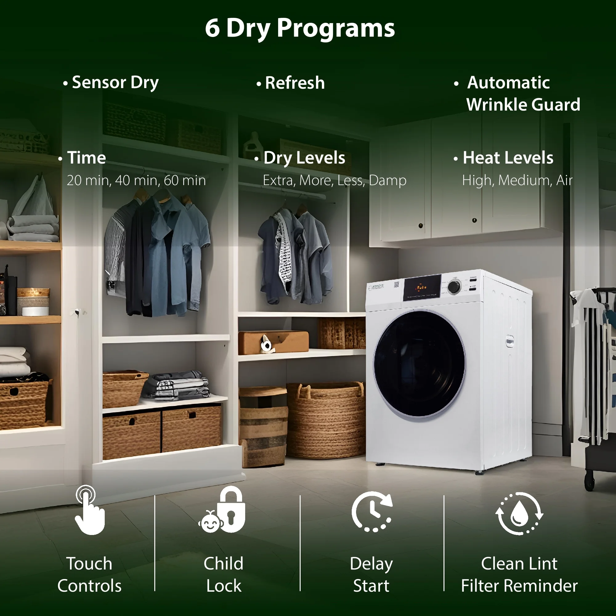 - Lint Filter Clean Sensor- Always know when it's time to clean out the lint filter.