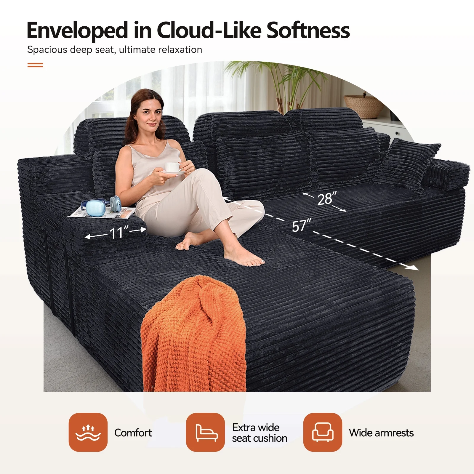 - Extra-deep seating (57" chaise longue) allows for full leg extension, perfect for working, binge-watching, or even taking a nap!