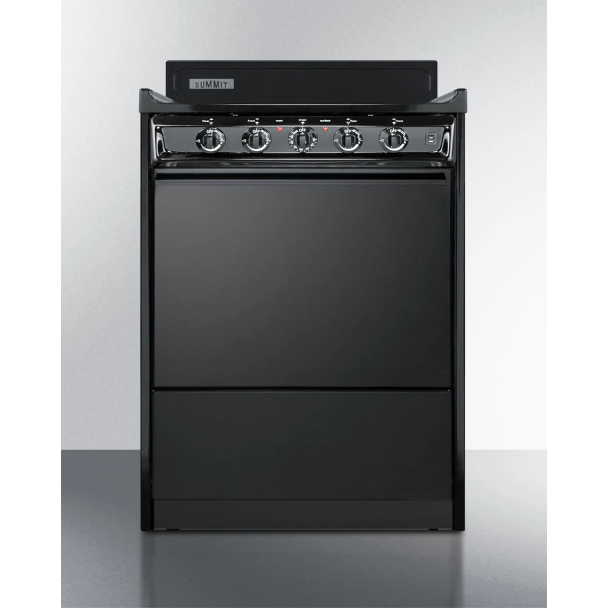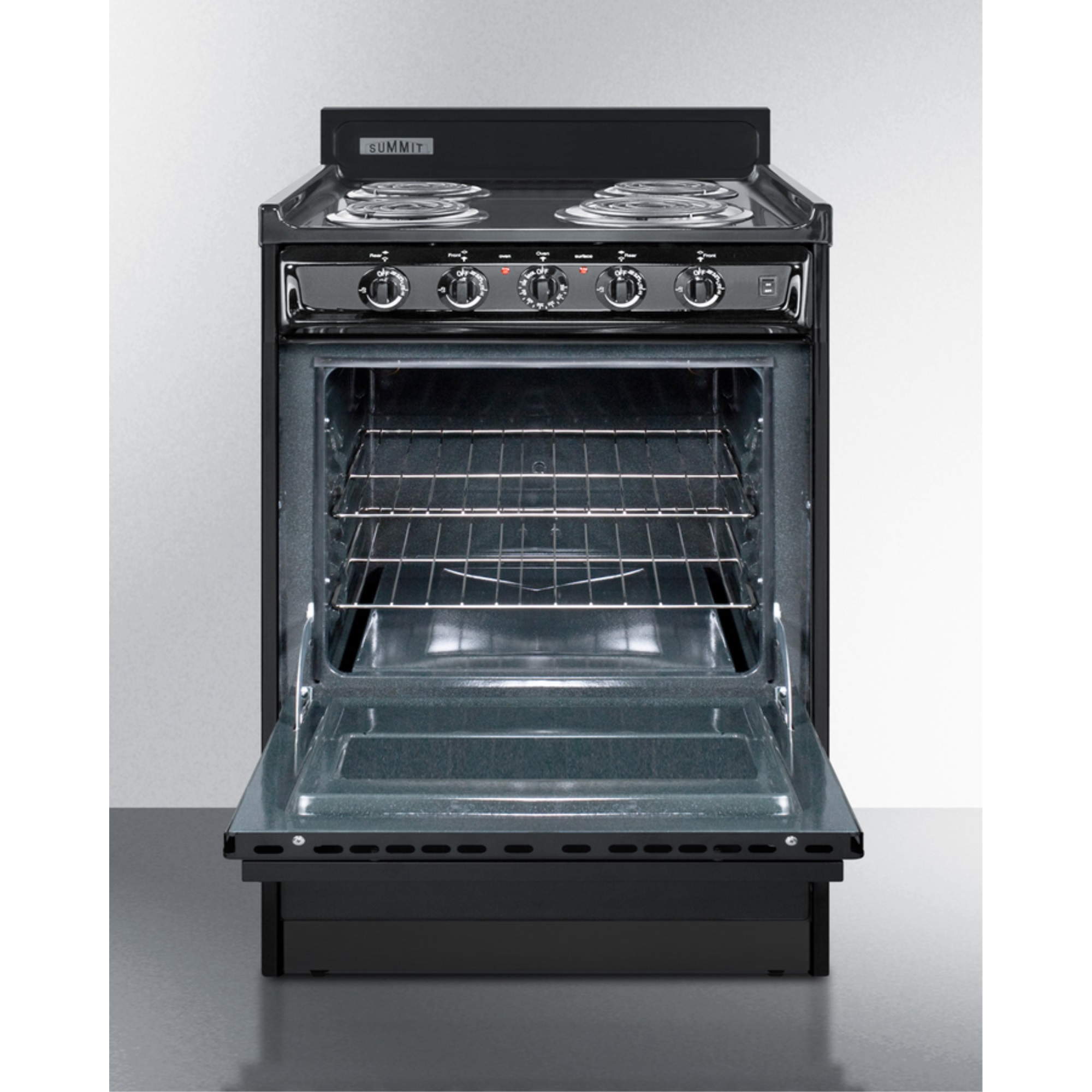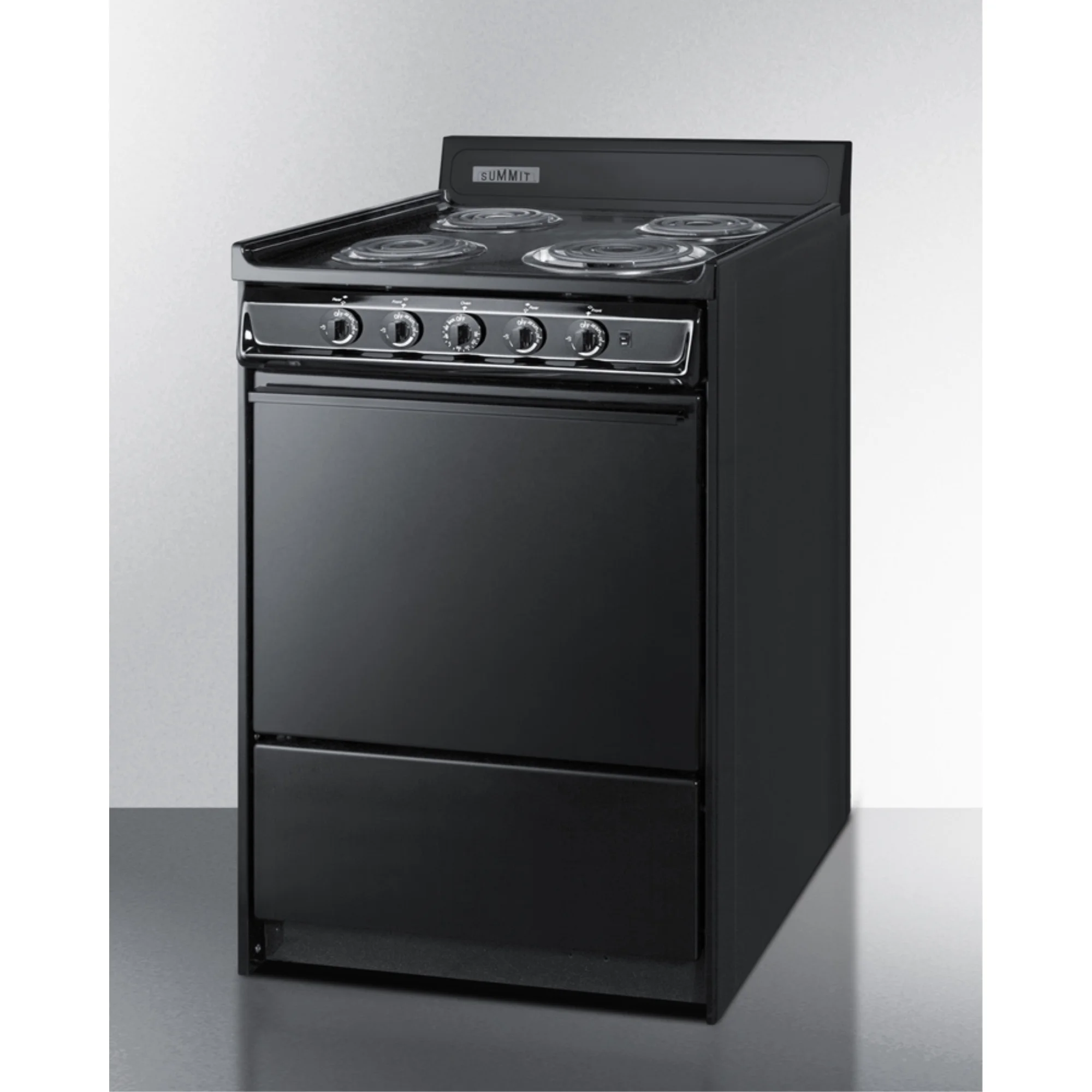 Summit Appliance offers a wide selection of American-made household ranges built for long-lasting durability in space-challenged kitchens. The TEM610C is an apartment-sized 220V electric range sized at just 24" wide, with a generous 2.92 cu.ft oven interior that can accommodate large trays. Two adjustable oven racks are included. The waist-high broiler is located inside the oven, allowing you to switch functions without moving contents to a separate compartment on the floor. The lower drop-down storage compartment is ideal for keeping pots and pans out of the way in small kitchens. Designed to meet the most current UL safety standards, this unit features one 8" 950W and three 6" 650W coil elements. These operate at lower wattage than standard electric ranges, allowing for a slow but steady heating process that will not cycle off. Upfront push-to-turn knobs offer additional protection, ensuring users won't reach over hot burners to adjust the heat. This unit complies with ADA guidelines.The TEM610C comes in a jet black finish to suit any kitchen setting. It has a recessed oven door and is conveniently sized at just 24" deep for a better fit in galley in L-shaped kitchens, where every inch counts. Porcelain and steel construction help the unit hold up to years of daily use. We include an anti-tip bracket for added safety. This unit does not include a line cord (a standard 40 amp 3 or 4-prong cord can be installed by your electrician). With its classic style and quality construction, Summit's made in the USA cooking line offers reliable cooking for smaller homes. Additional choices are available in 20", 30", and 36" wide fits.