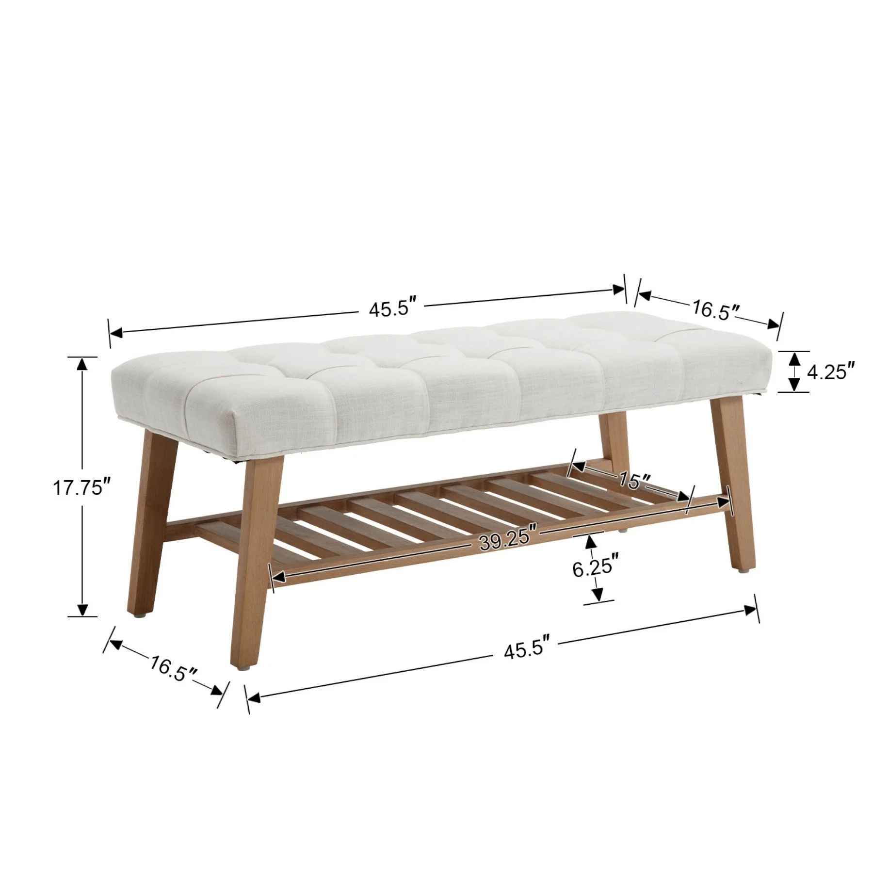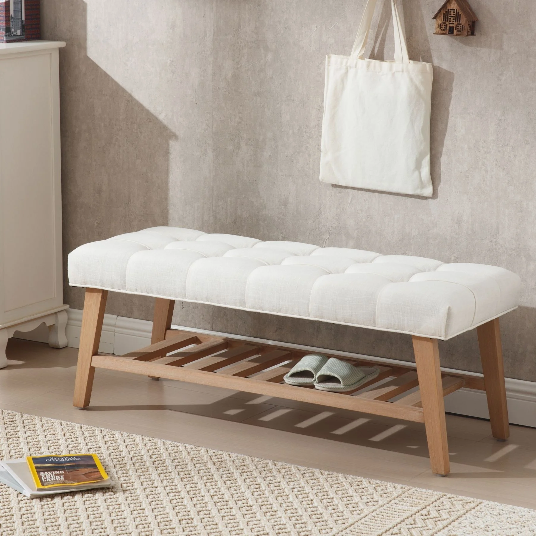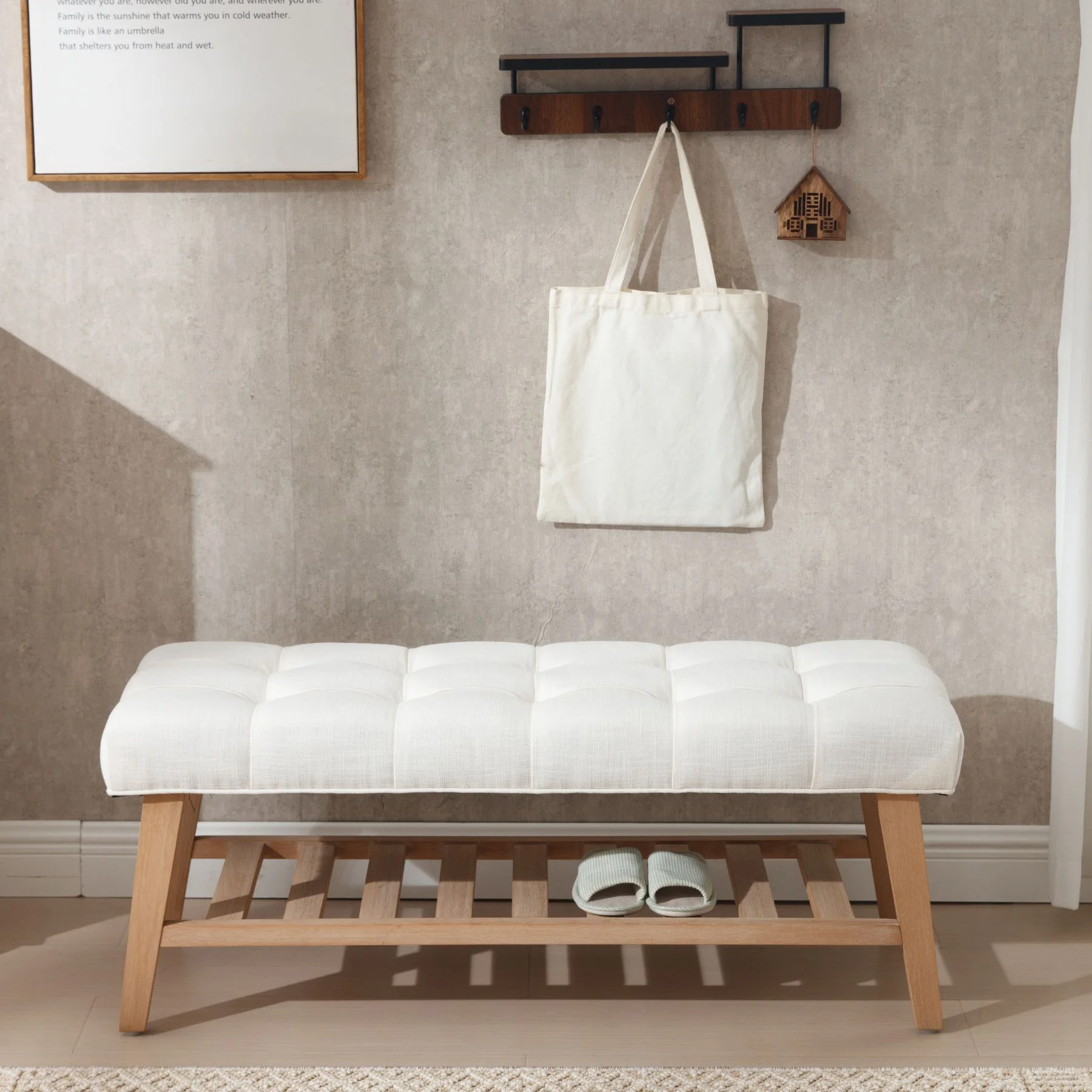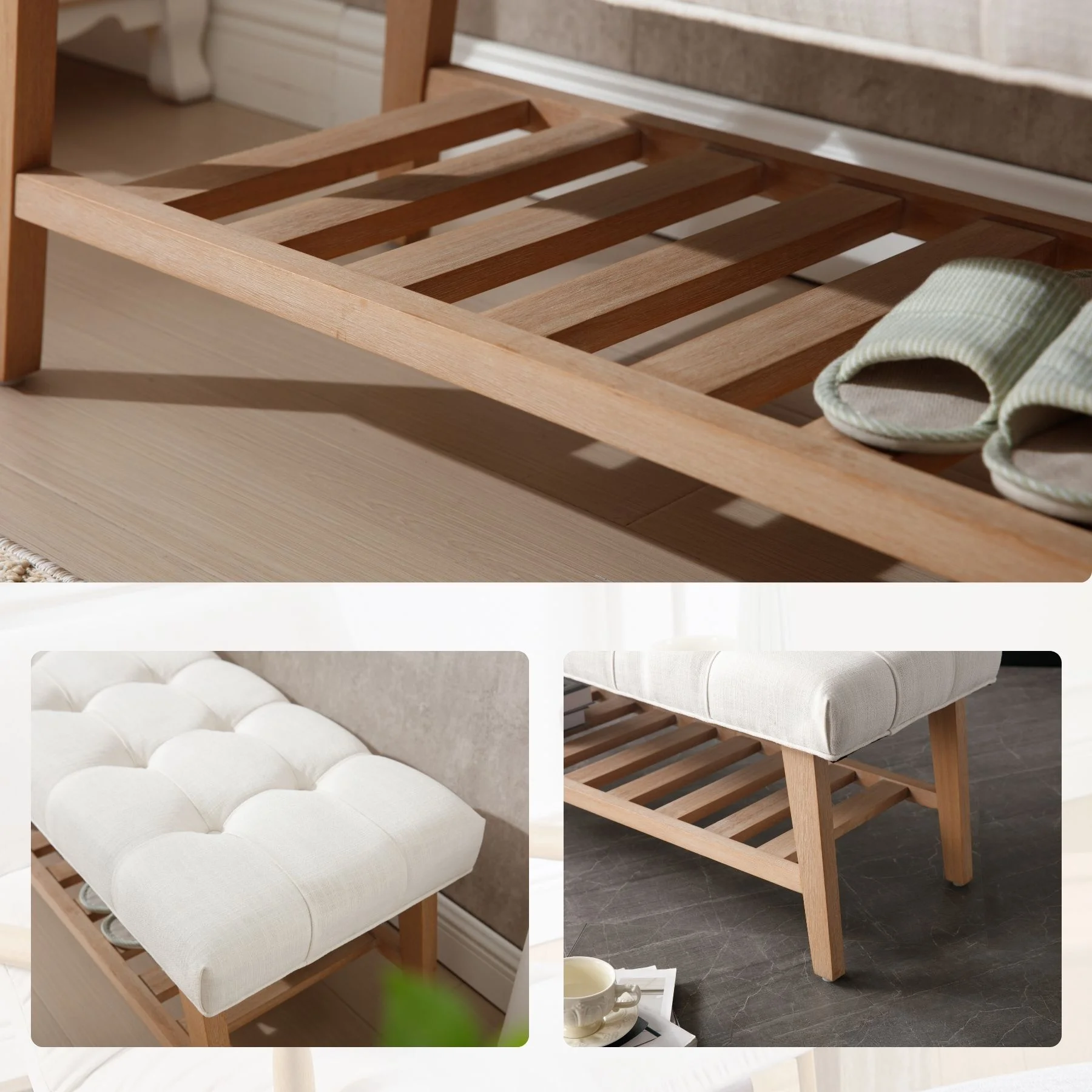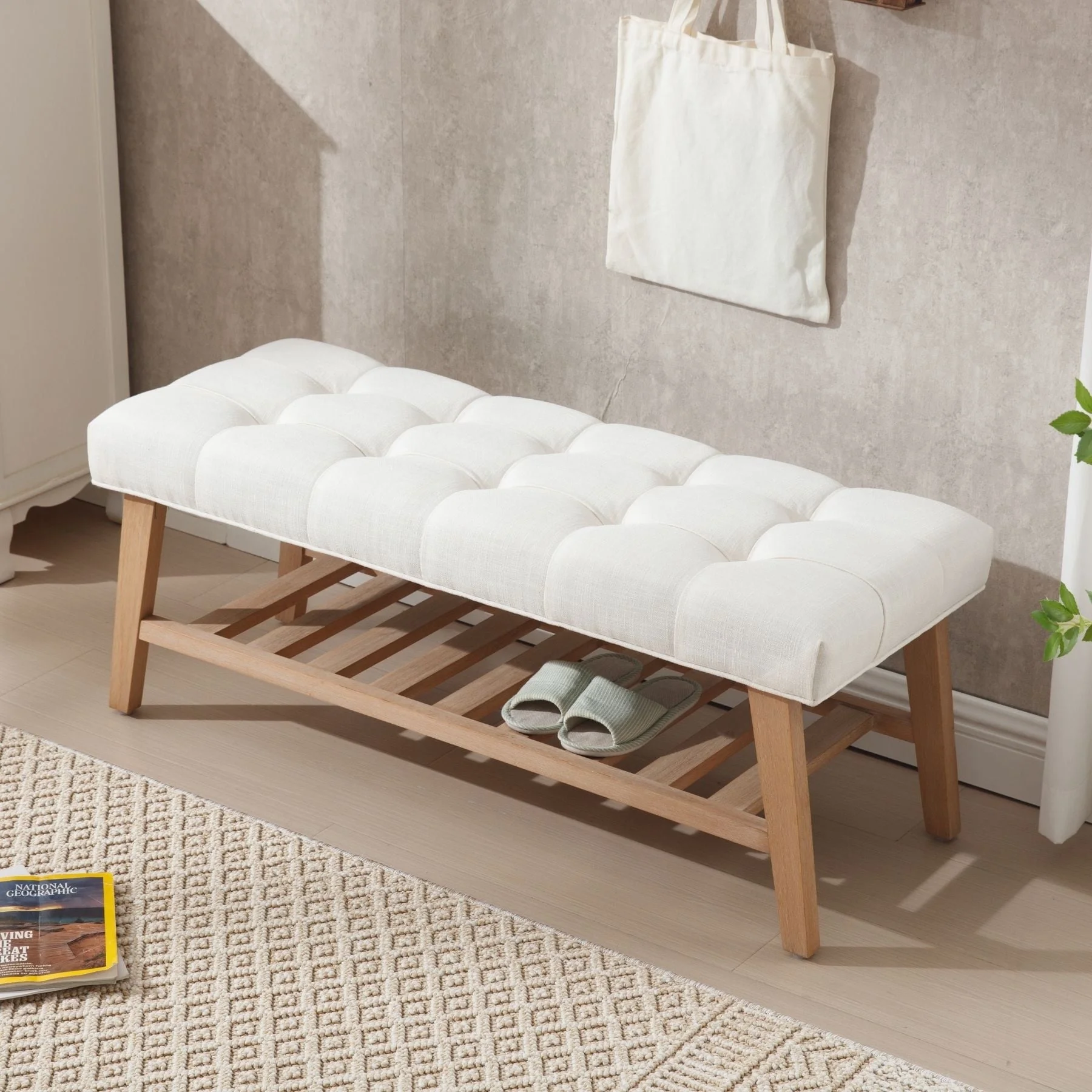 - Dual-Purpose Design:Combines a tufted linen seat (4.25" thick cushion) with open wooden shelf for shoes/baskets (holds 6-8 pairs)