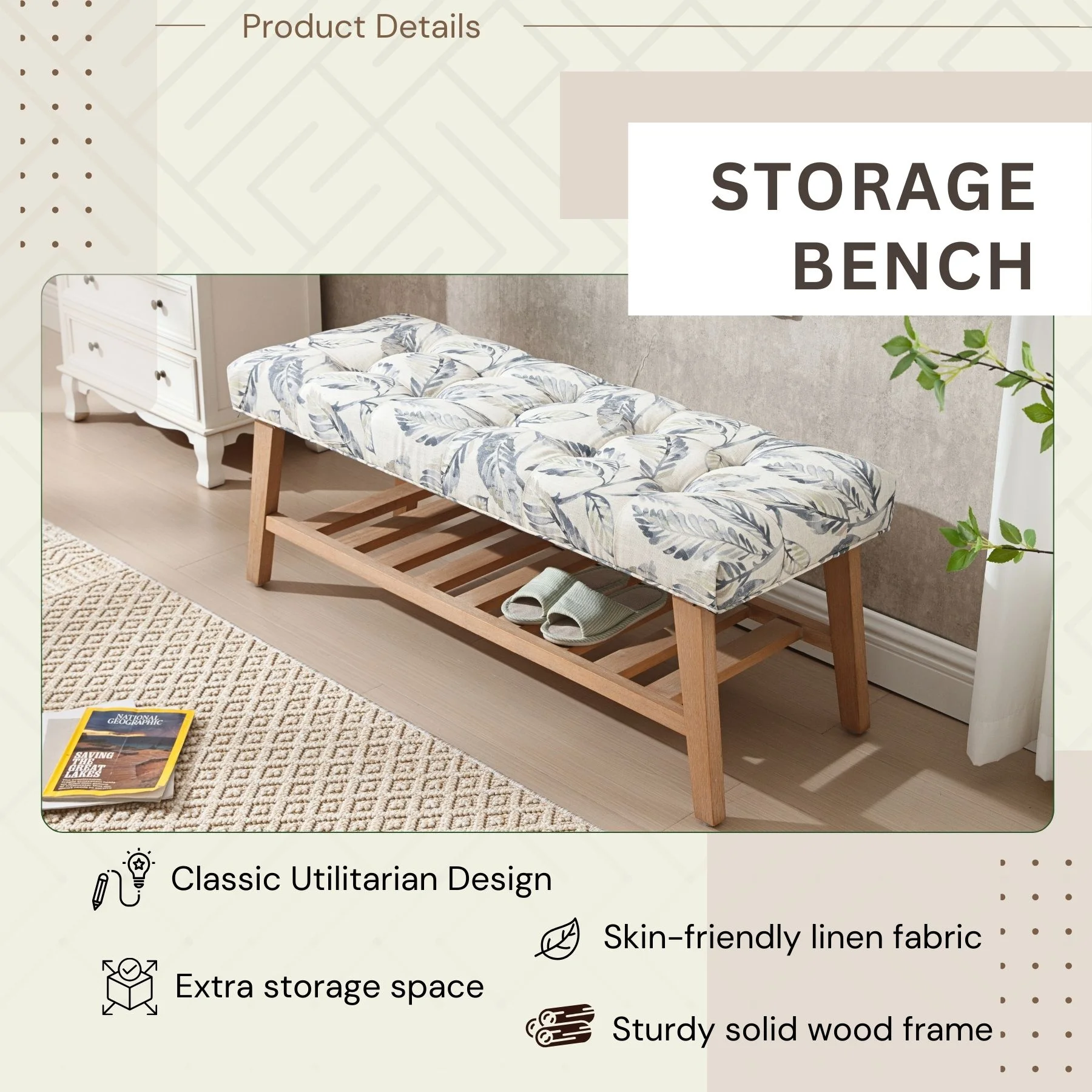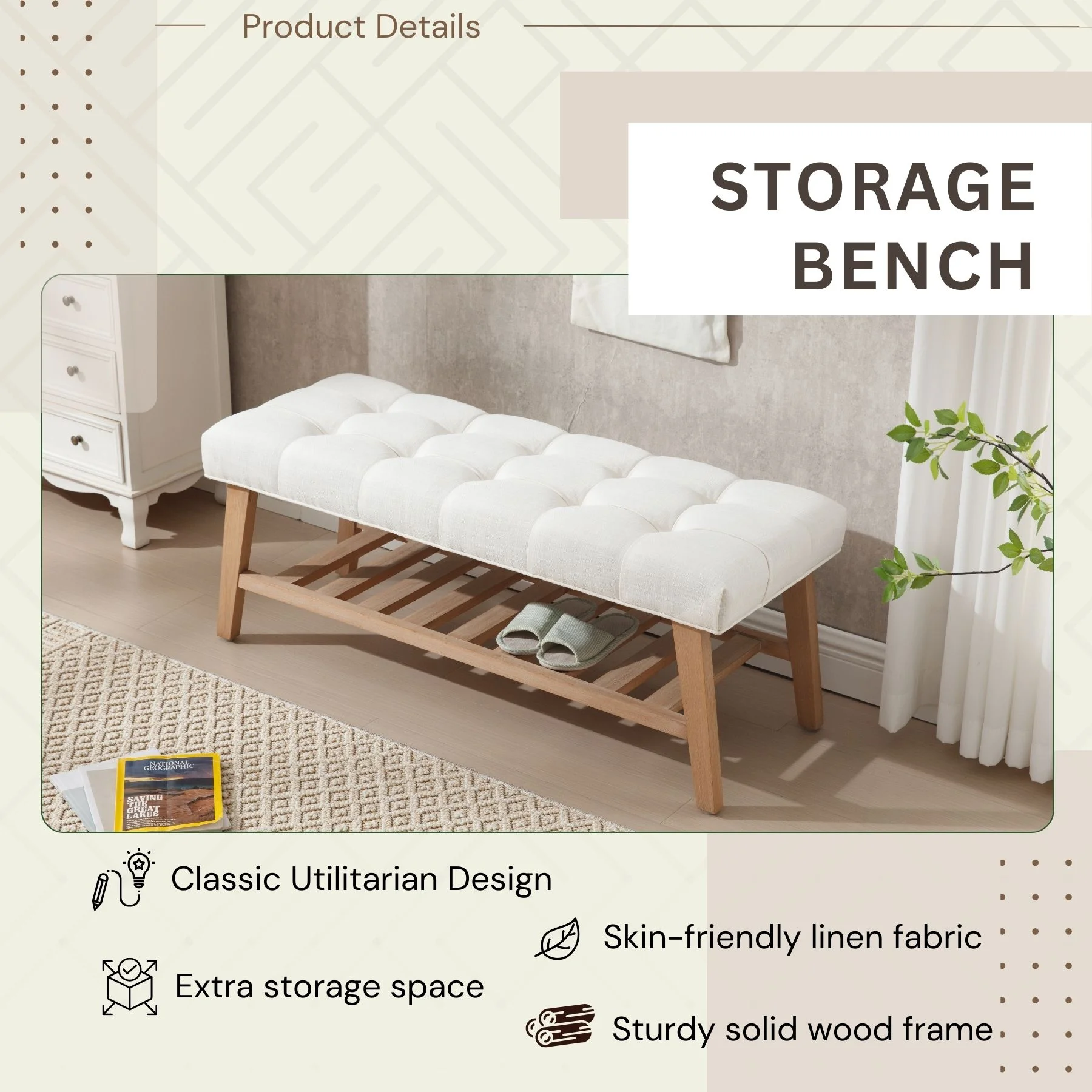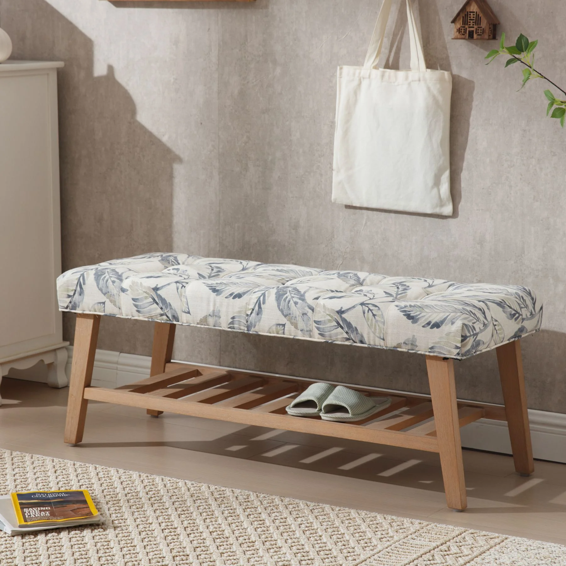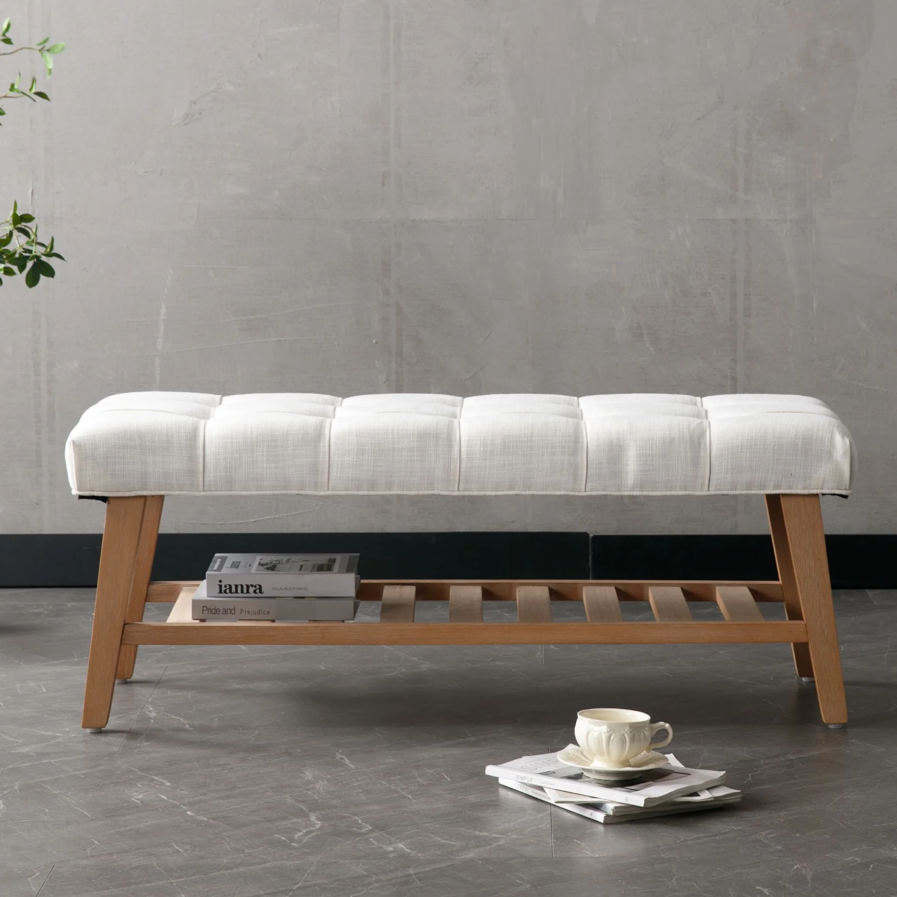 - Dual-Purpose Design:Combines a tufted linen seat (4.25" thick cushion) with open wooden shelf for shoes/baskets (holds 6-8 pairs)