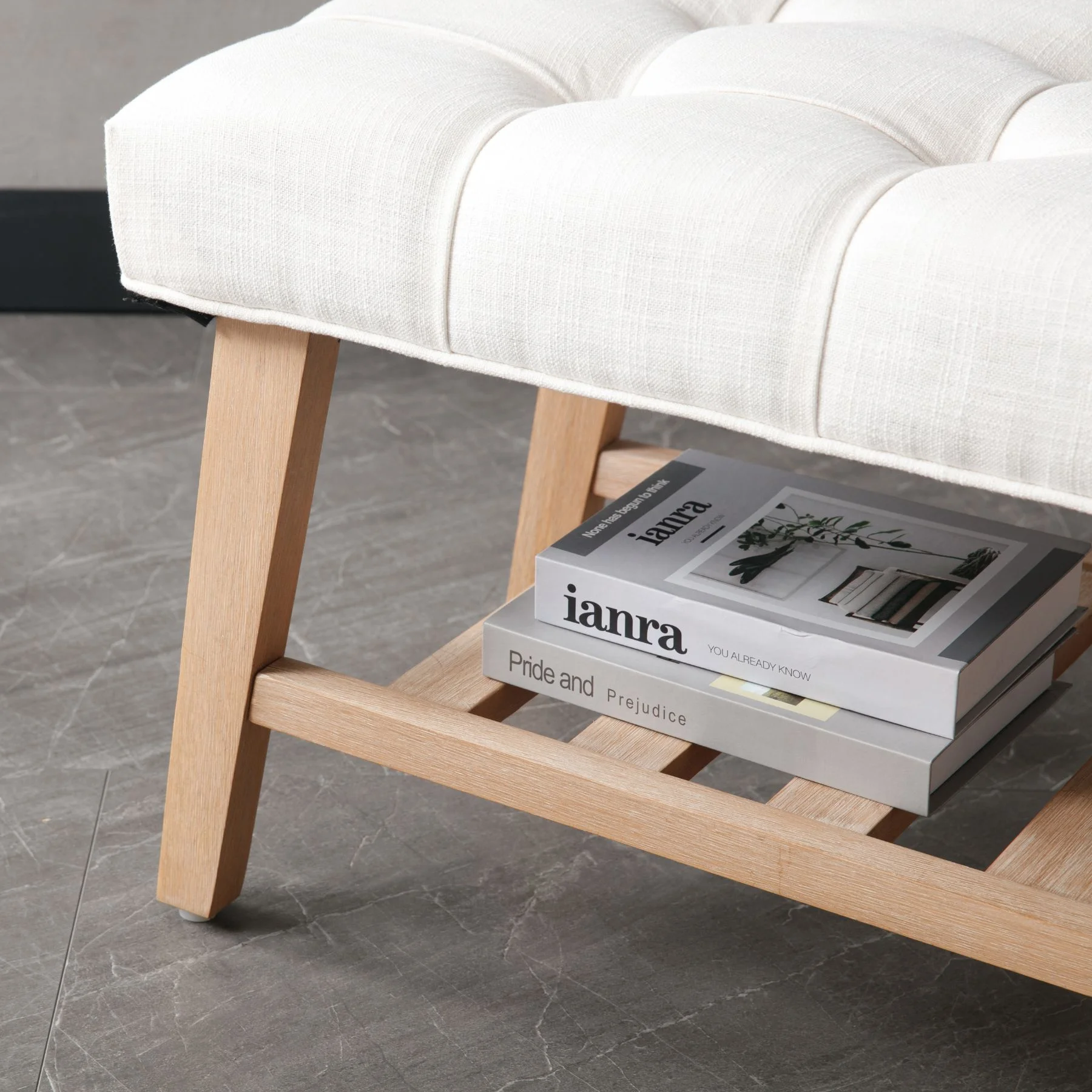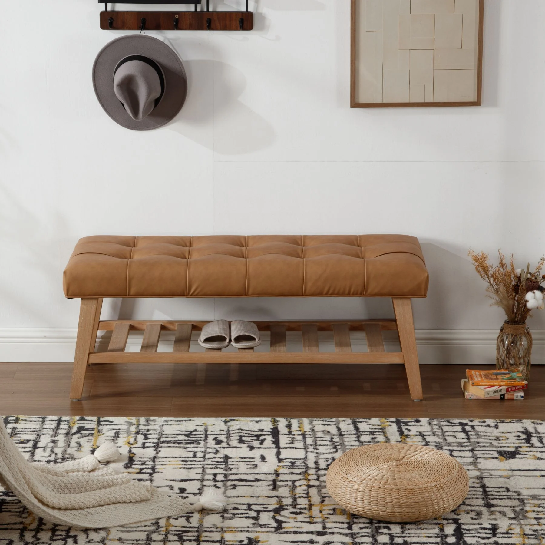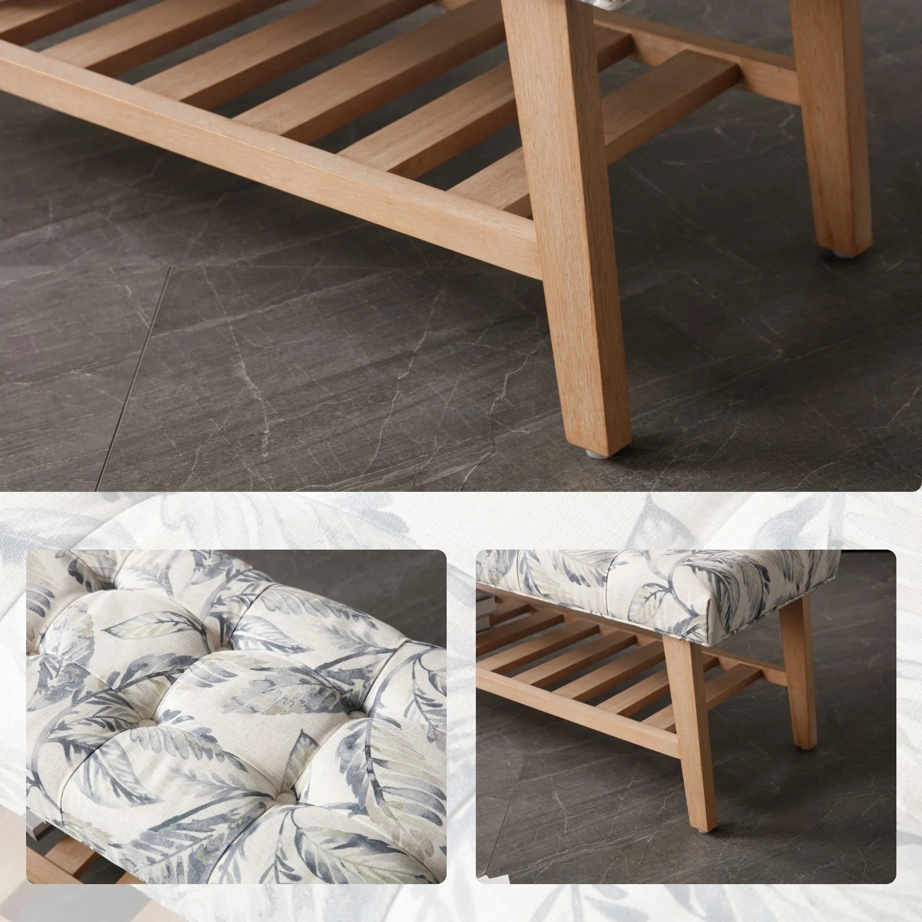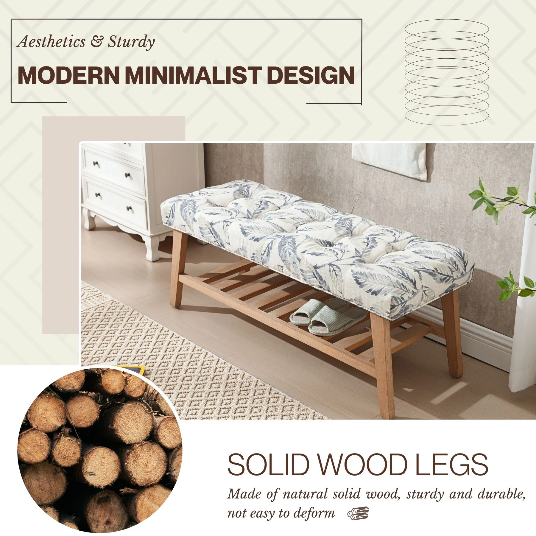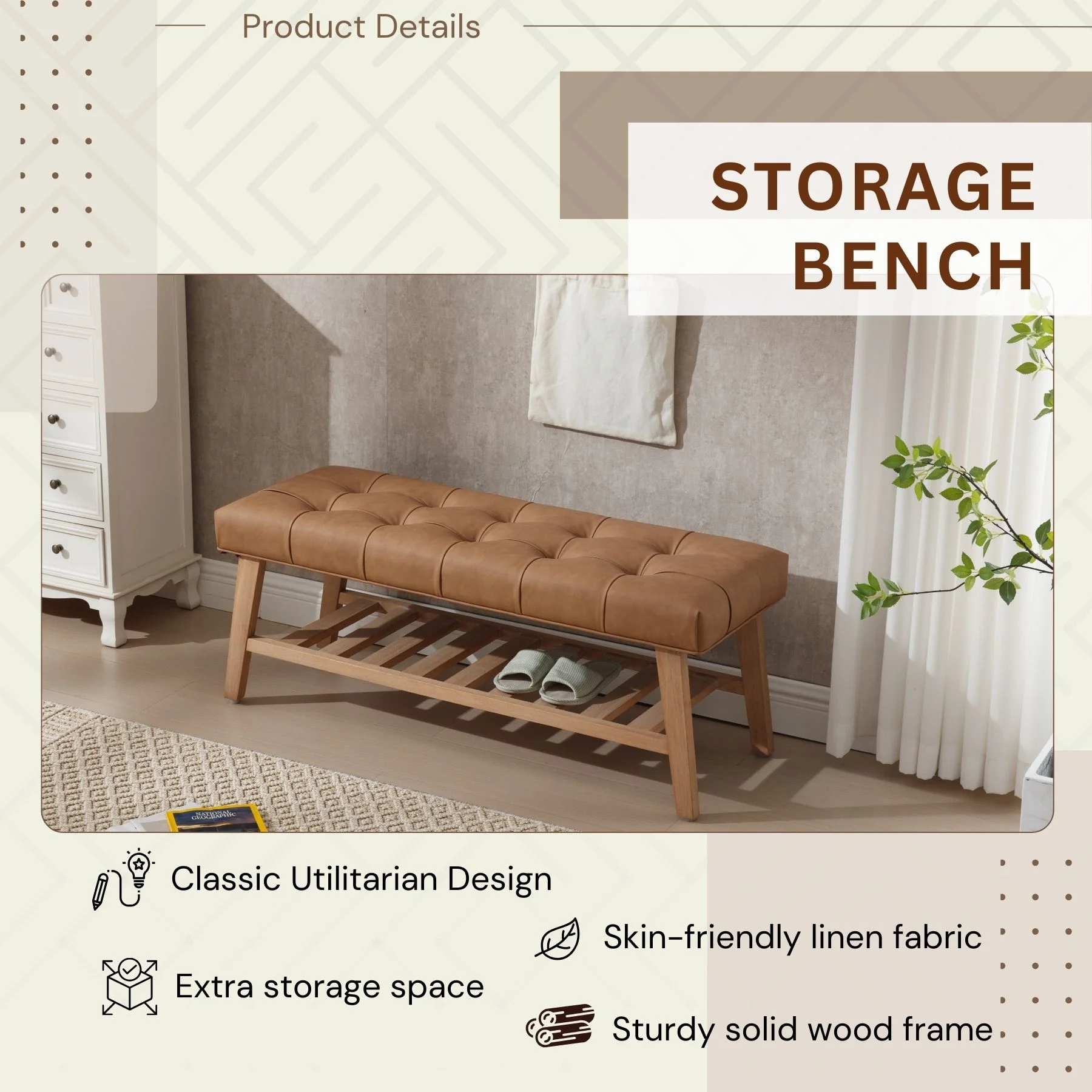 - Dual-Purpose Design:Combines a tufted linen seat (4.25" thick cushion) with open wooden shelf for shoes/baskets (holds 6-8 pairs)
