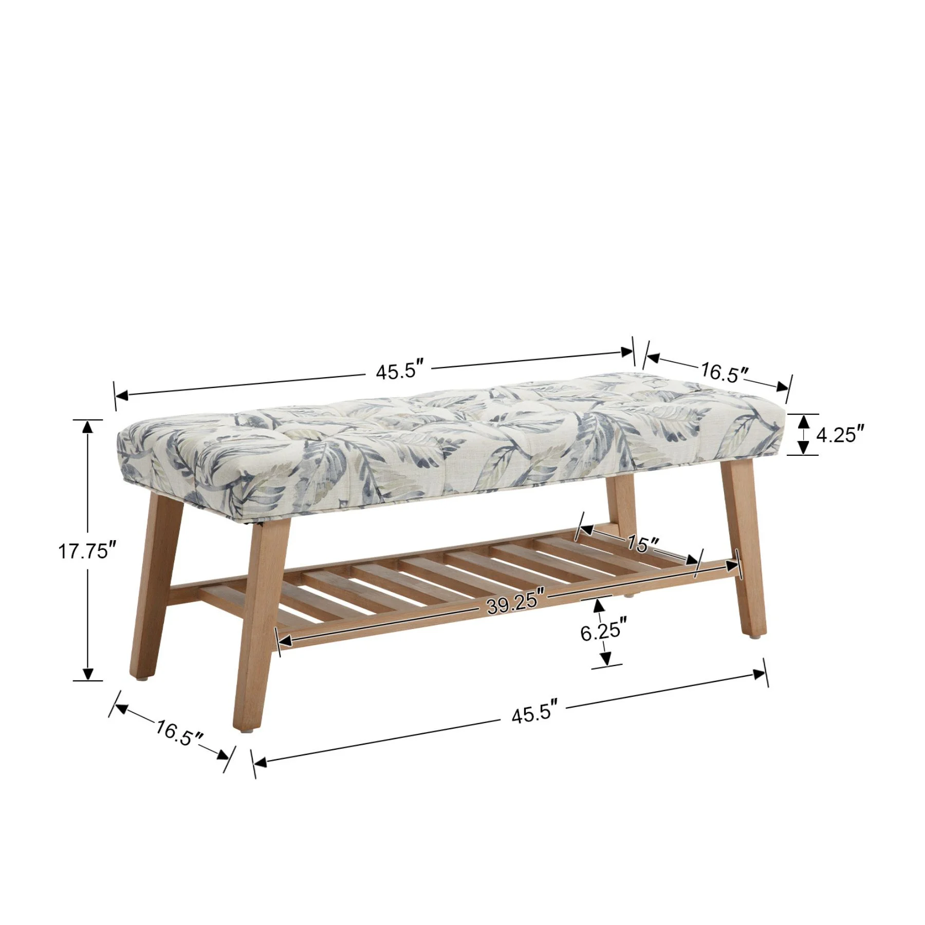 - Overall: 45.5"W x 16.5"D x 17.5"H Shelf: 39"W x 15"D Materials: Solid wood frame + Linen upholstery