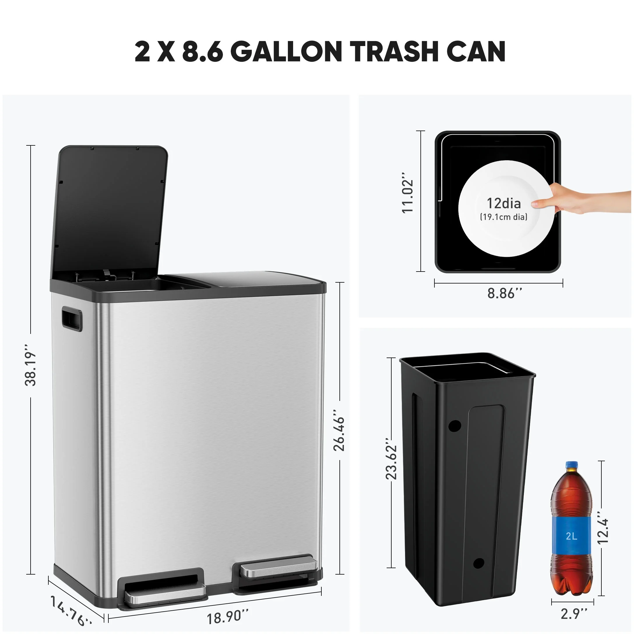 - ��60L/16 Gallon Capacity��With a substantial 16-gallon capacity, this trash can effortlessly accommodates your daily waste disposal requirements. The inclusion of 2 removable buckets adds a convenient touch, facilitating easy loading and disposal of trash for a seamless waste management experience.