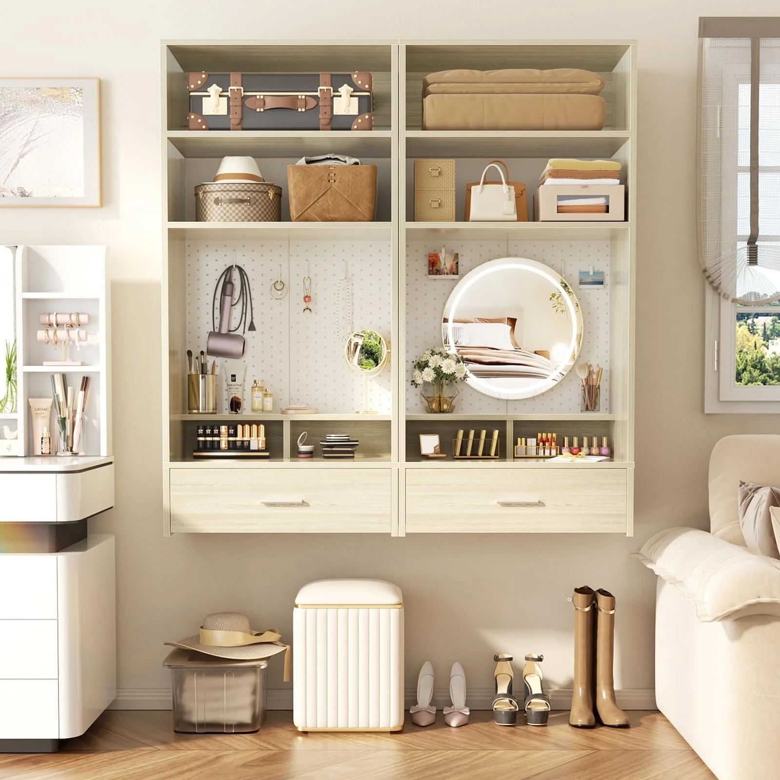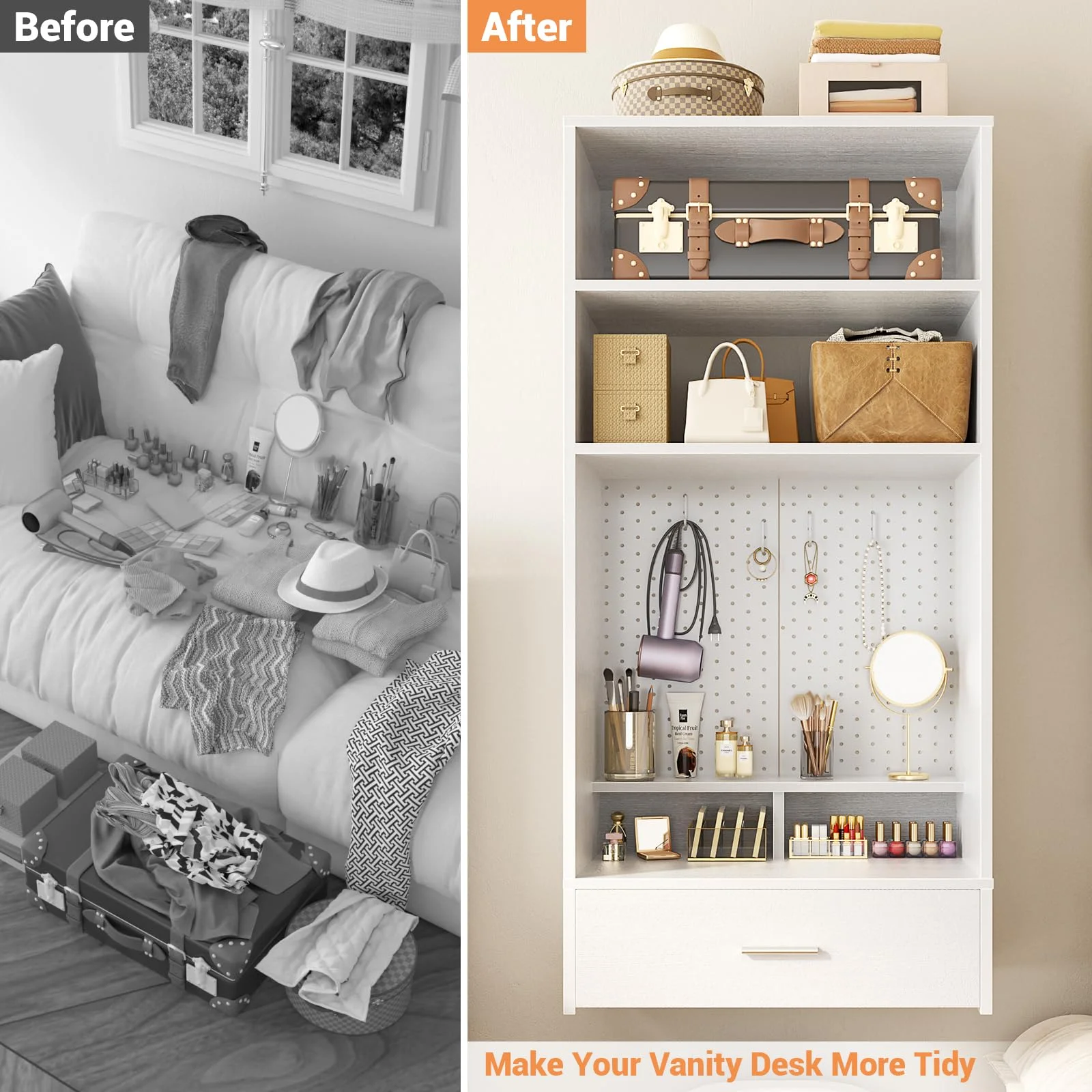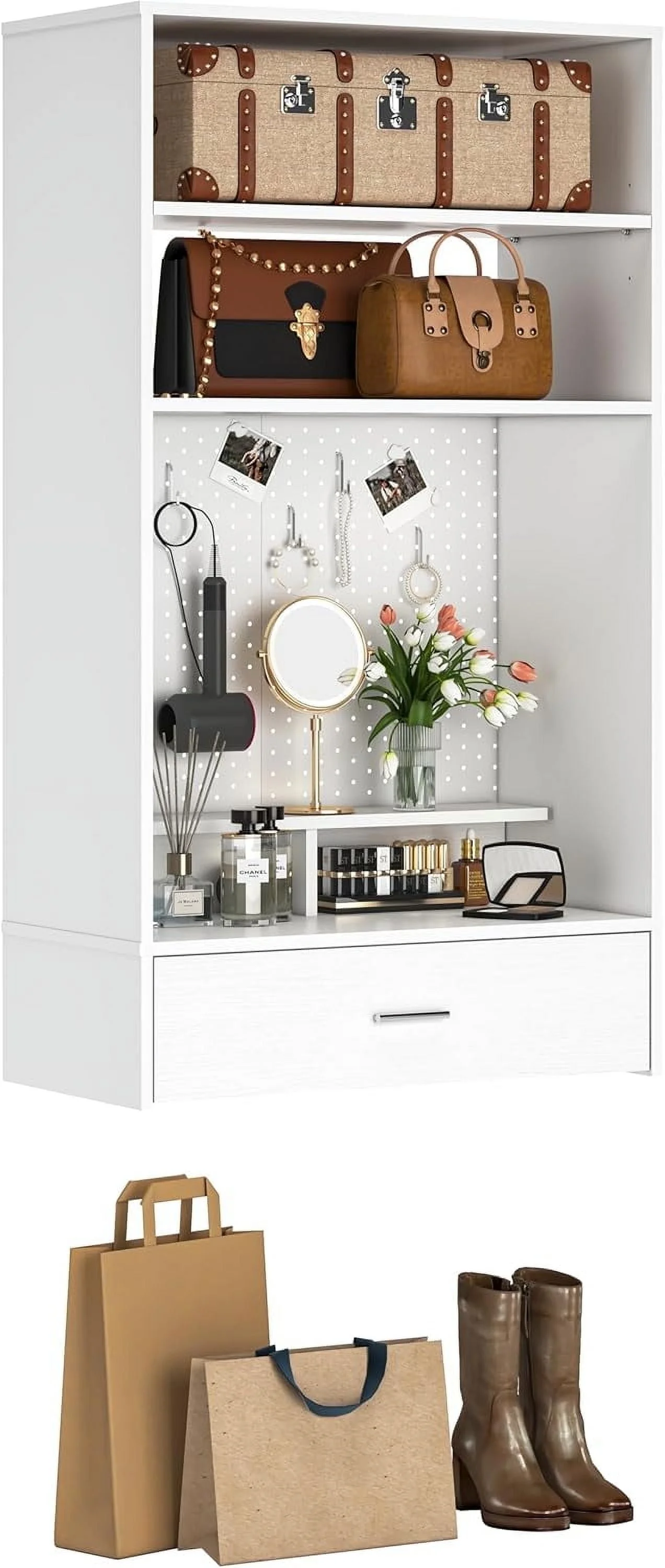 - Ample Storage with Multi-Tier Shelving & Concealed Drawer: Five adjustable shelves (weight-rated for stability) provide open storage for folded clothes, shoes, books, or decorative baskets. The smooth-gliding drawer hides personal items like cosmetics, socks, or documents. Durable construction supports everyday use while maintaining a clean, organized look.