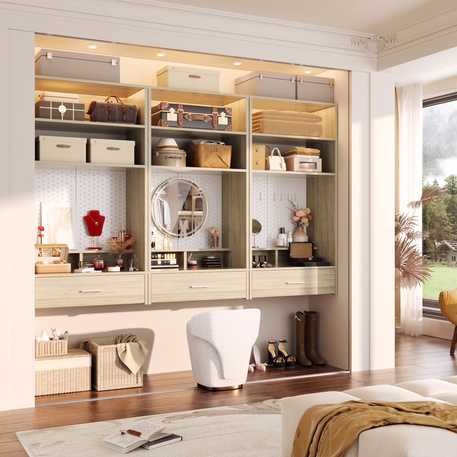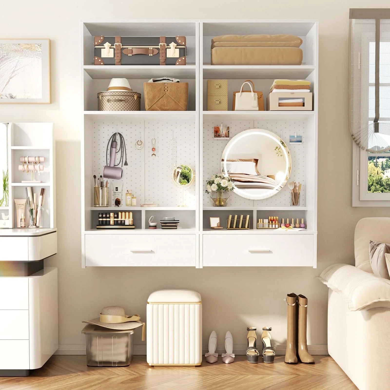 - Space-Saving Wall-Mounted Design: At just 25 inches wide, this compact system maximizes vertical space, ideal for small rooms, apartments, or tight areas like bathrooms and entryways. Wall mounting keeps floors clutter-free, enhances room airflow, and creates a modern, open aesthetic. Perfect for renters or homeowners seeking functional, space-efficient storage.