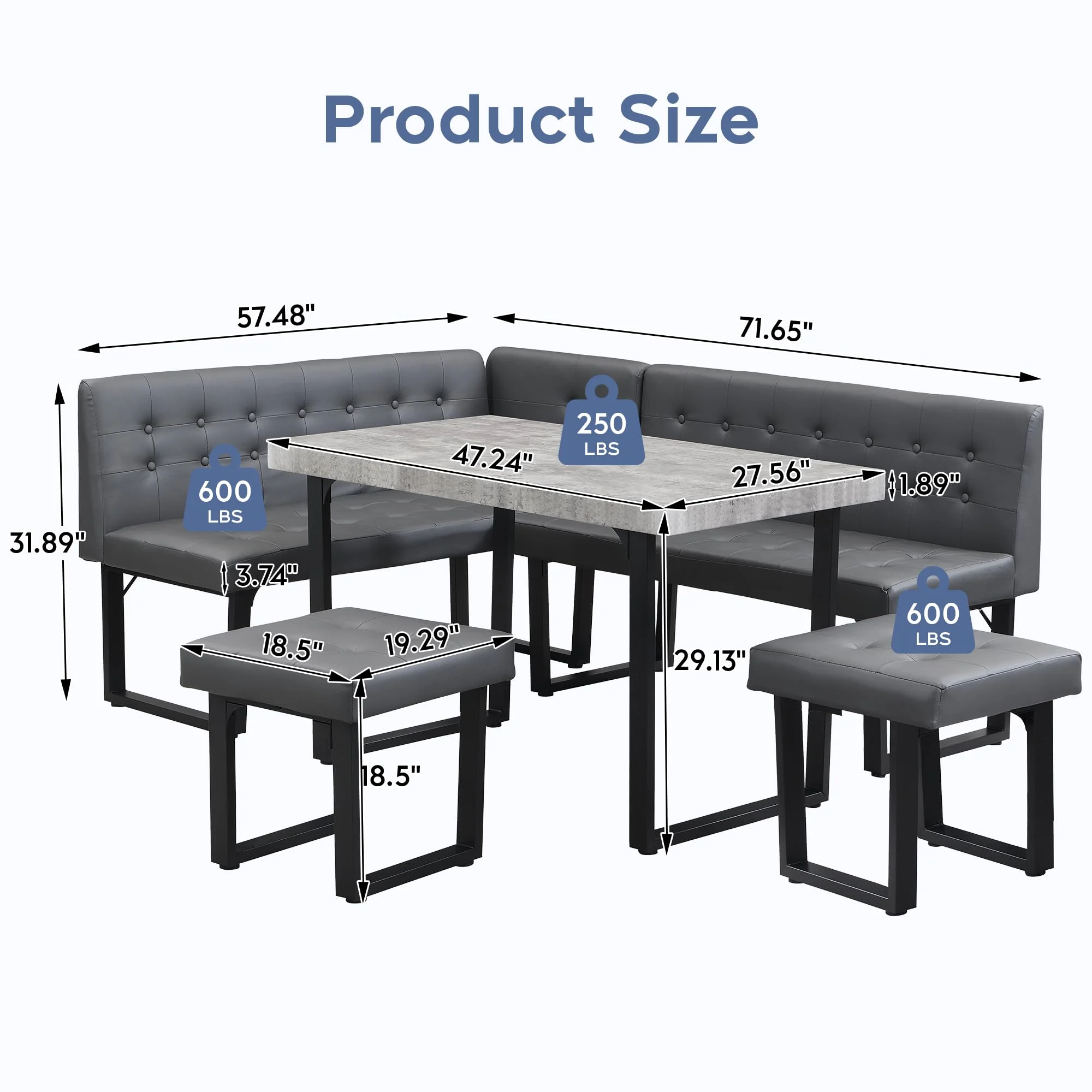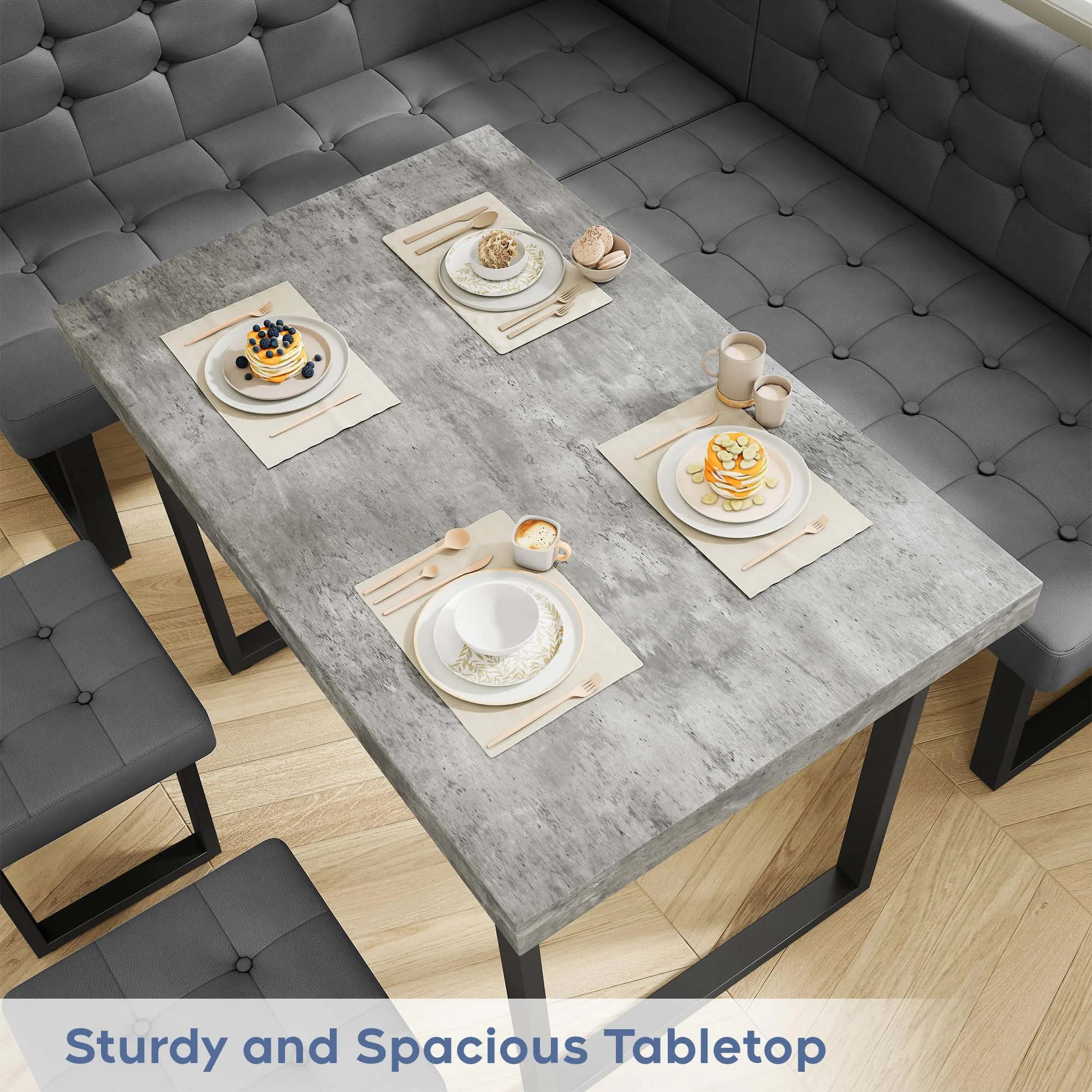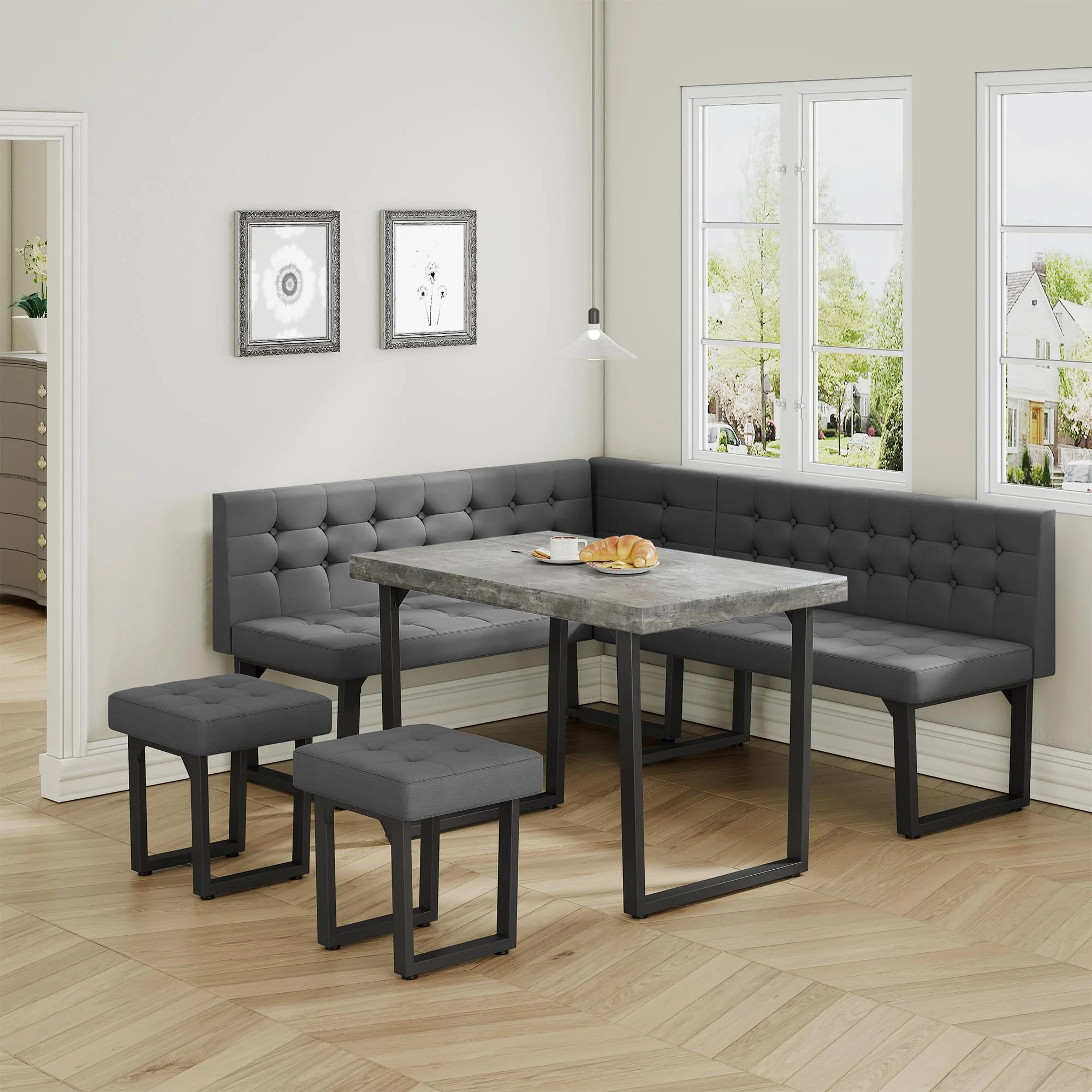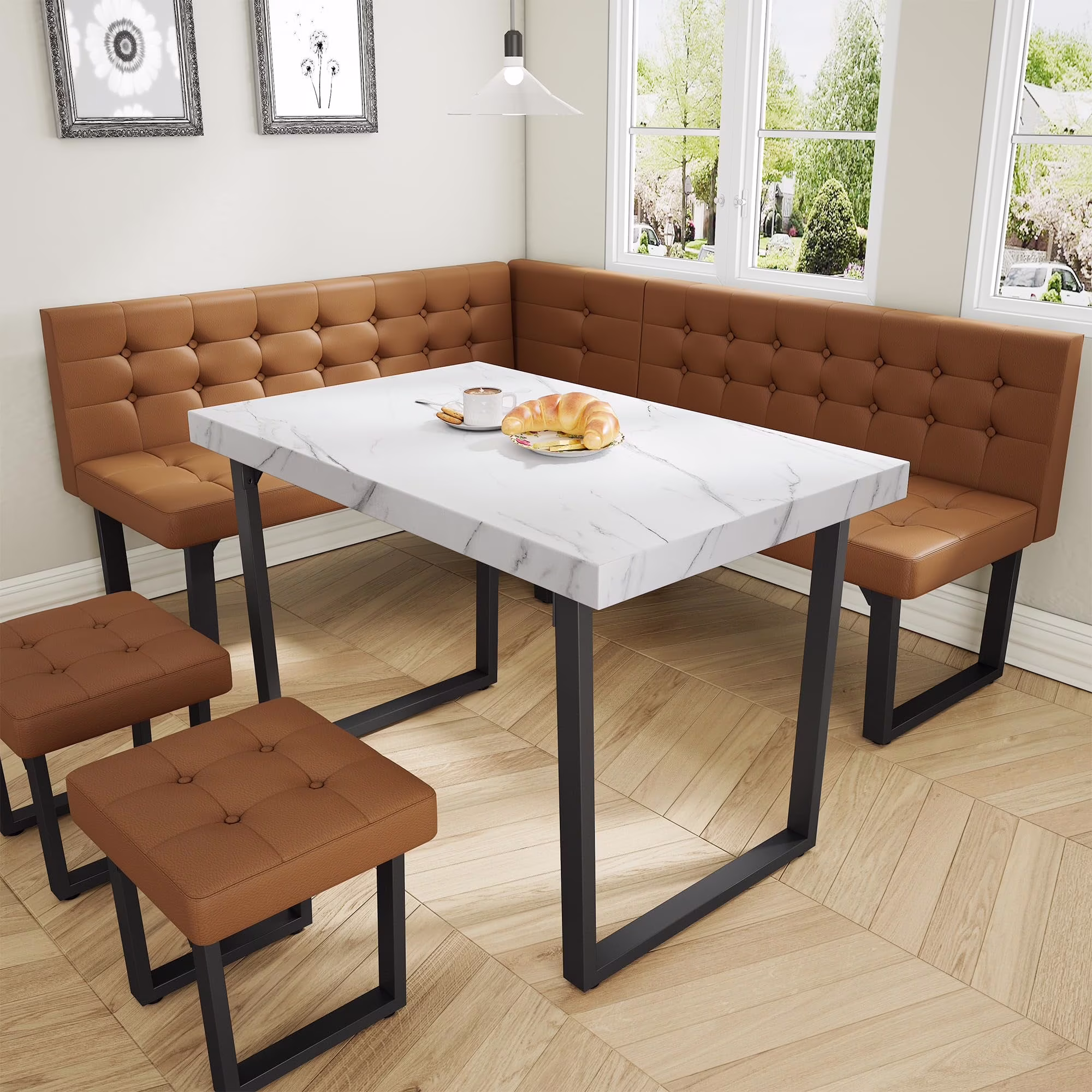 - [Durable and Sturdy] Crafted from , this corner dining table set is built to last. The wide U-shaped metal legs offer strong support, ensuring stability and durability over time��no more worrying about wobbling like with wooden-legged tables. With a surface area of 47.2" x 27.5", it comfortably seats 4-6 people for meals, games, or casual gatherings.