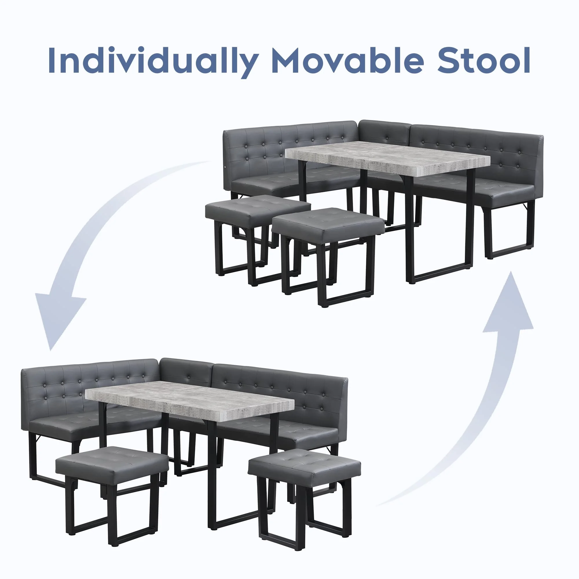 - [5 Piece Corner Dining Table Set Design] This corner dining table set includes 1 table, 2 banquette seating and 2 ottomans. The 2 removable stools are perfect for your kitchen or dining area and can be easily slid under the table when not in use, or placed wherever you need them. It provides a spacious and comfortable dining environment for family or friends.