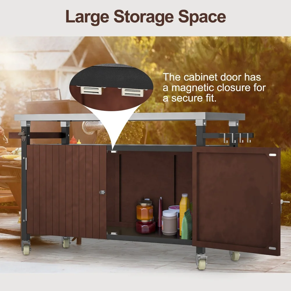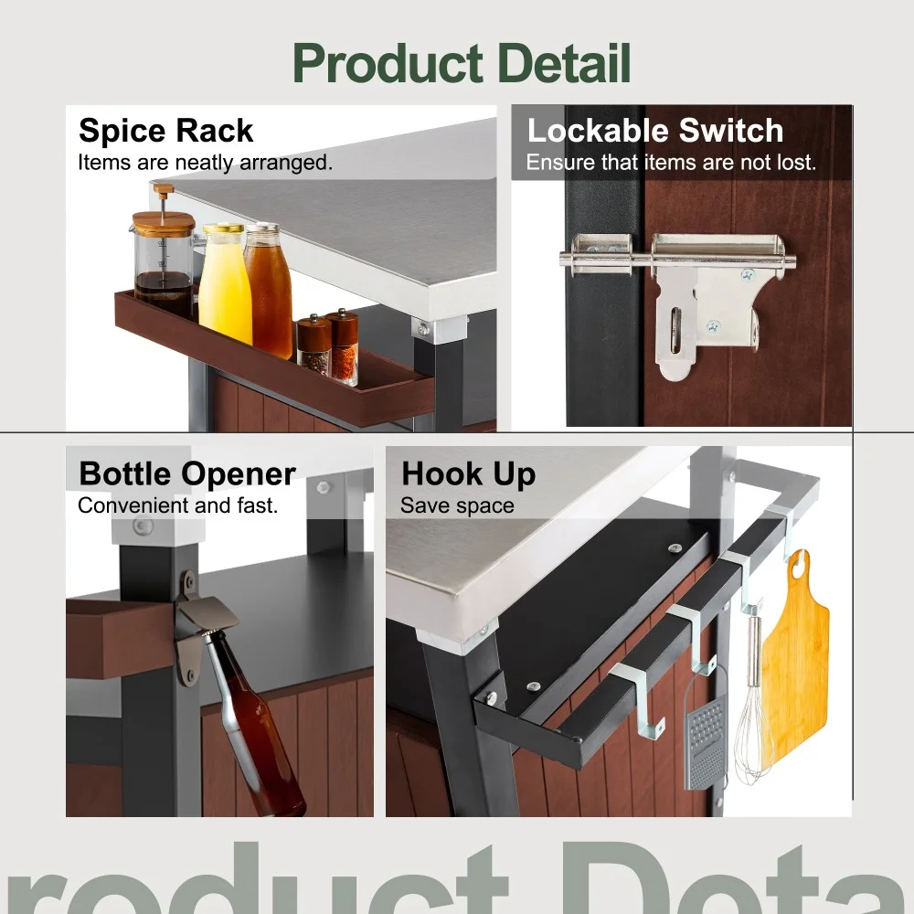 - ��Superior Construction�� Crafted with a robust metal frame and a sleek stainless steel top, this outdoor prep table is designed for both durability and ease of maintenance. It includes 4 handy S-shaped hooks, spacious racks for spices and towels, a designated gas line hole, and built-in bottle openers, ensuring you have everything you need for efficient food prep during your party carnivals.