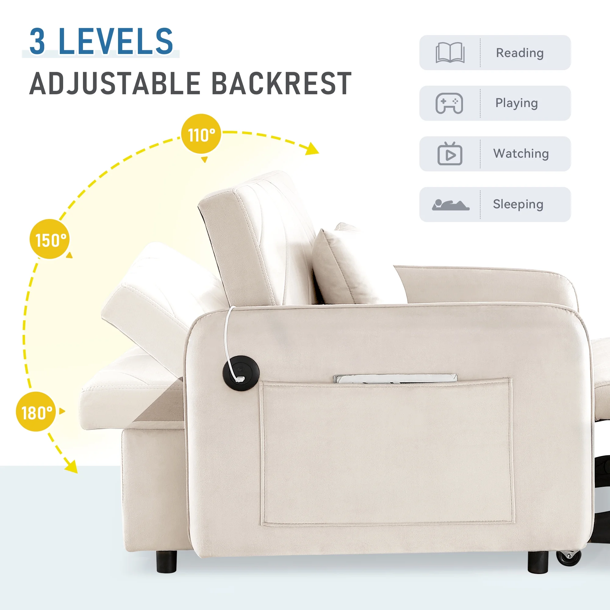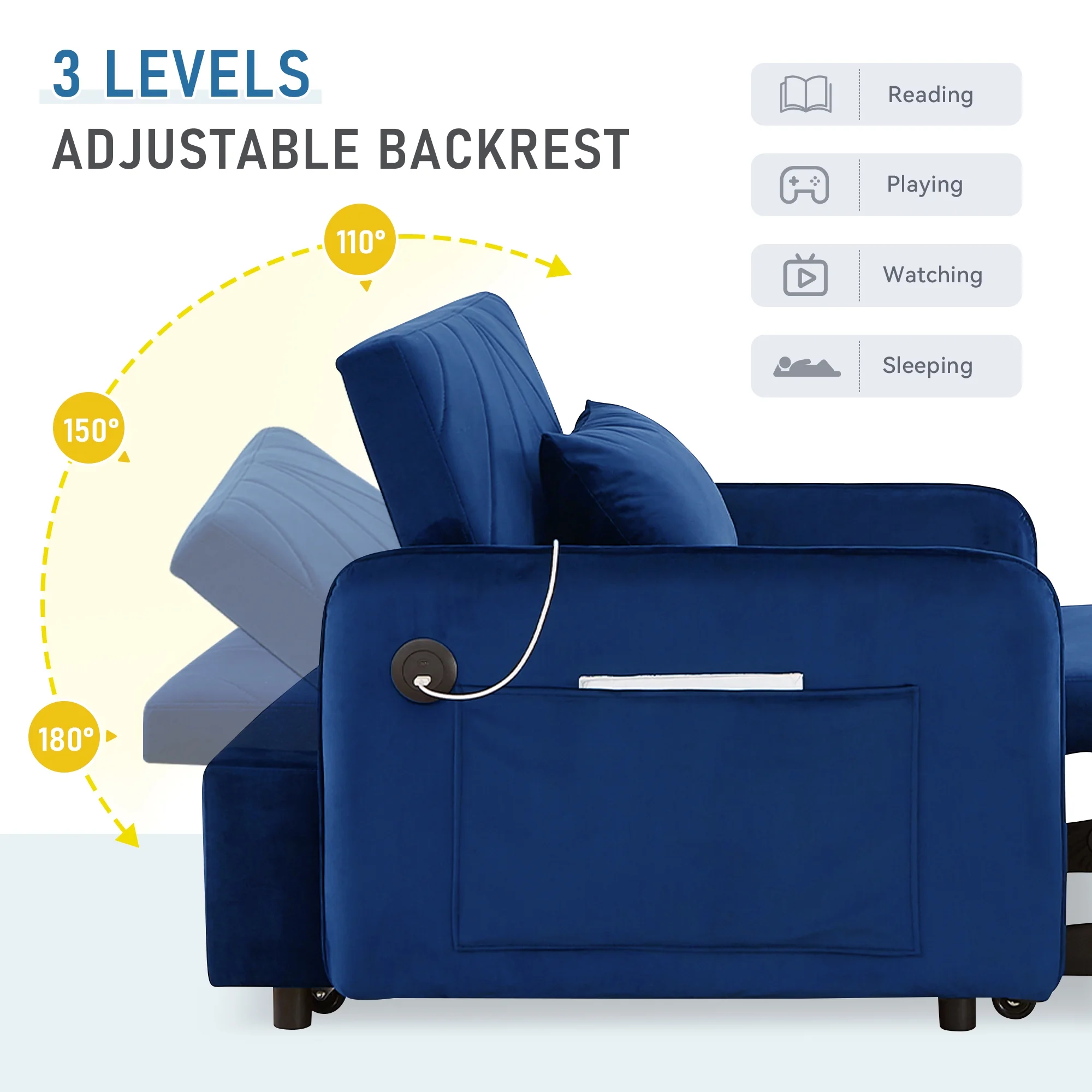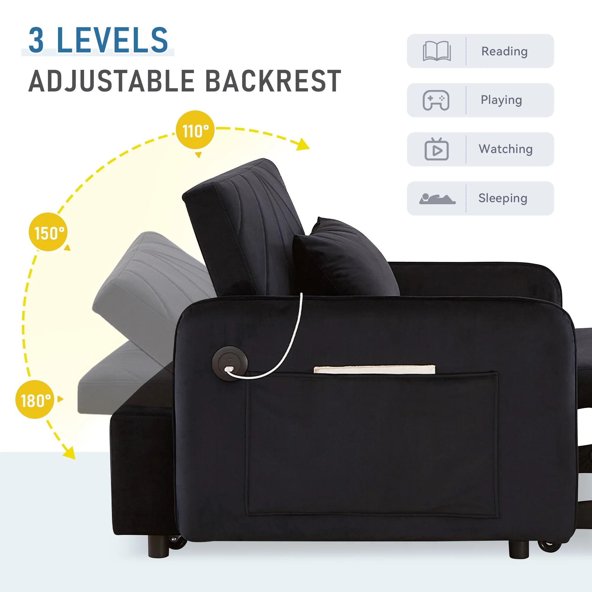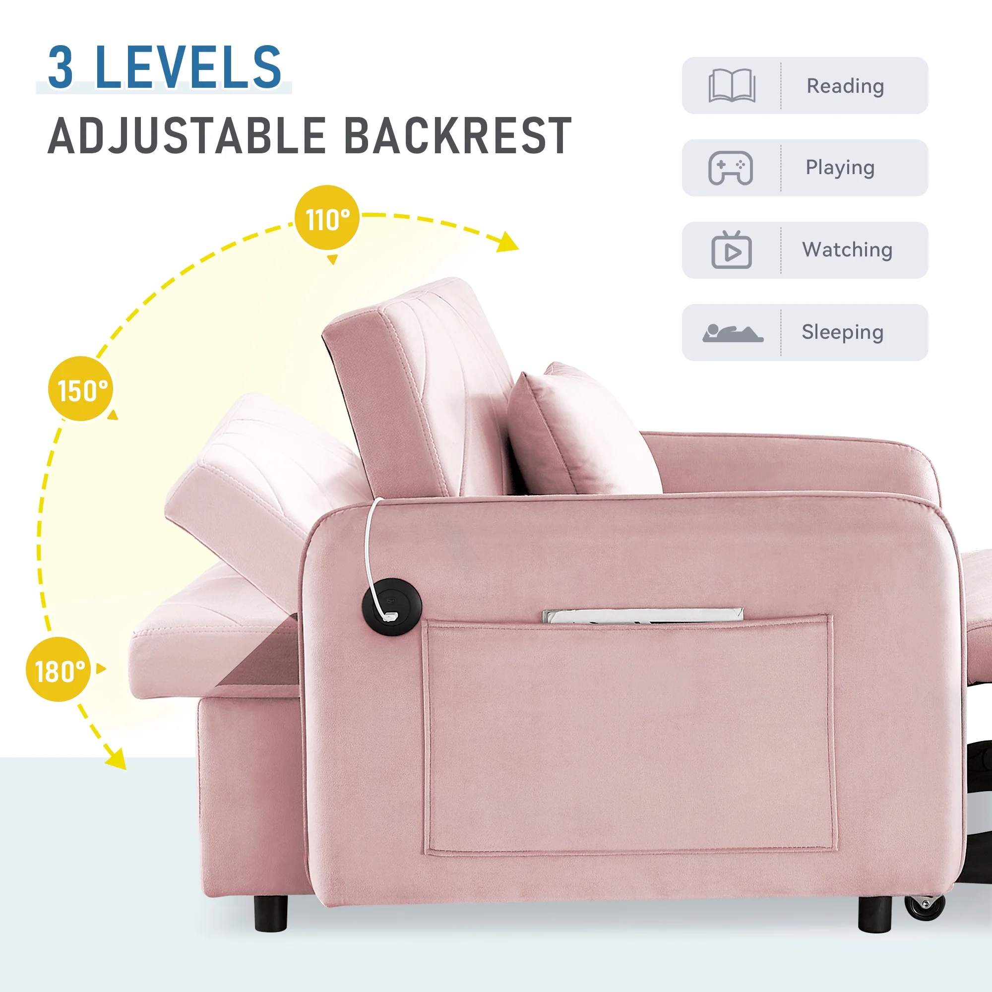 Embrace the essence of modern minimalism with our convertible sofa bed, designed to seamlessly integrate into any small space while offering maximum comfort and versatility. This sofa chair bed transitions effortlessly from a sofa chair to a chaise lounger and to a bed, catering to a variety of relaxation needs. The adjustable backrest, with settings at 110�� for cozy reading time, 150�� for a relaxed movie time, and 180�� for a nap or sleeping time, ensures personalized comfort. Wrapped in a soft velvet fabric and supported by high-rebound foam, it provides a soft and supportive surface for entertainment or rest. Our single sofa bed's understated, contemporary design speaks volumes without overwhelming, making it the perfect addition to any living space that values both style and practicality.