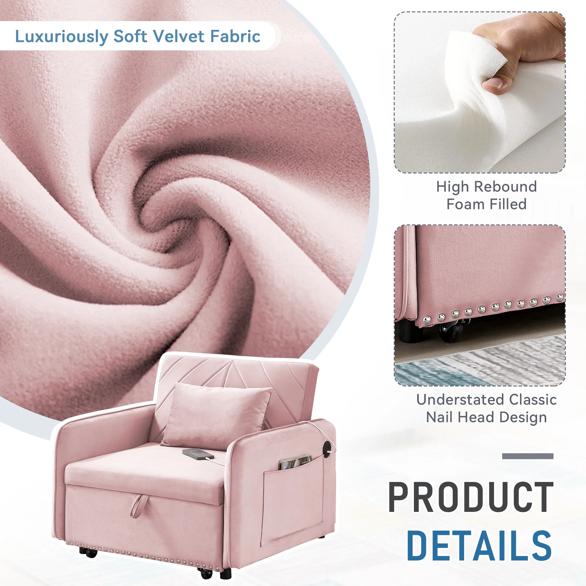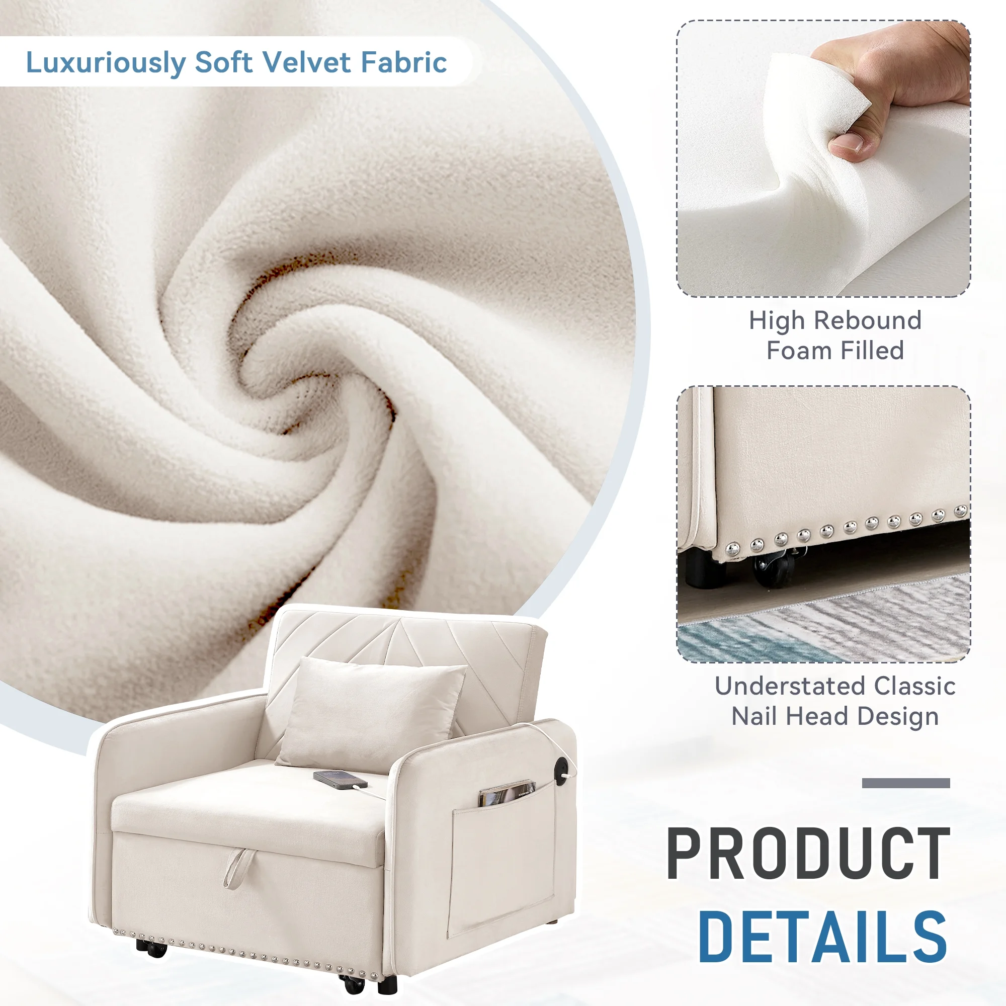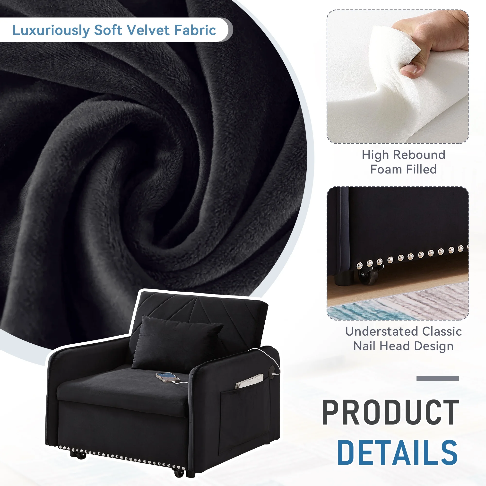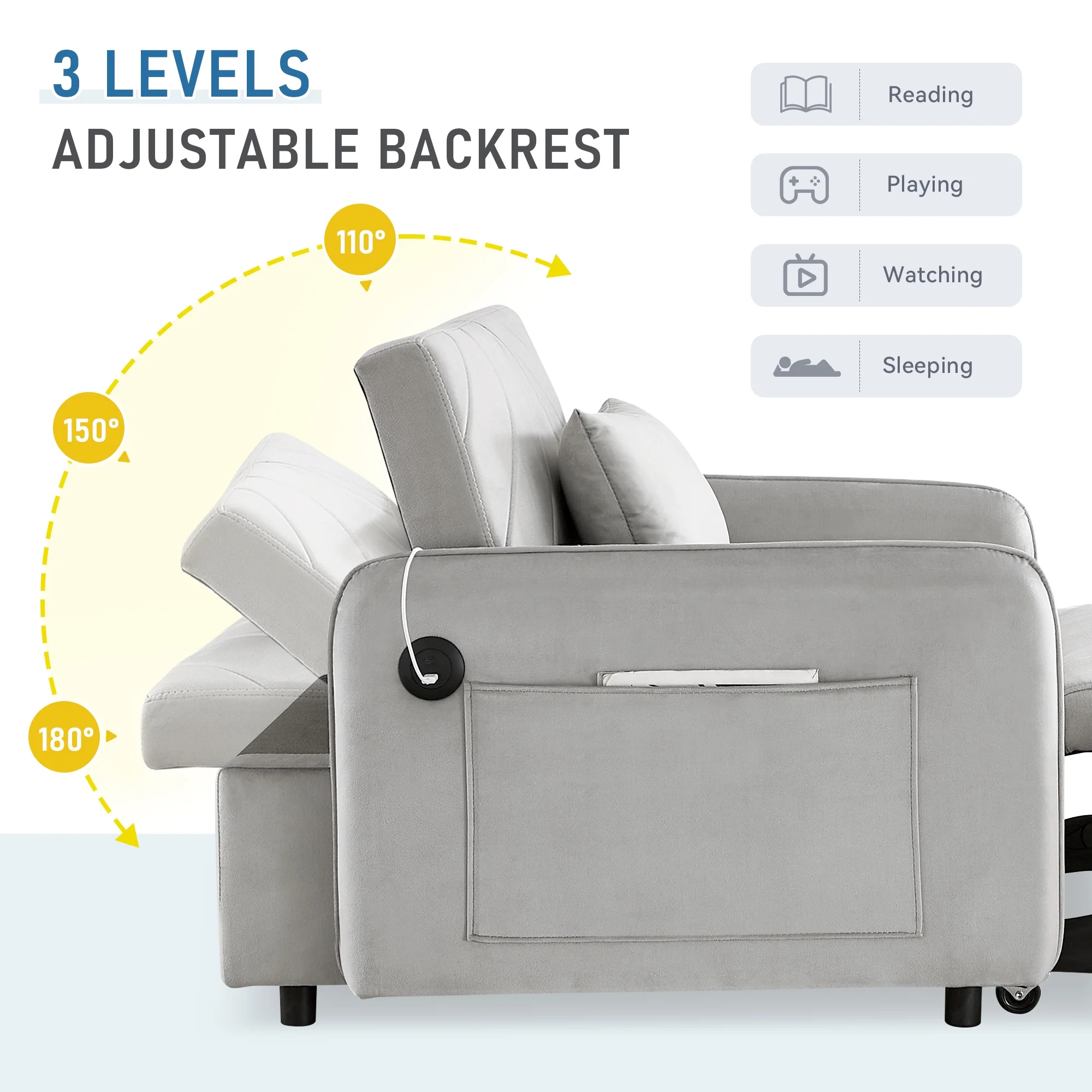 Embrace the essence of modern minimalism with our convertible sofa bed, designed to seamlessly integrate into any small space while offering maximum comfort and versatility. This sofa chair bed transitions effortlessly from a sofa chair to a chaise lounger and to a bed, catering to a variety of relaxation needs. The adjustable backrest, with settings at 110�� for cozy reading time, 150�� for a relaxed movie time, and 180�� for a nap or sleeping time, ensures personalized comfort. Wrapped in a soft velvet fabric and supported by high-rebound foam, it provides a soft and supportive surface for entertainment or rest. Our single sofa bed's understated, contemporary design speaks volumes without overwhelming, making it the perfect addition to any living space that values both style and practicality.