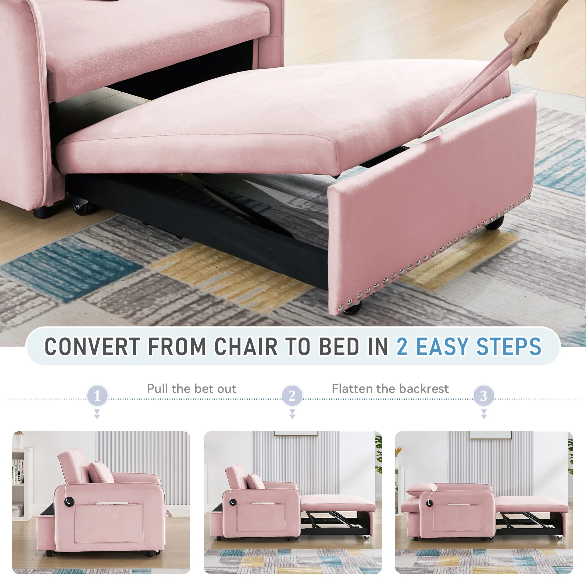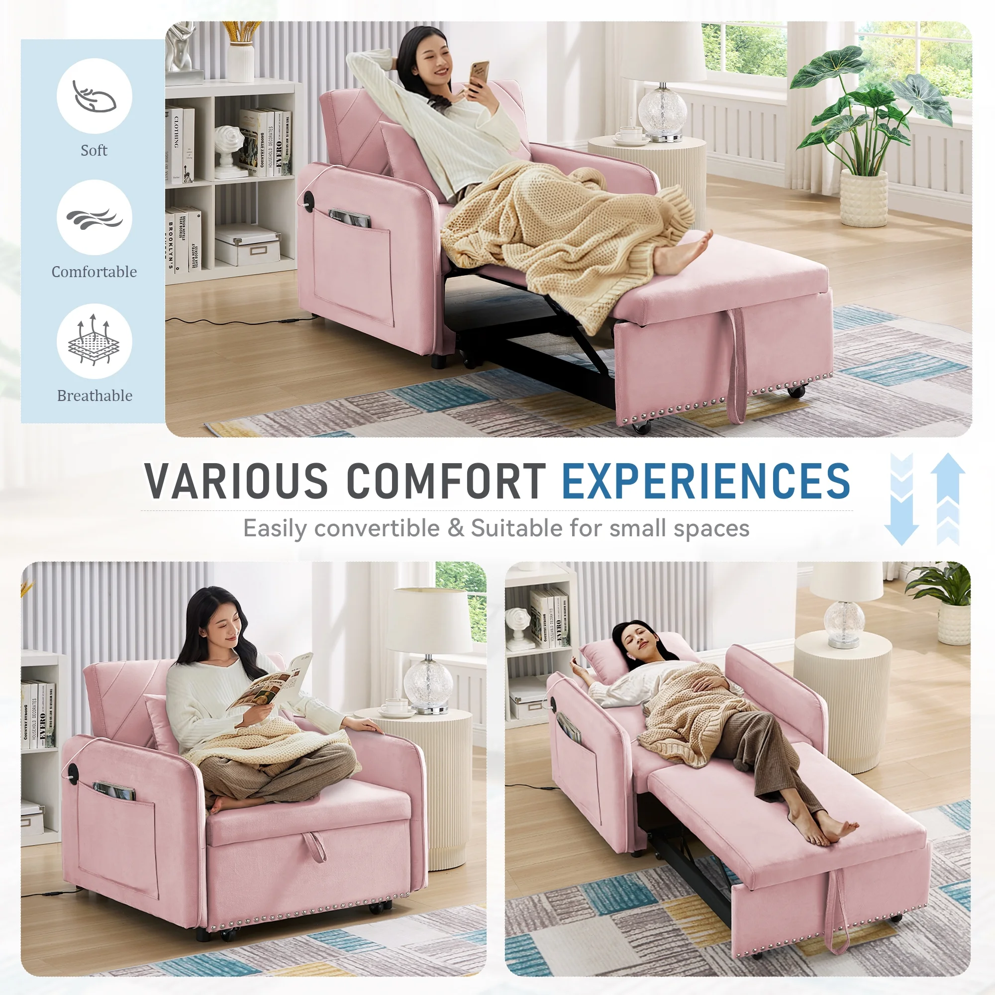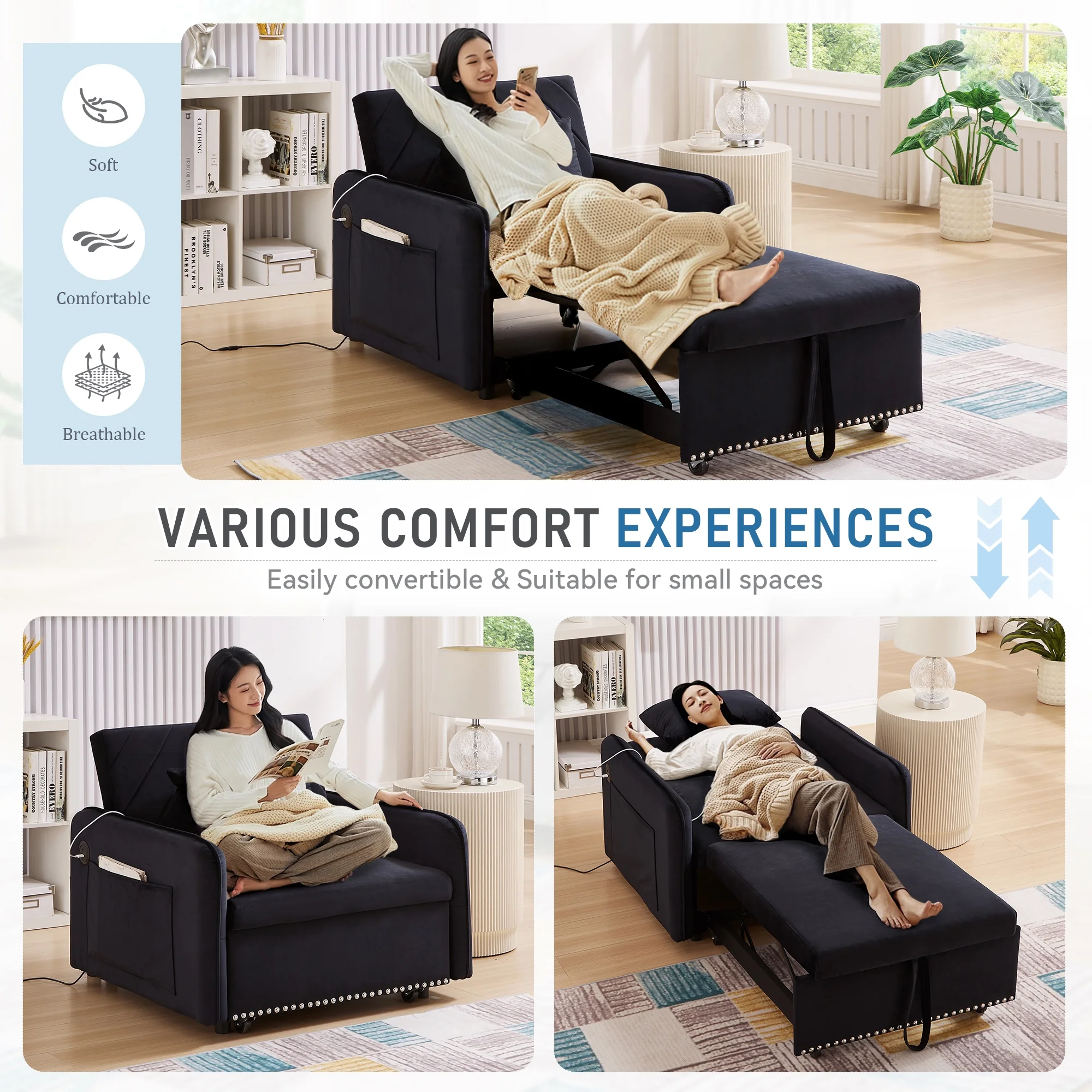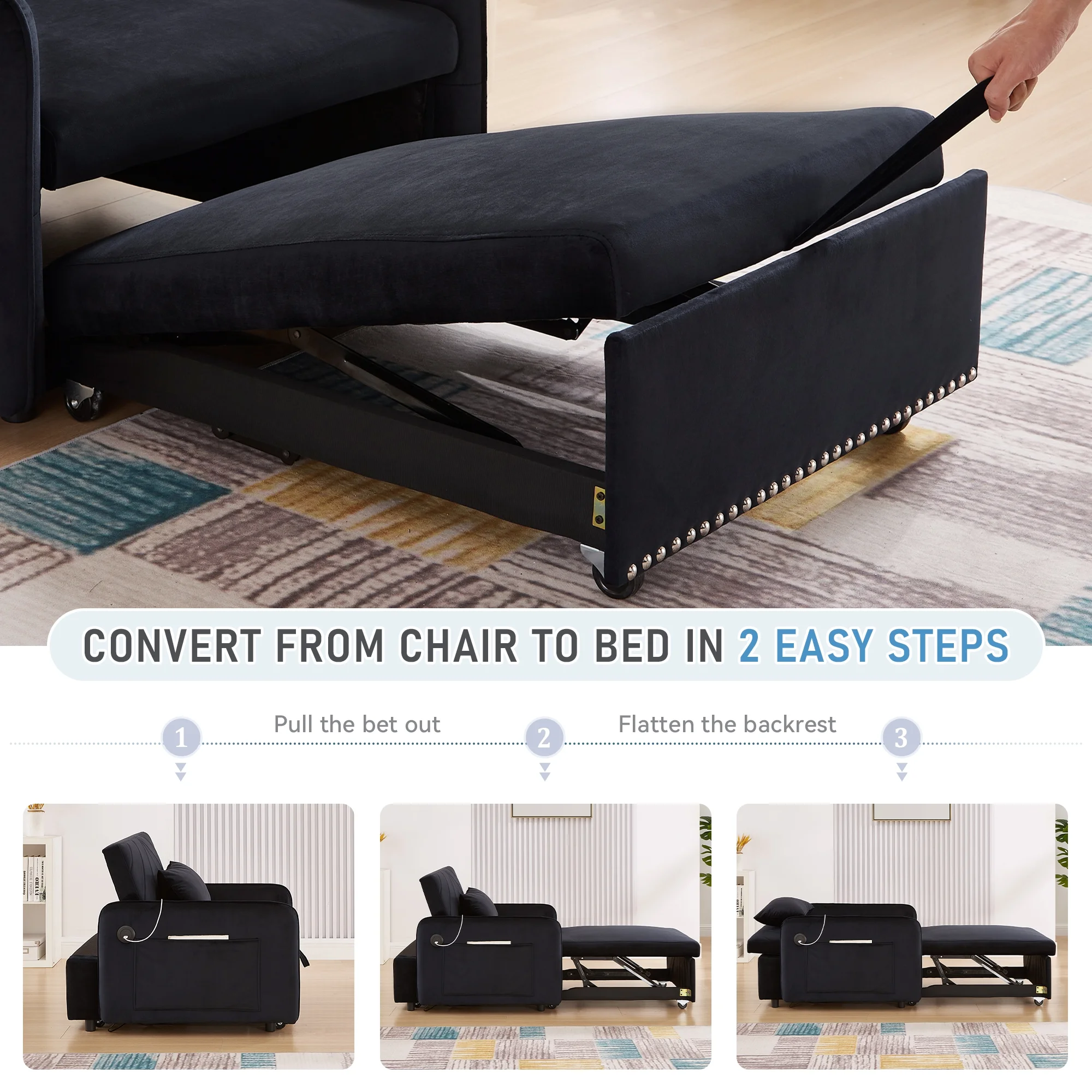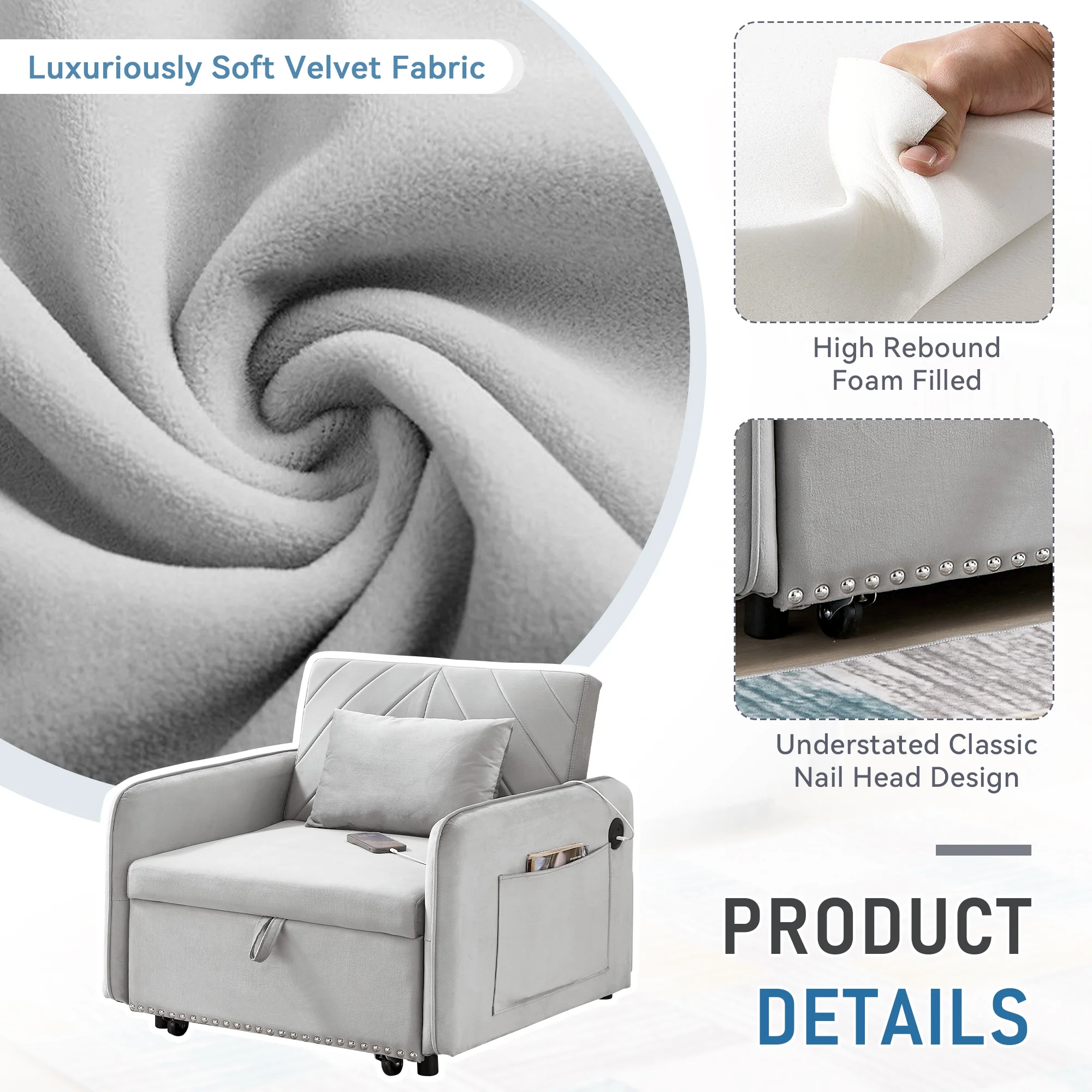 Embrace the essence of modern minimalism with our convertible sofa bed, designed to seamlessly integrate into any small space while offering maximum comfort and versatility. This sofa chair bed transitions effortlessly from a sofa chair to a chaise lounger and to a bed, catering to a variety of relaxation needs. The adjustable backrest, with settings at 110�� for cozy reading time, 150�� for a relaxed movie time, and 180�� for a nap or sleeping time, ensures personalized comfort. Wrapped in a soft velvet fabric and supported by high-rebound foam, it provides a soft and supportive surface for entertainment or rest. Our single sofa bed's understated, contemporary design speaks volumes without overwhelming, making it the perfect addition to any living space that values both style and practicality.