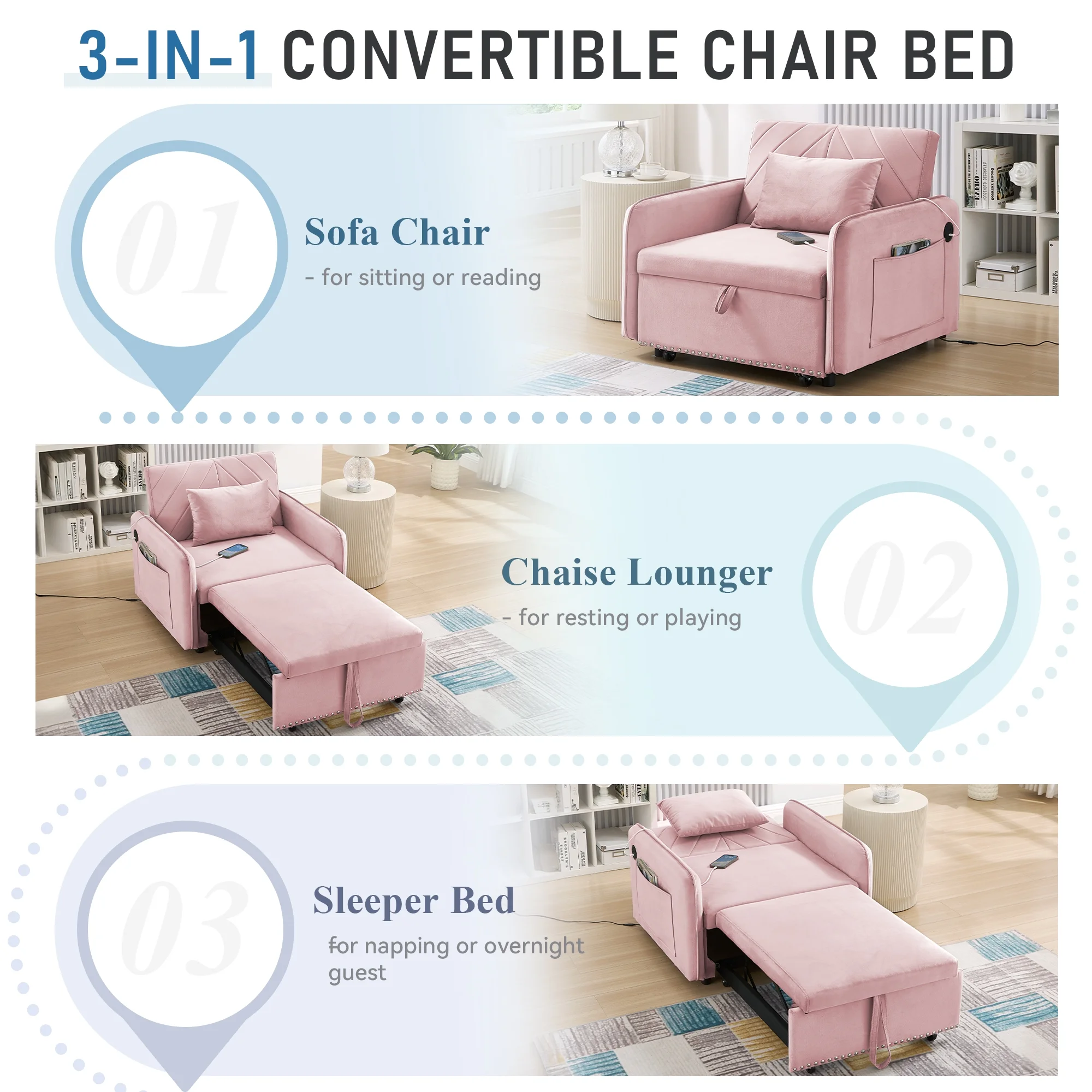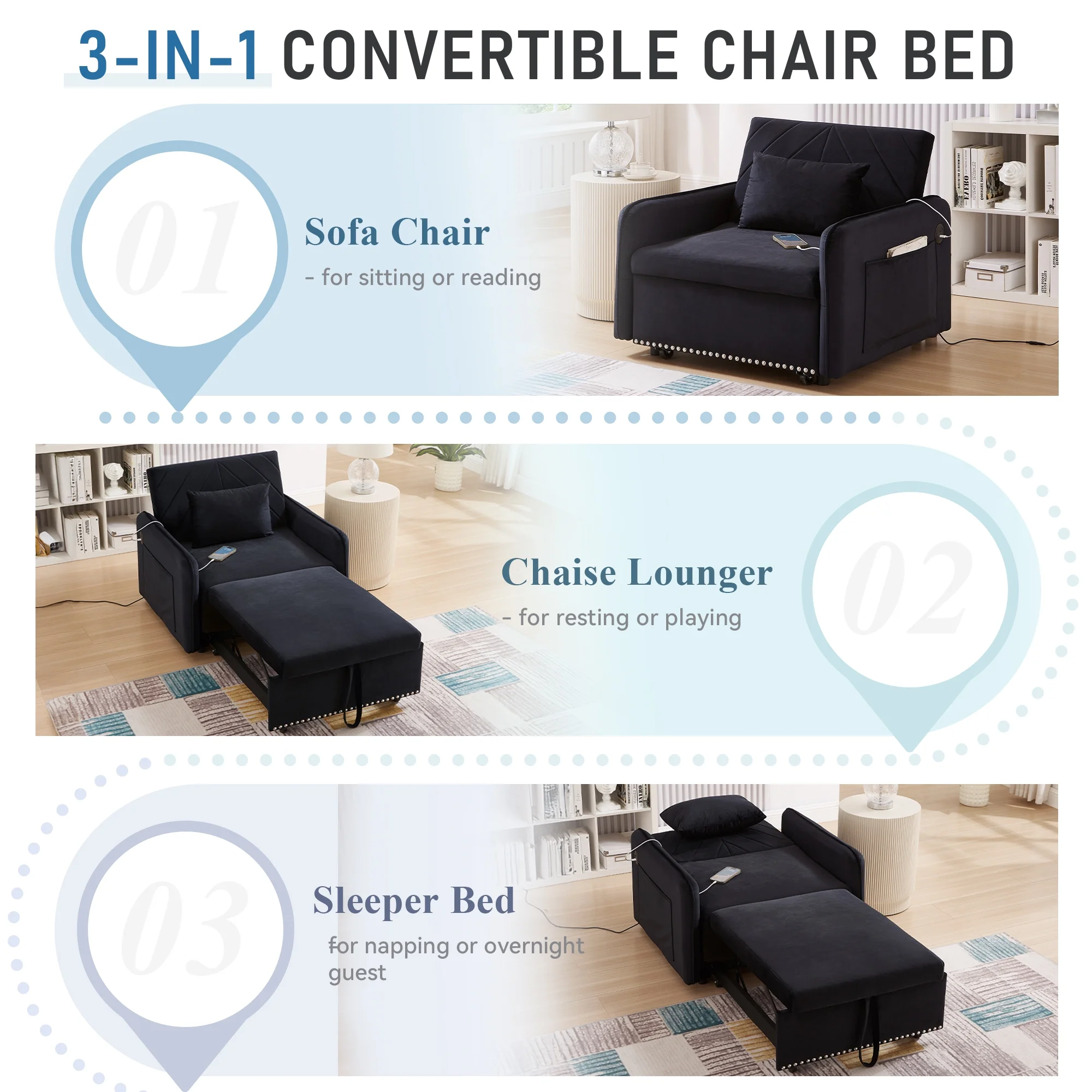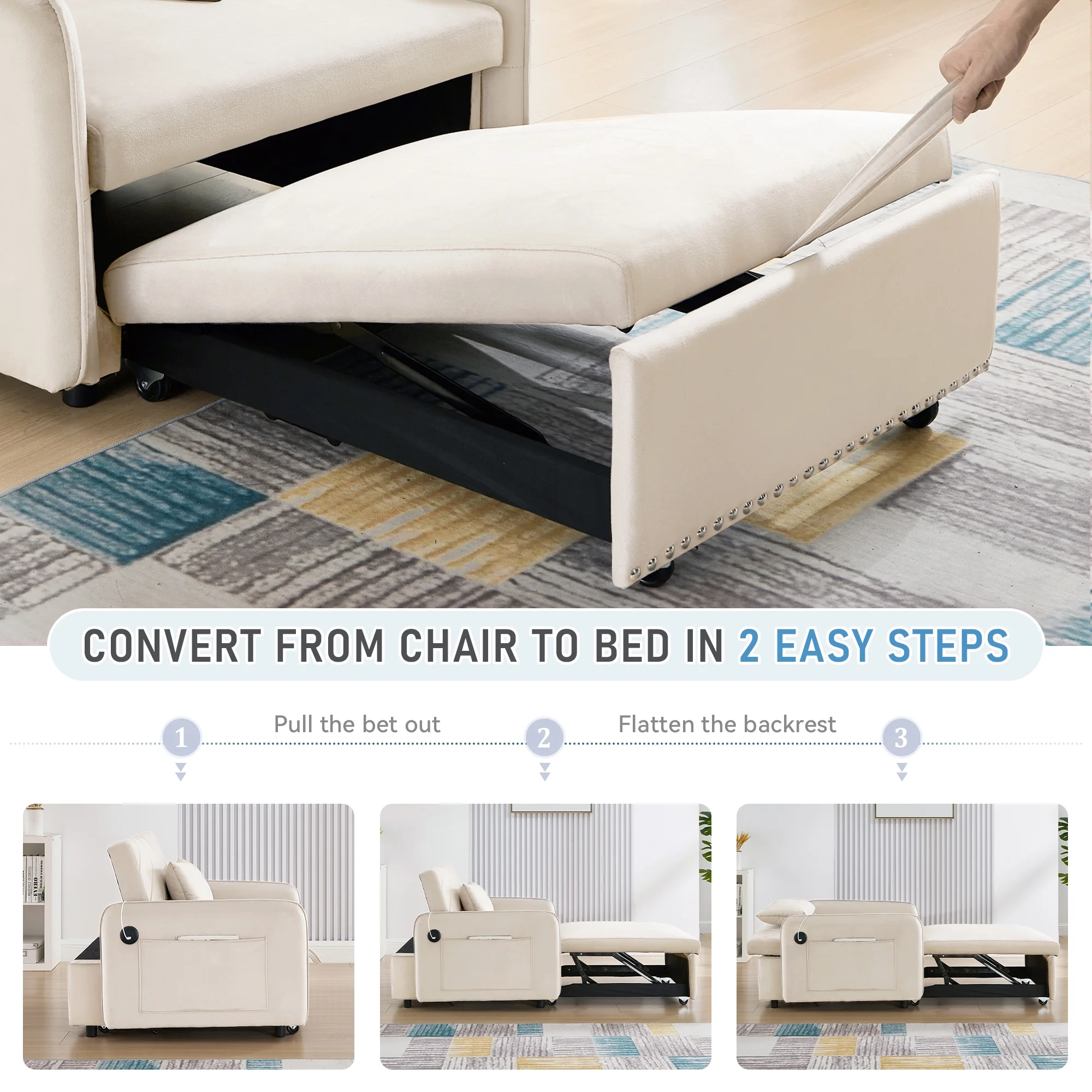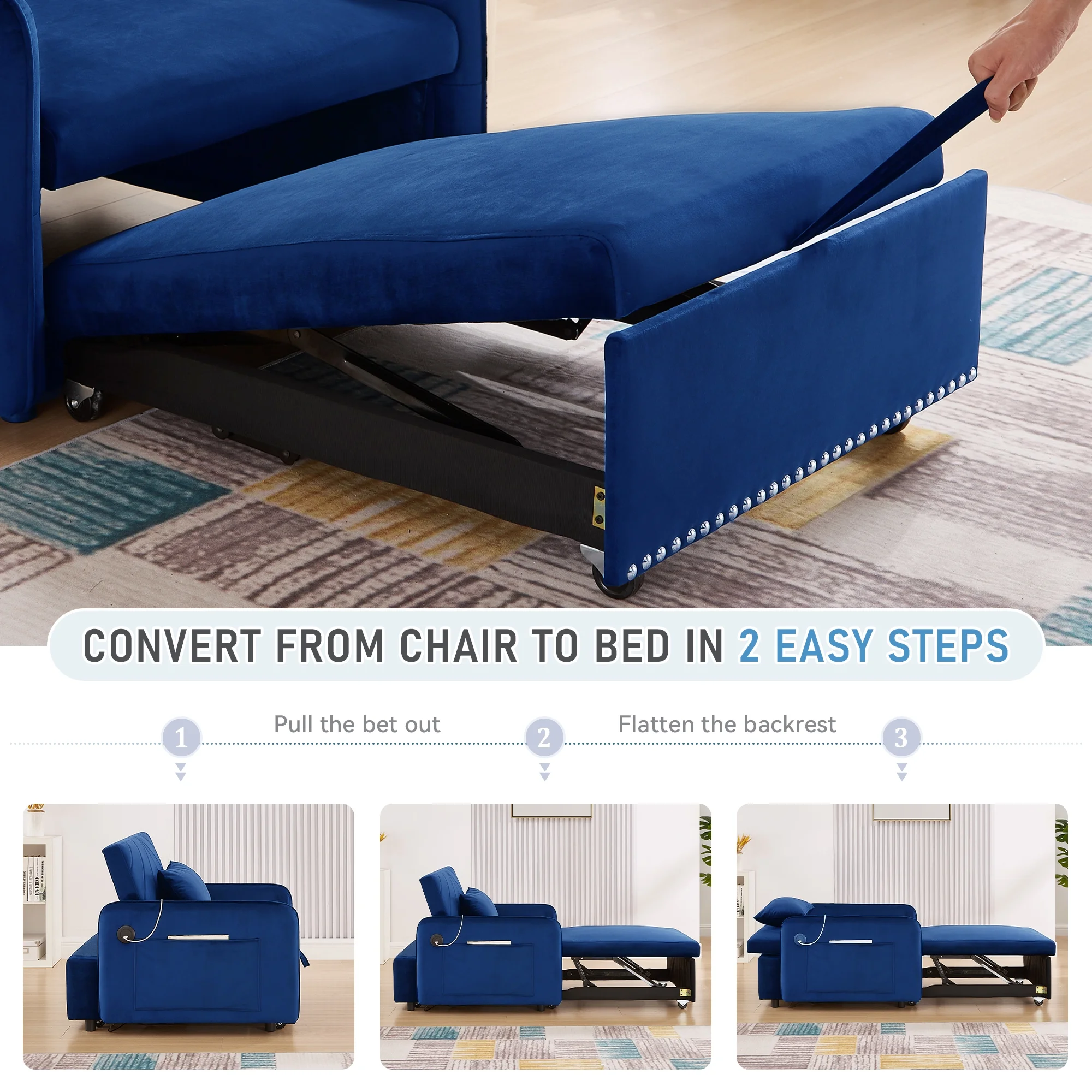 Embrace the essence of modern minimalism with our convertible sofa bed, designed to seamlessly integrate into any small space while offering maximum comfort and versatility. This sofa chair bed transitions effortlessly from a sofa chair to a chaise lounger and to a bed, catering to a variety of relaxation needs. The adjustable backrest, with settings at 110�� for cozy reading time, 150�� for a relaxed movie time, and 180�� for a nap or sleeping time, ensures personalized comfort. Wrapped in a soft velvet fabric and supported by high-rebound foam, it provides a soft and supportive surface for entertainment or rest. Our single sofa bed's understated, contemporary design speaks volumes without overwhelming, making it the perfect addition to any living space that values both style and practicality.
