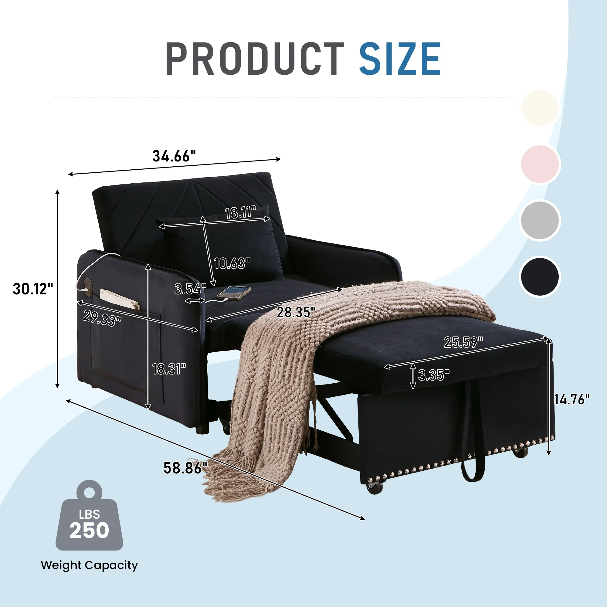 - Quickly converts from sofa chair to lounge chair to bed