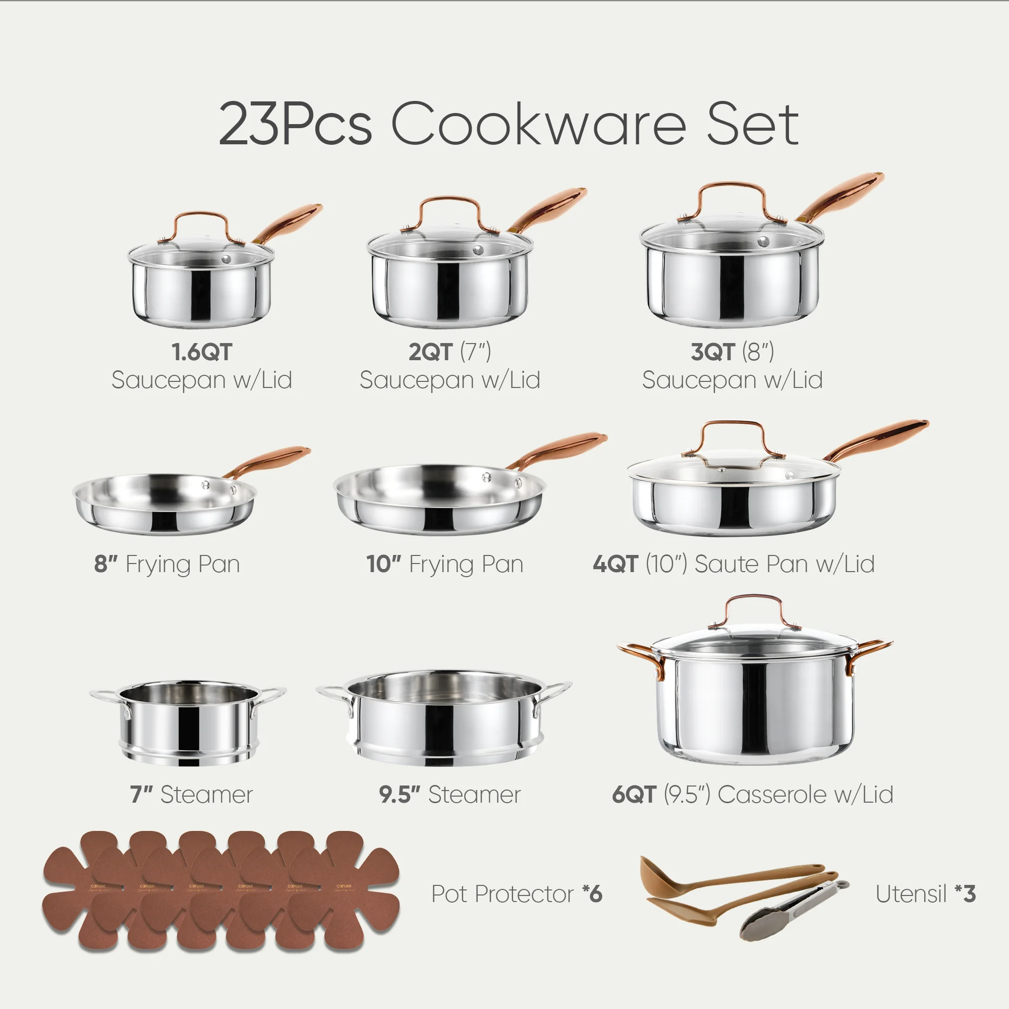- 23-Piece Complete Set :1.5 QT Saucepan, 2 QT Saucepan, 3 QT Saucepan, 6.5" Stockpot, 8" Frying Pan, 10" Frying Pan, 12" Frying Pan, 10" Saut�� Pan, 7" Steamer, 9.4" Steamer, 6 Pan Protectors, and 3 Utensils.