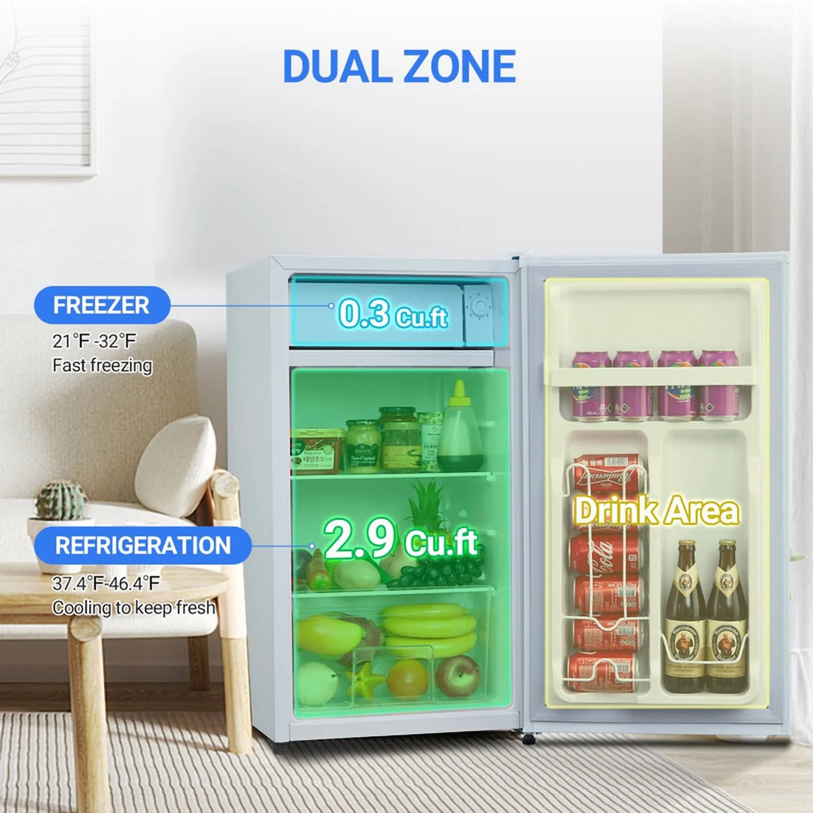 - Single-Door Mini Fridge: This compact mini fridge with freezer measures 21.26"D x 19.88"W x 36.02"H and offers a generous 3.2 Cu.ft (90.6 L) of space, including a freezer section. The single-door layout is practical and space-conscious, letting you grab ice cubes or drinks quickly. Unlike other small refrigerators with two doors, this model fits more inside while taking up less room. It��s a great mini fridge for bedroom, dorm, office, RV, or garage use.