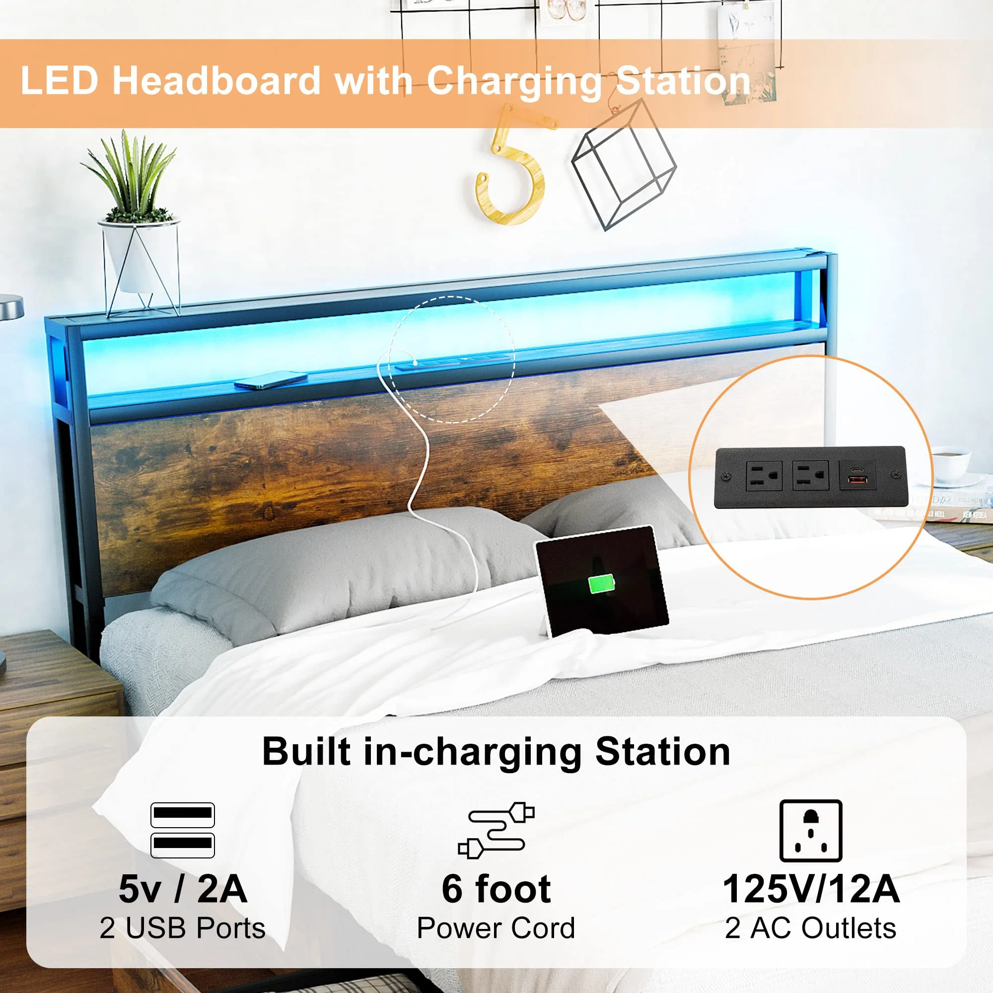 - Storage Headboard with Power Outlet - The bed frame have 2 Tier storage headboard, can easily place mobile phones, glasses, books, coffee cups, chargers etc on it when sleeping. meanwhile the headboard have built-in 2 Plug USA Standard Socket & 1 USB charging Port & 1 Type-C charging port, make the bed very convenient for us using the computer or charge mobile phone/pad when lying on the bed.Bed Frame with 20 Color LED Light - The full size platform bed with headboard have built in RGB LED strips and remote controller, we can change the LED lights to 20 light colors and 16 light mode through remote control or mobile APP, even the LED light could change color or jump speed according music rhythm. Owning this LED bed frame, makes our sleep easier.