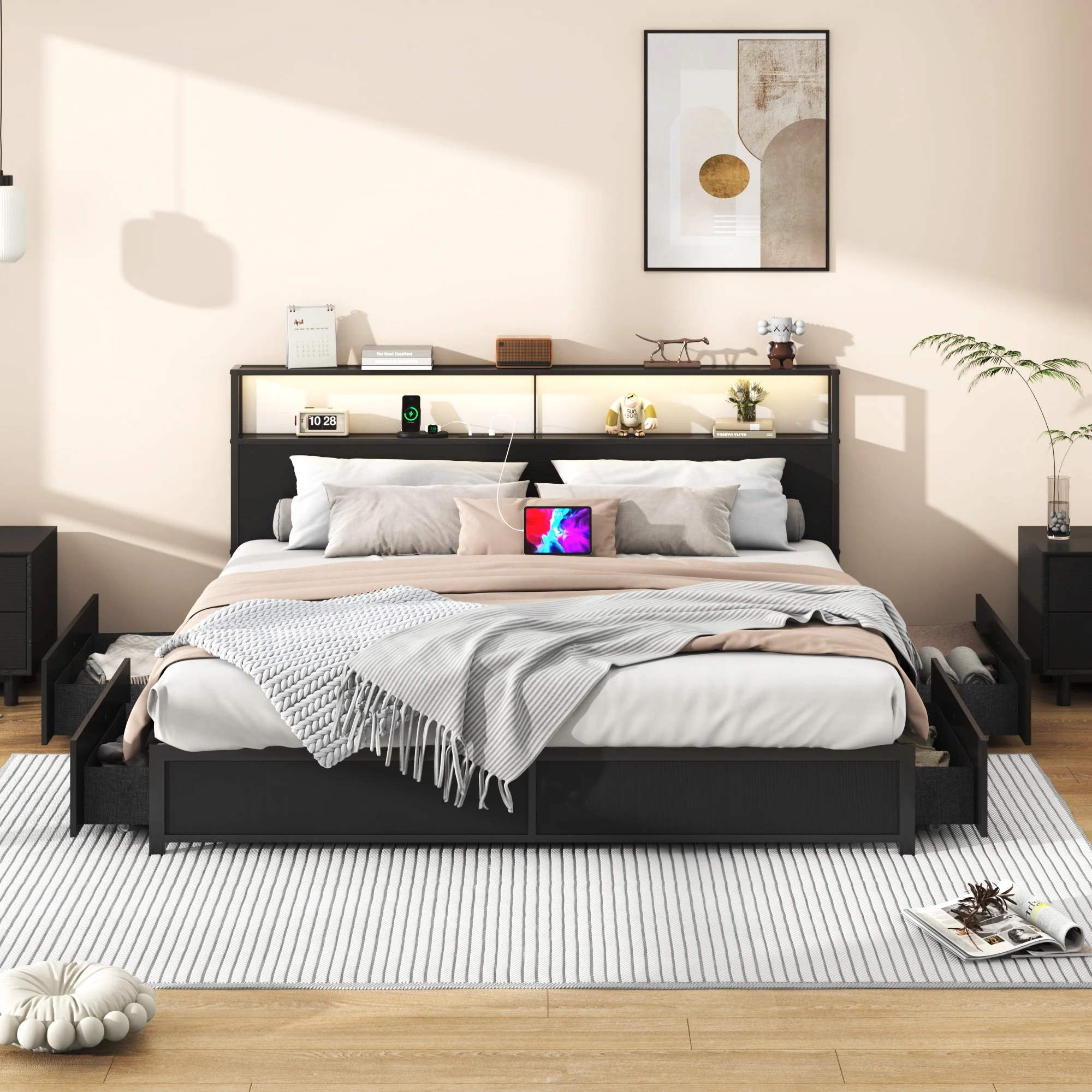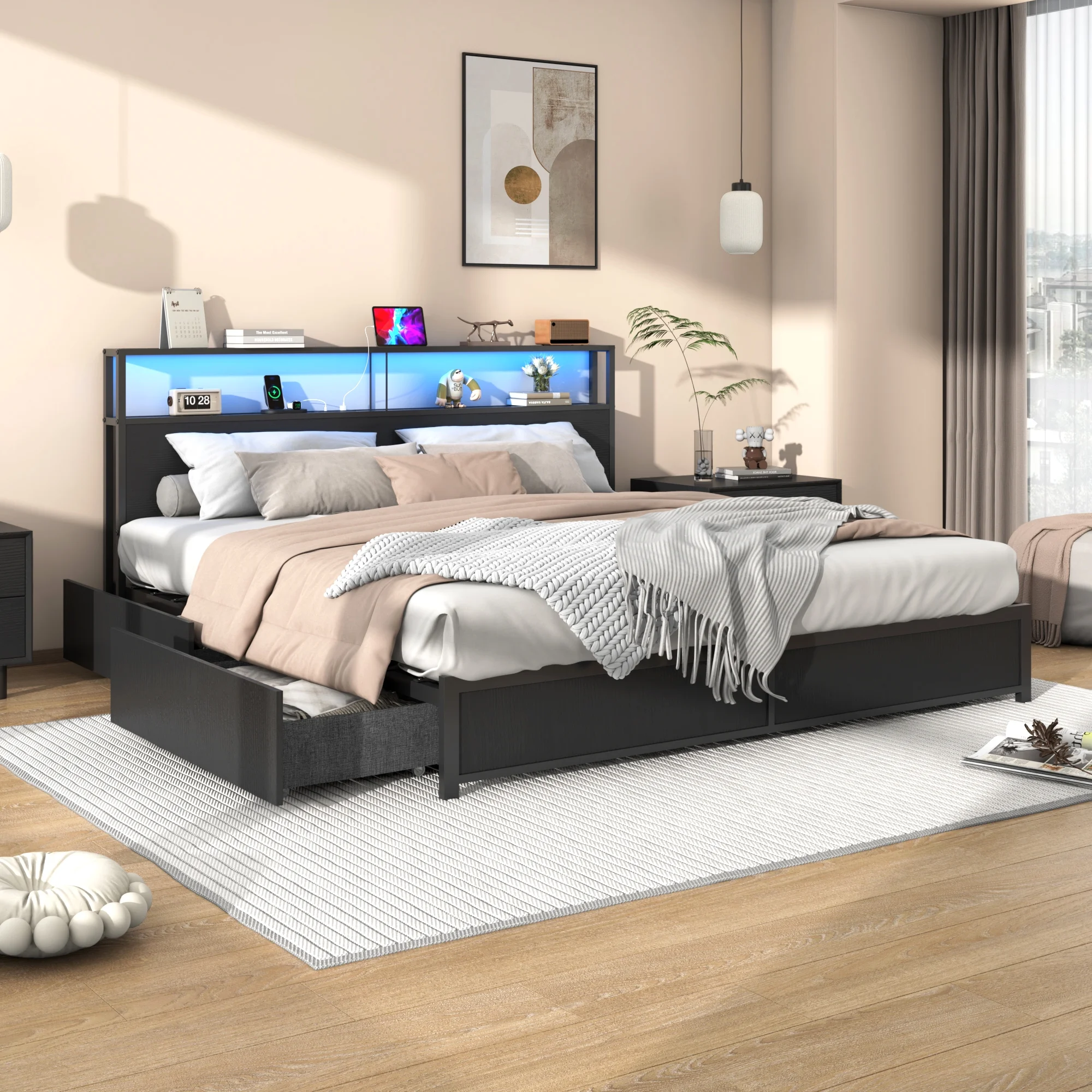 Full Size Bed Frame with LED Light Charging Port Headboard & 4 Storage Drawers