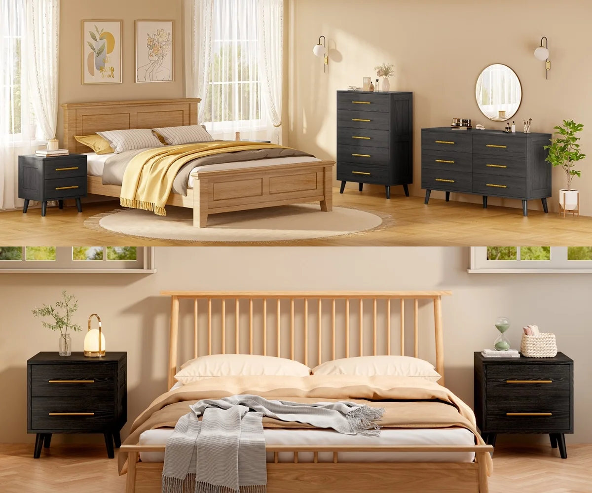 Bedroom Furniture Set - Includes Queen Bed Frame, Nightstands Set of 2, 5 - Drawer Dresser & Double Wide 6 - Drawer Dresser - Modern Storage Solution for Stylish Home Decor, Black