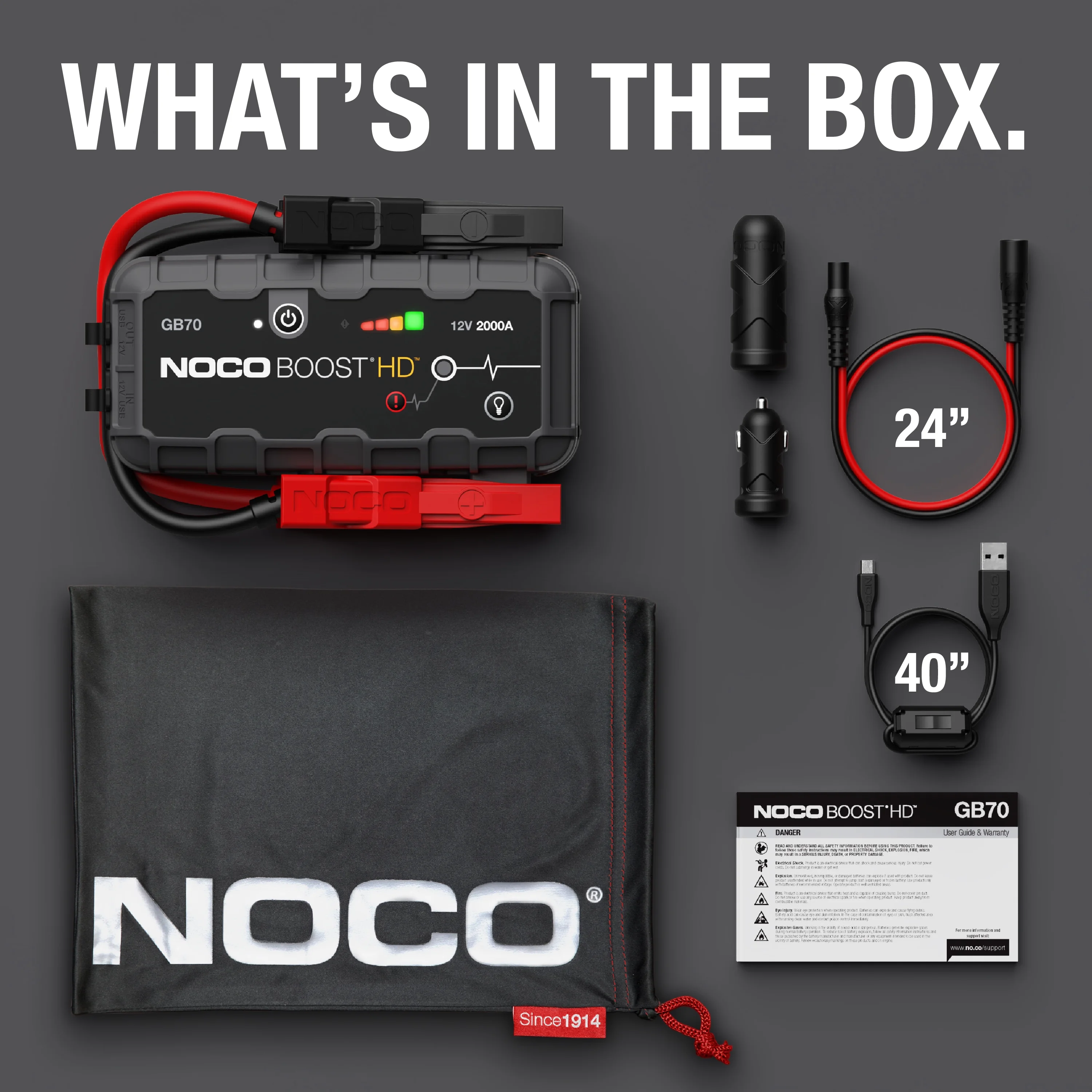- IN THE BOX �� Inside, you will find a GB70 portable jump starter with battery booster clamps, a USB-C charging cable, XGC connectors and cable, and a microfiber storage bag. It also comes with a one-year warranty and is proudly designed in the USA.