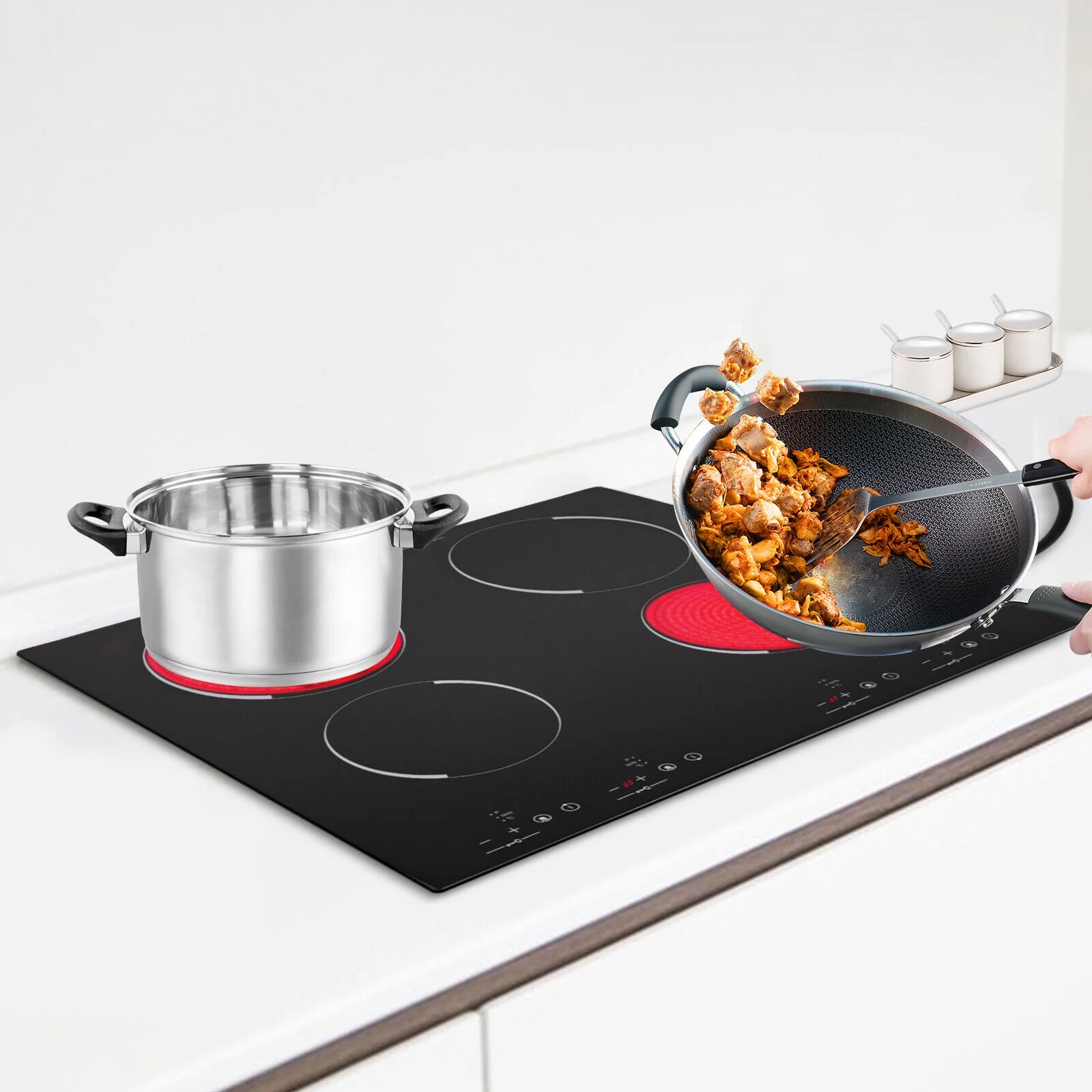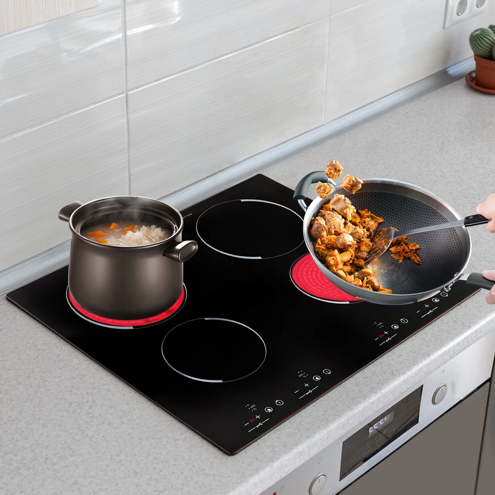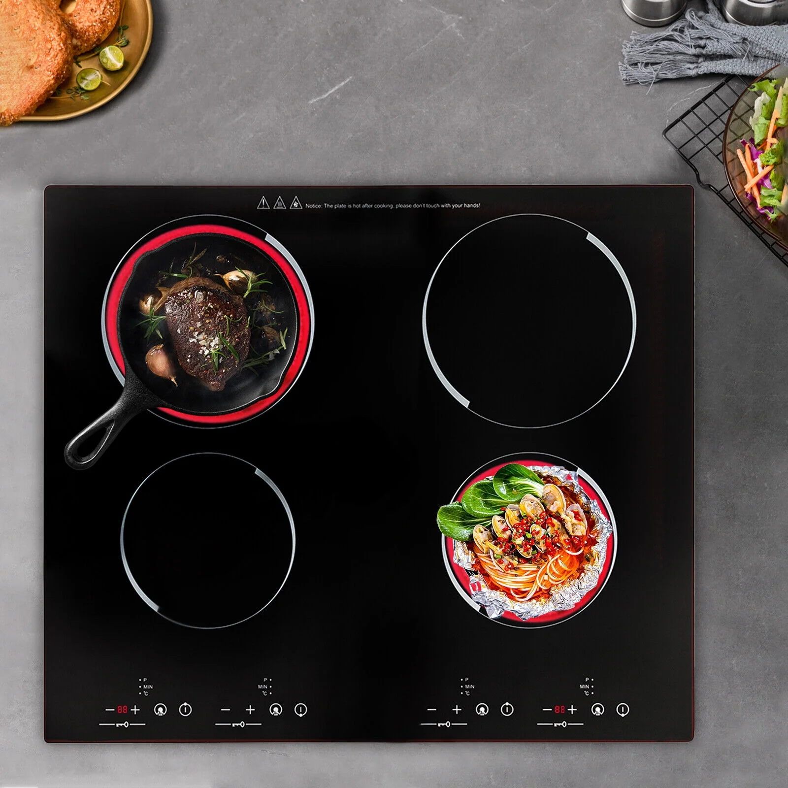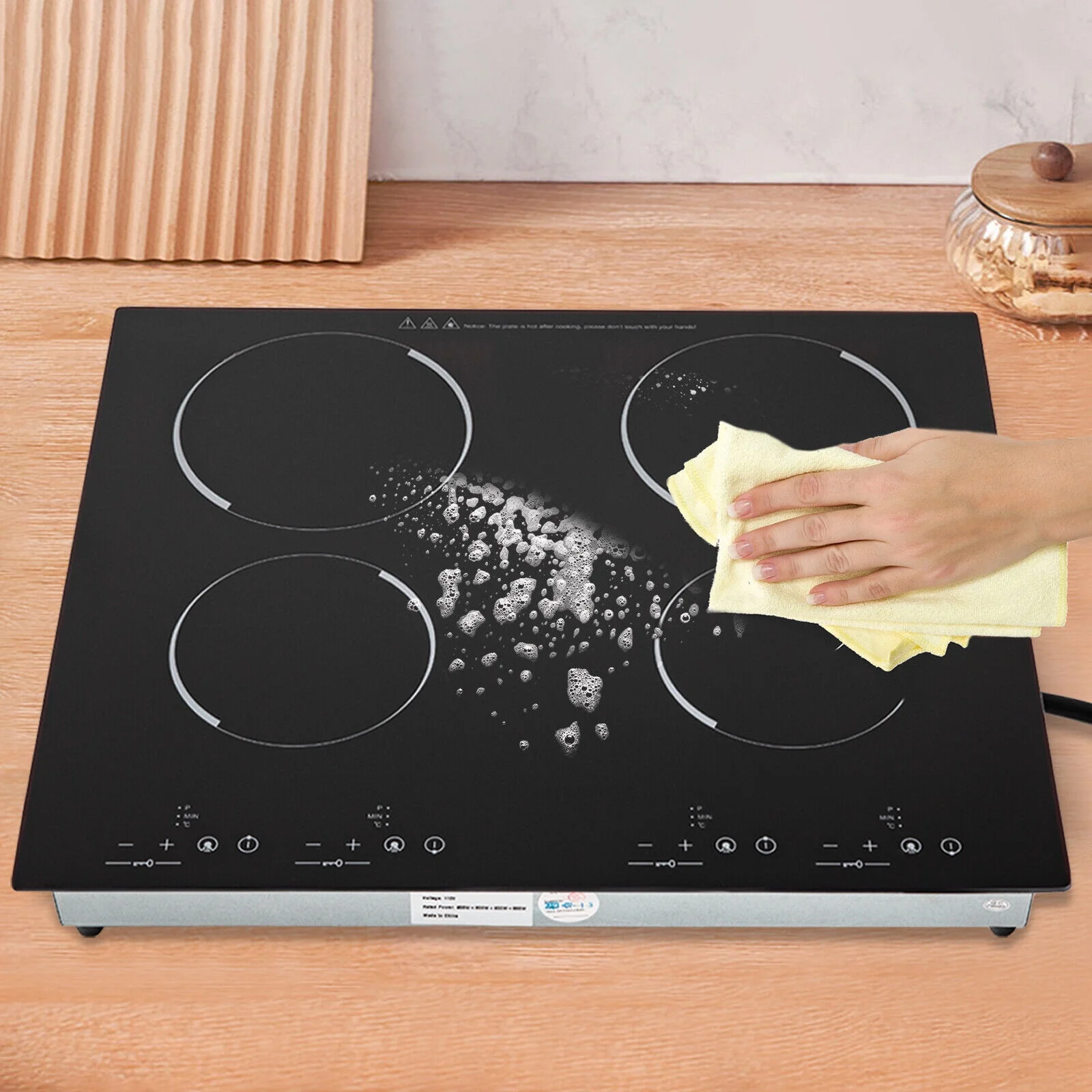 The electric ceramic cooktop is an ideal choice for your modern kitchens. It features four electric burners, offering ample space for all your cooking needs. It can adjust the power, temperature, and time so that you can accurately cook the best-tasting ingredients. Crafted using a high-quality black crystal panel and galvanized plate, it is not only durable but also easy to clean. Upgrade your cooking experience with our ceramic cooktop and enjoy delicious meals in style.