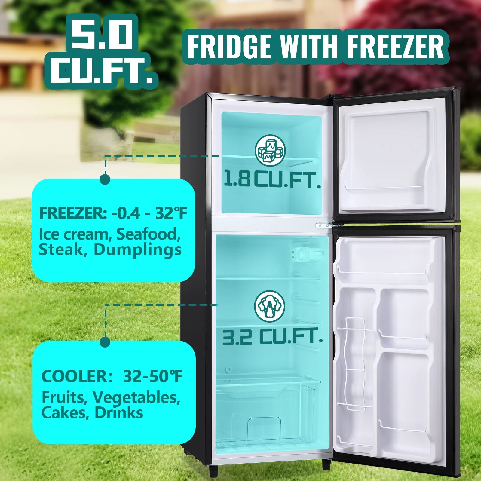 - Measuring a sleek 17.5"W x 17.7"D x 47.6"H, this 5.0 cu.ft fridge packs serious storage into tight spaces. Perfect for: dorms (fits under loft beds); studio apartments (slim profile saves precious square footage); home offices (keeps drinks and lunches chilled); Man caves (stores beverage cans + snacks with room to spare).