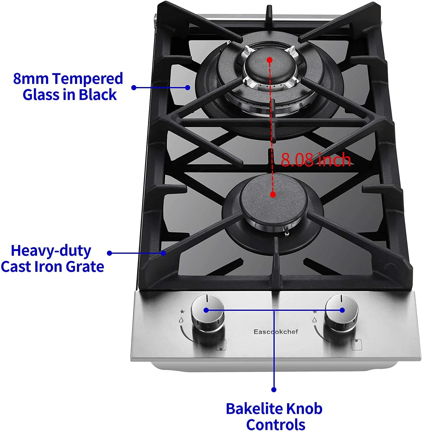 - Durable cast iron grates with a one-piece, 8-claw structure to hold pans firmly without slipping. About 8 inches between burners �� fits most pan sizes.