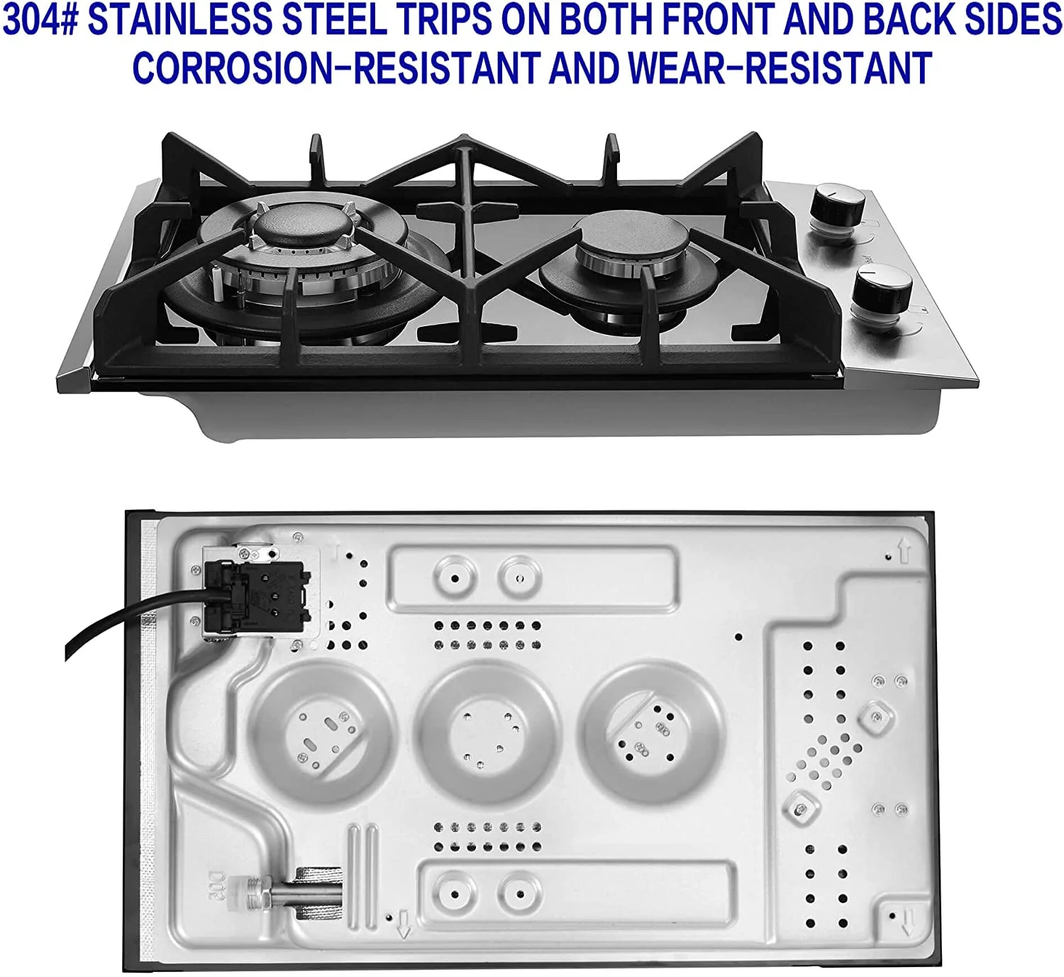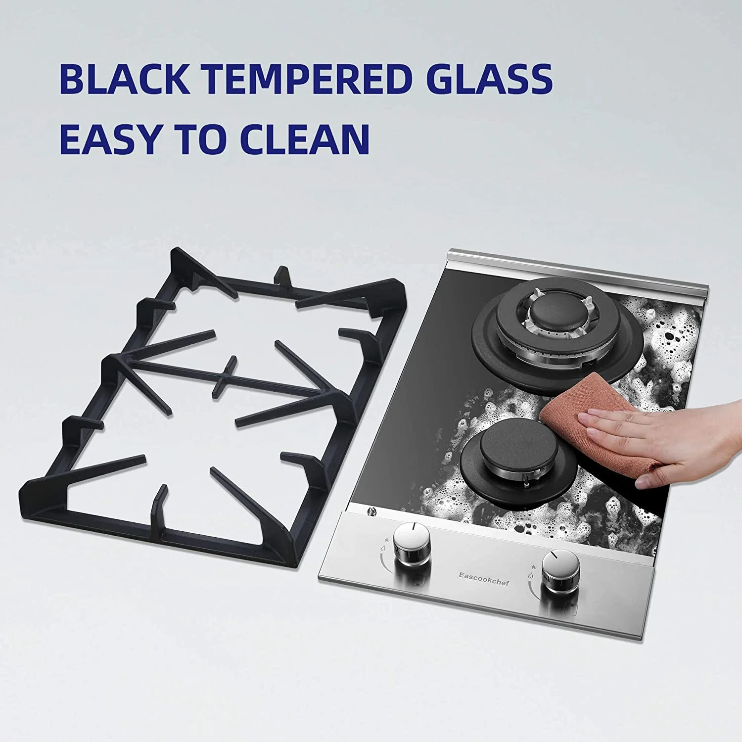 - ��BLACK TEMPERED GLASS SURFACE��This gas cooktop is made of 8mm real thickness black tempered glass,cool and dirt resistant. One-piece design prevents spilled liquid from seeping into the interior of the gas cooktop, smooth glass surface, easy to clean. Both front and back sides are made of 304# stainless steel trips,corrosion-resistant, wear-resistant.