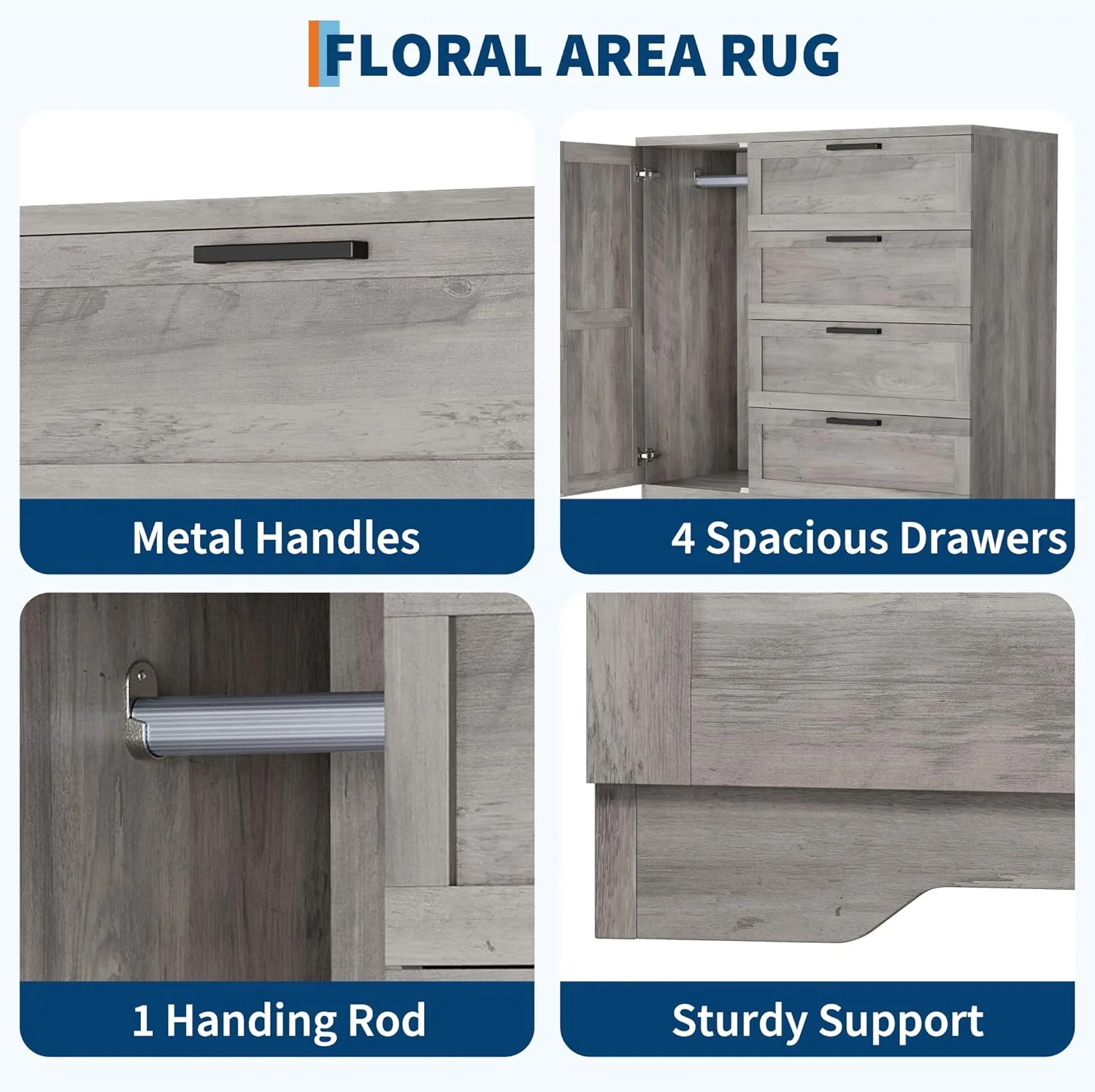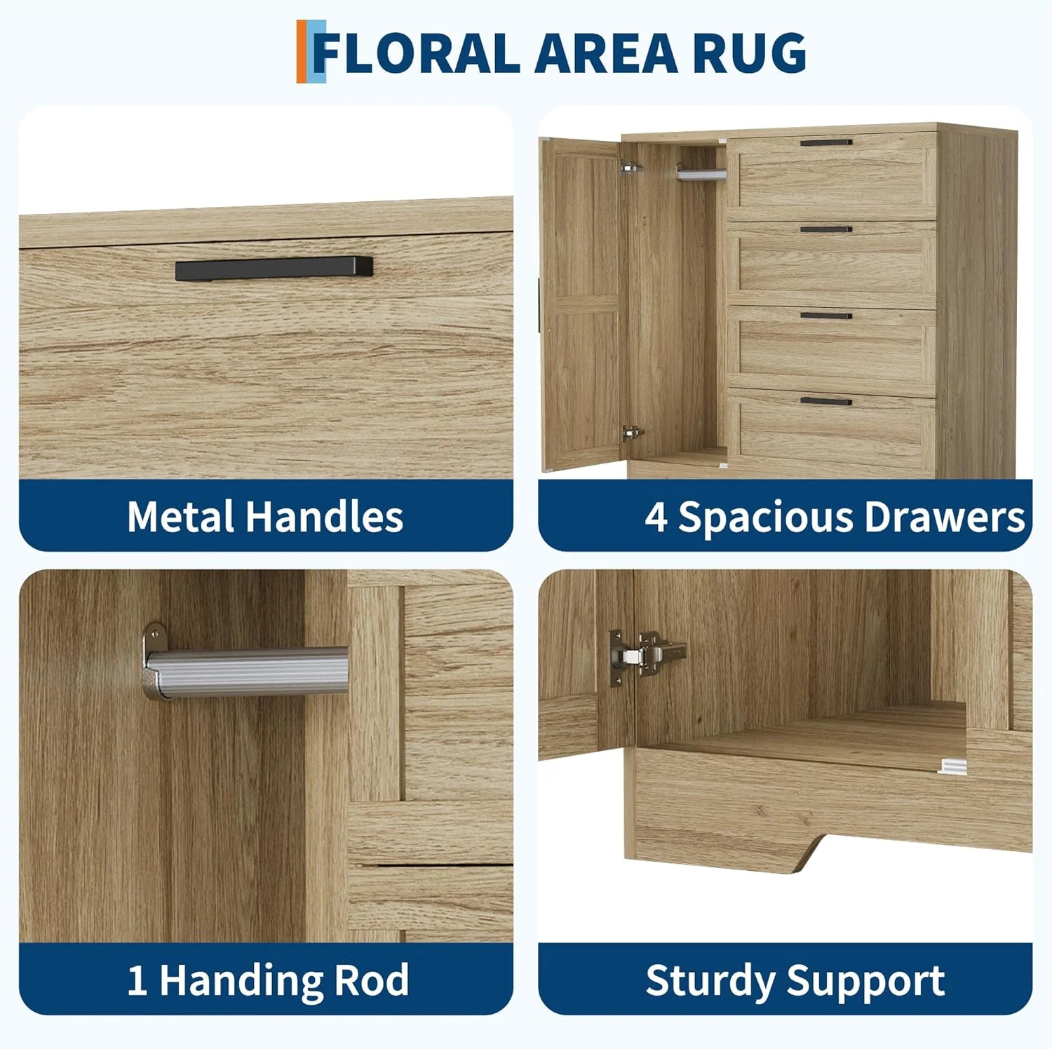 - ��Maximize Storage with Hanging Space & 4 Drawers��This versatile wardrobe armoire offers a door closet with a hanging rod for coats and shirts, keeping clothing wrinkle-free and organized. Four spacious storage drawers provide ample room for folded items, while the durable tabletop is ideal for displaying decor, hats, or cosmetics. Perfect multifunctional furniture for bedroom clothing storage.