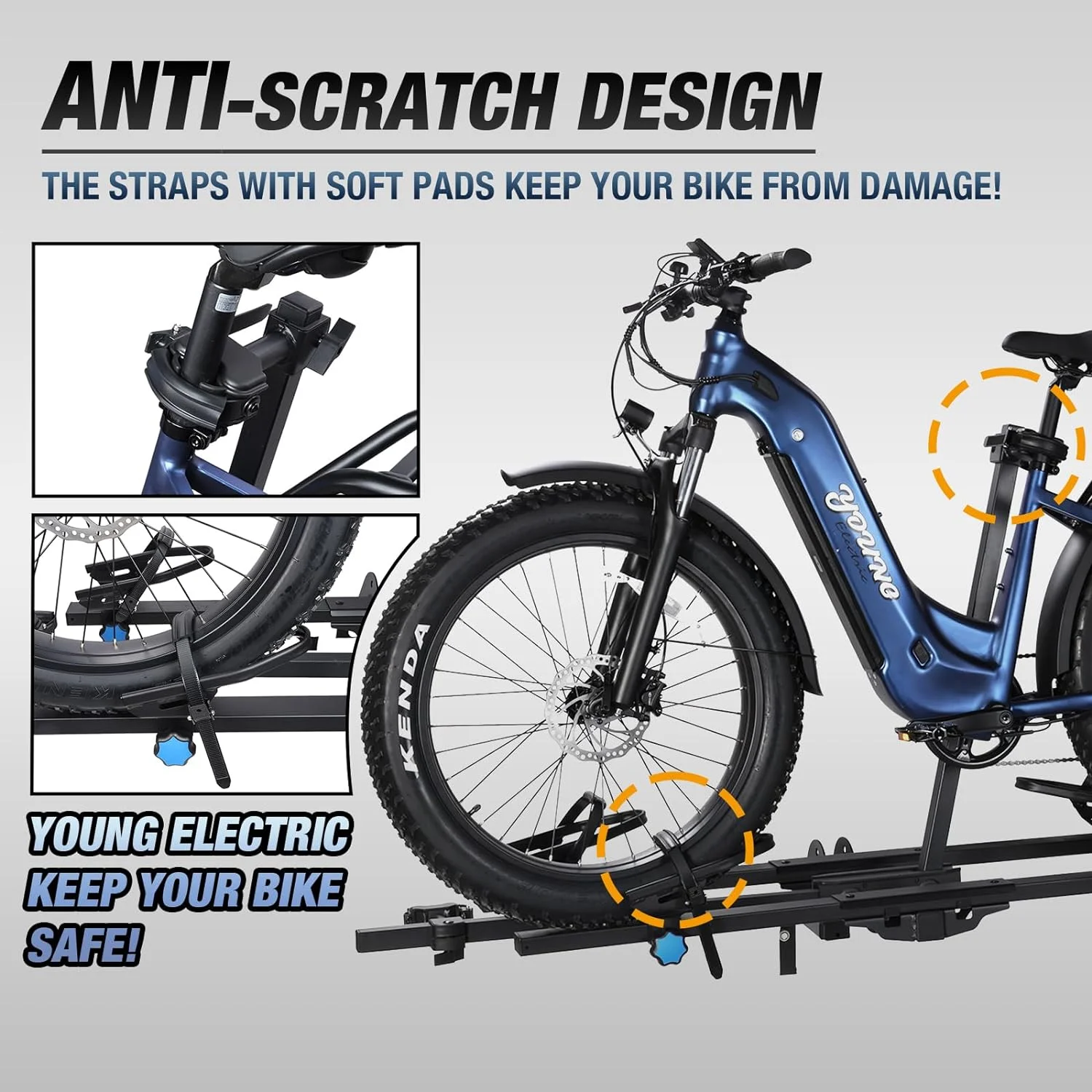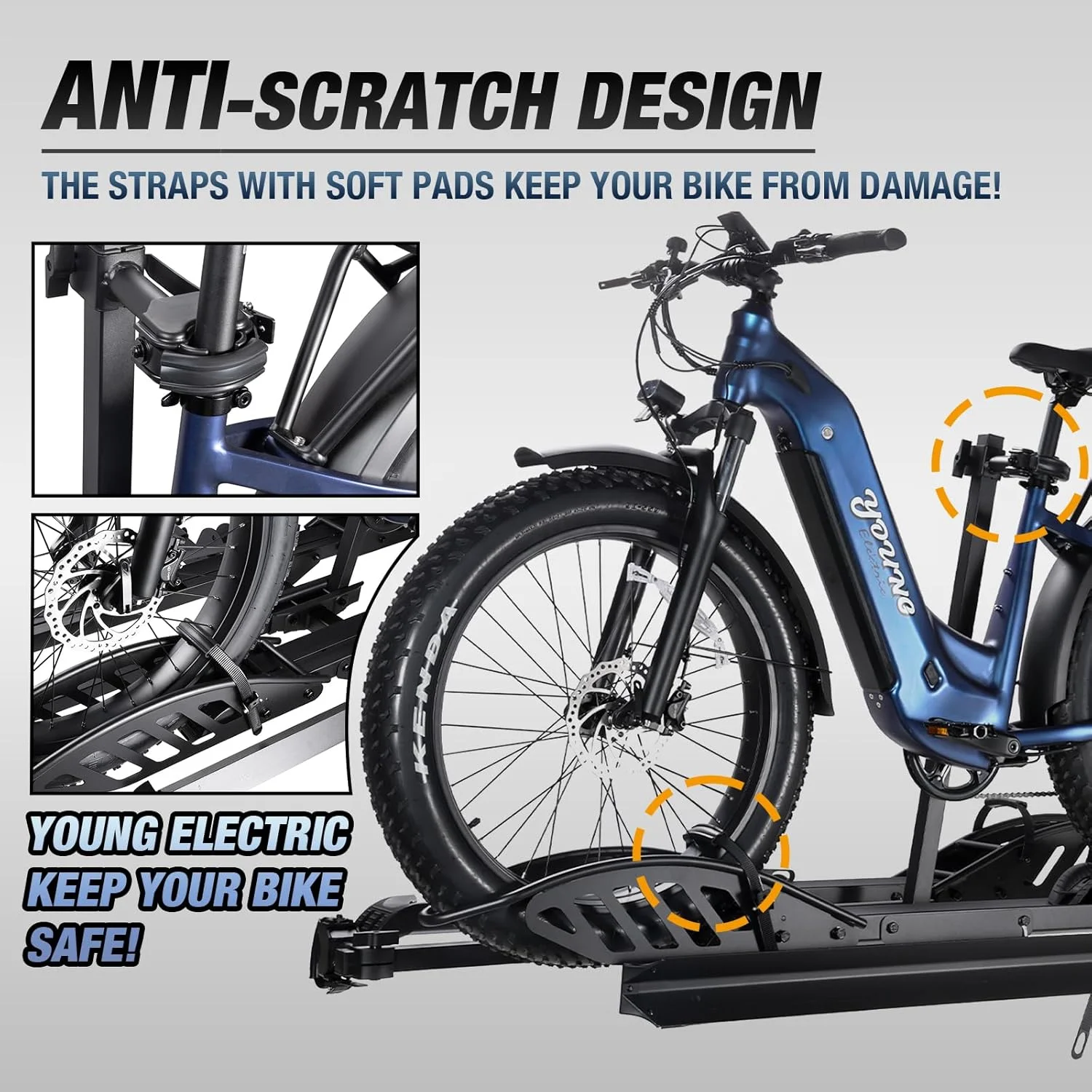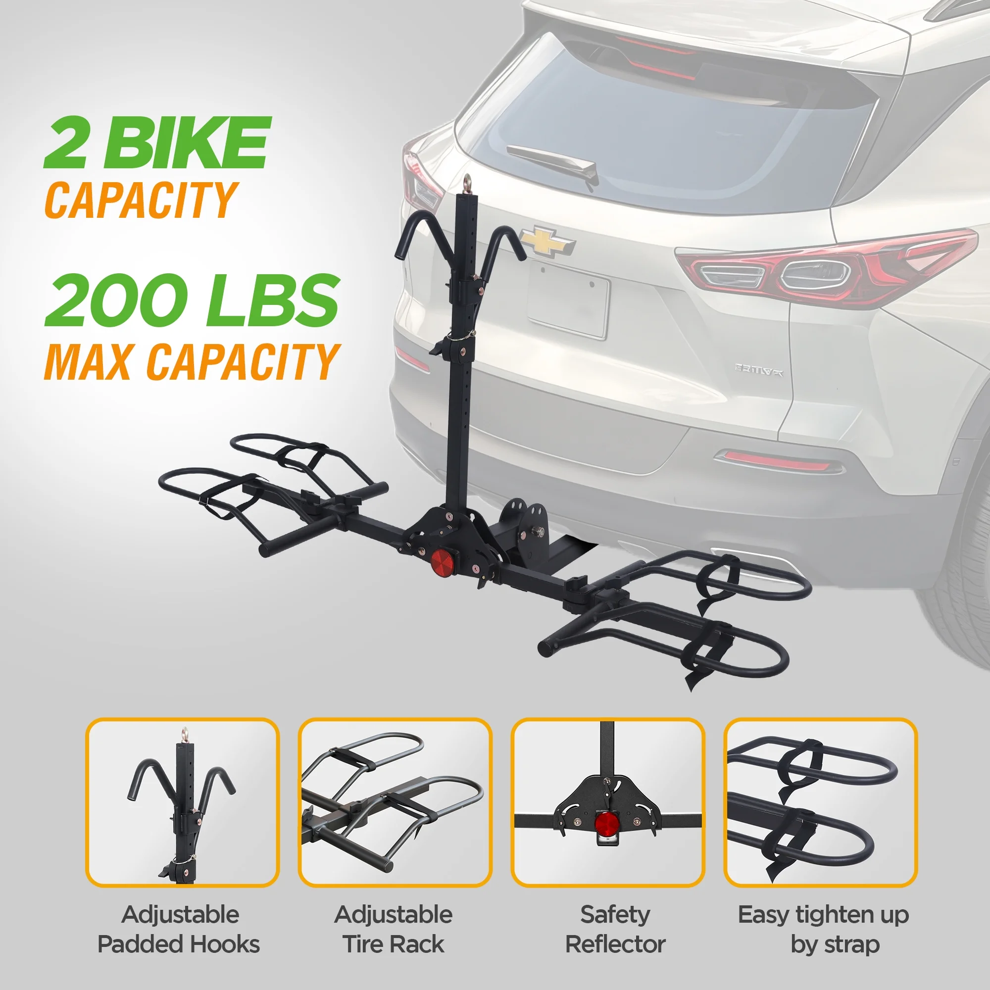 - SAFE AND SECURE: Comes with soft padded hooks, that secure your bikes in place without swaying and scratching the paint. The hitch tightener and adjustable vertical frame ensure a safe and secure fit for various bike frame sizes. The rear safety reflector improves visibility in low light conditions.