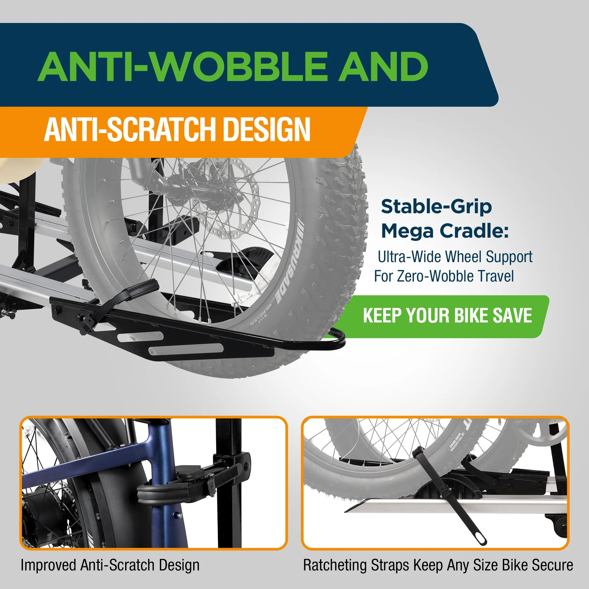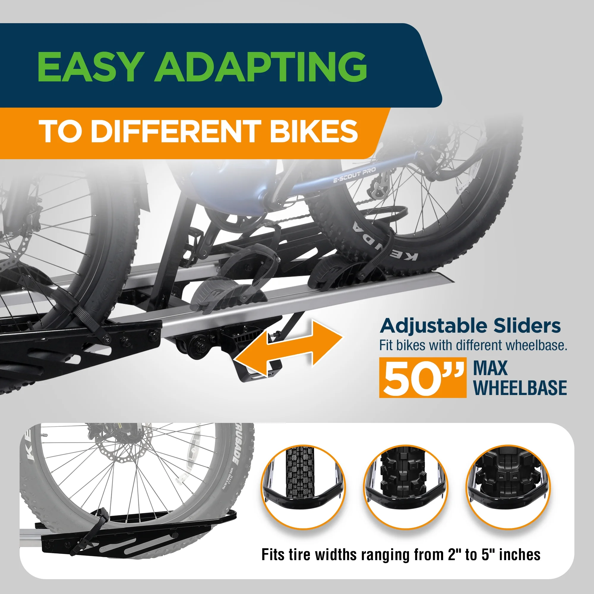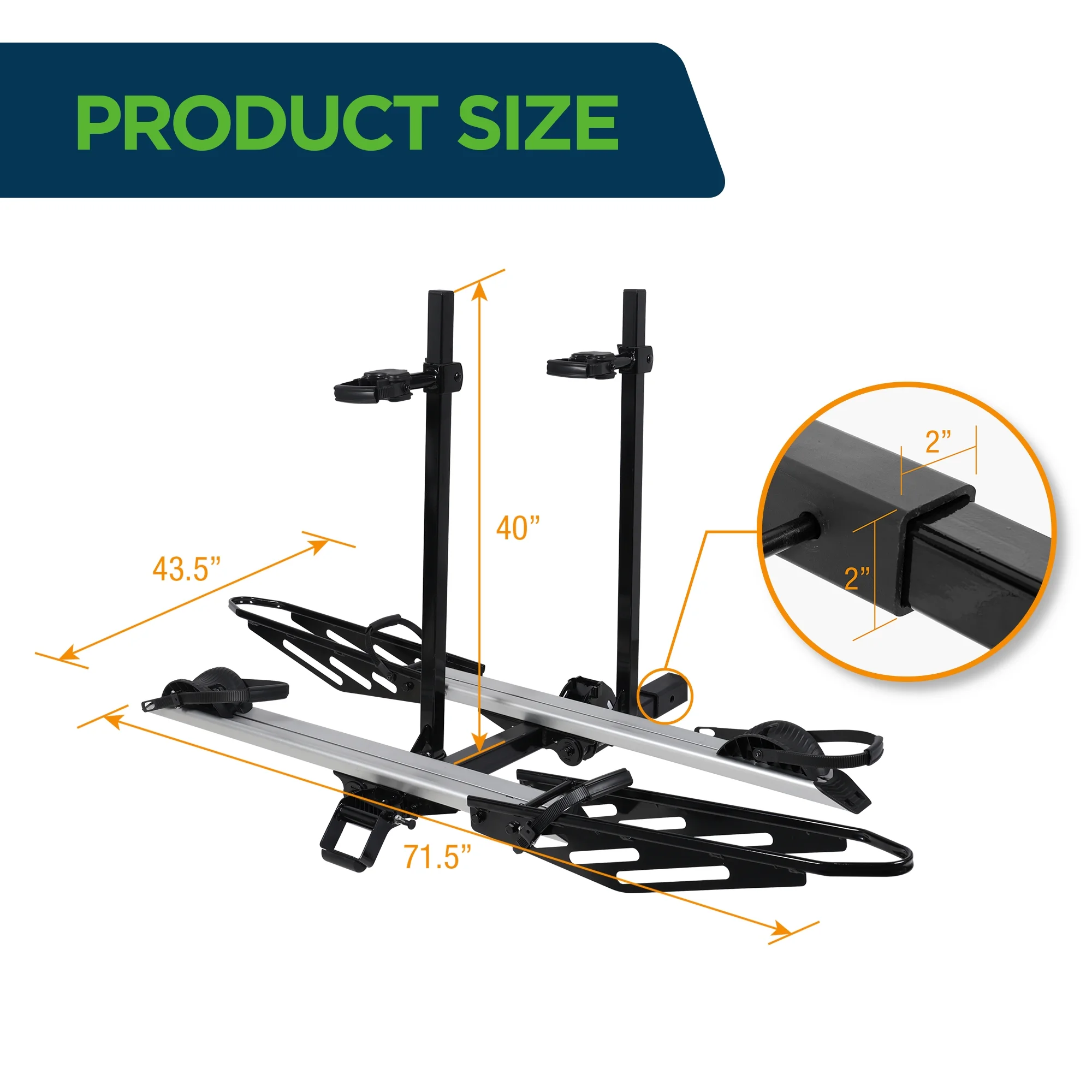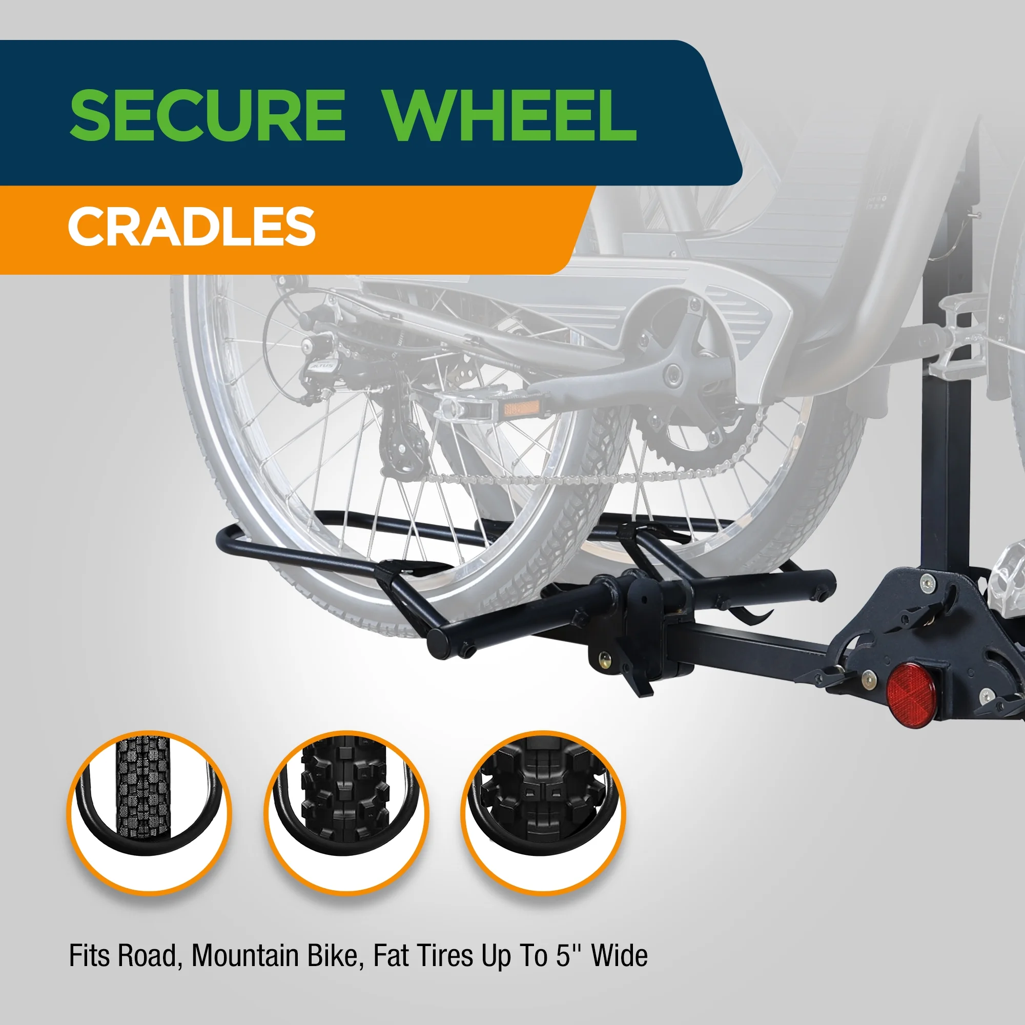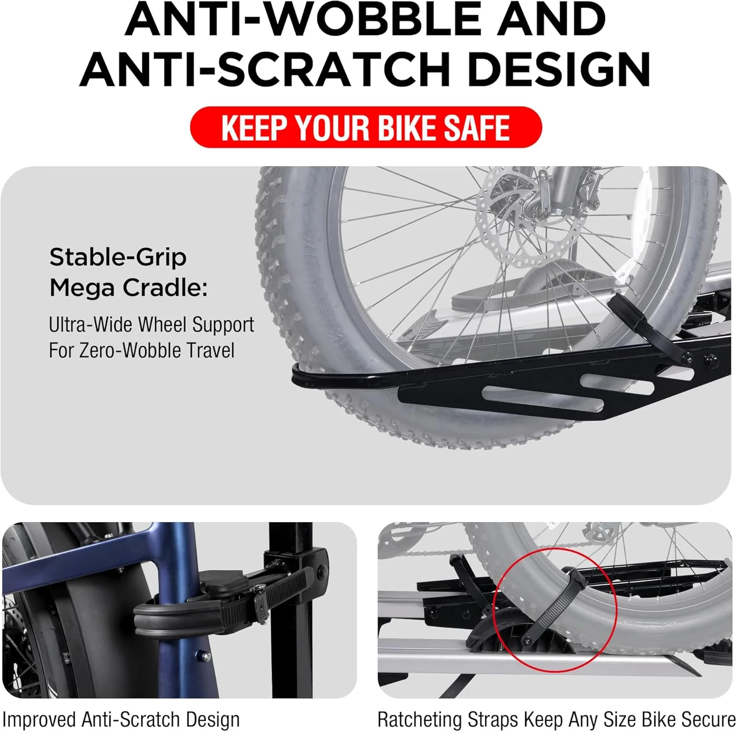 - 200 LB TOTAL CAPACITY: Easily transports up to 2 bikes, with a maximum weight of 100 lbs per bike. The universal tire holders and wheel straps are compatible with mountain bikes, road bikes, and fat tire bikes with tire widths up to 5 inches, fitting tire diameters from 20" to 29" and bikes with a wheelbase up to 58".