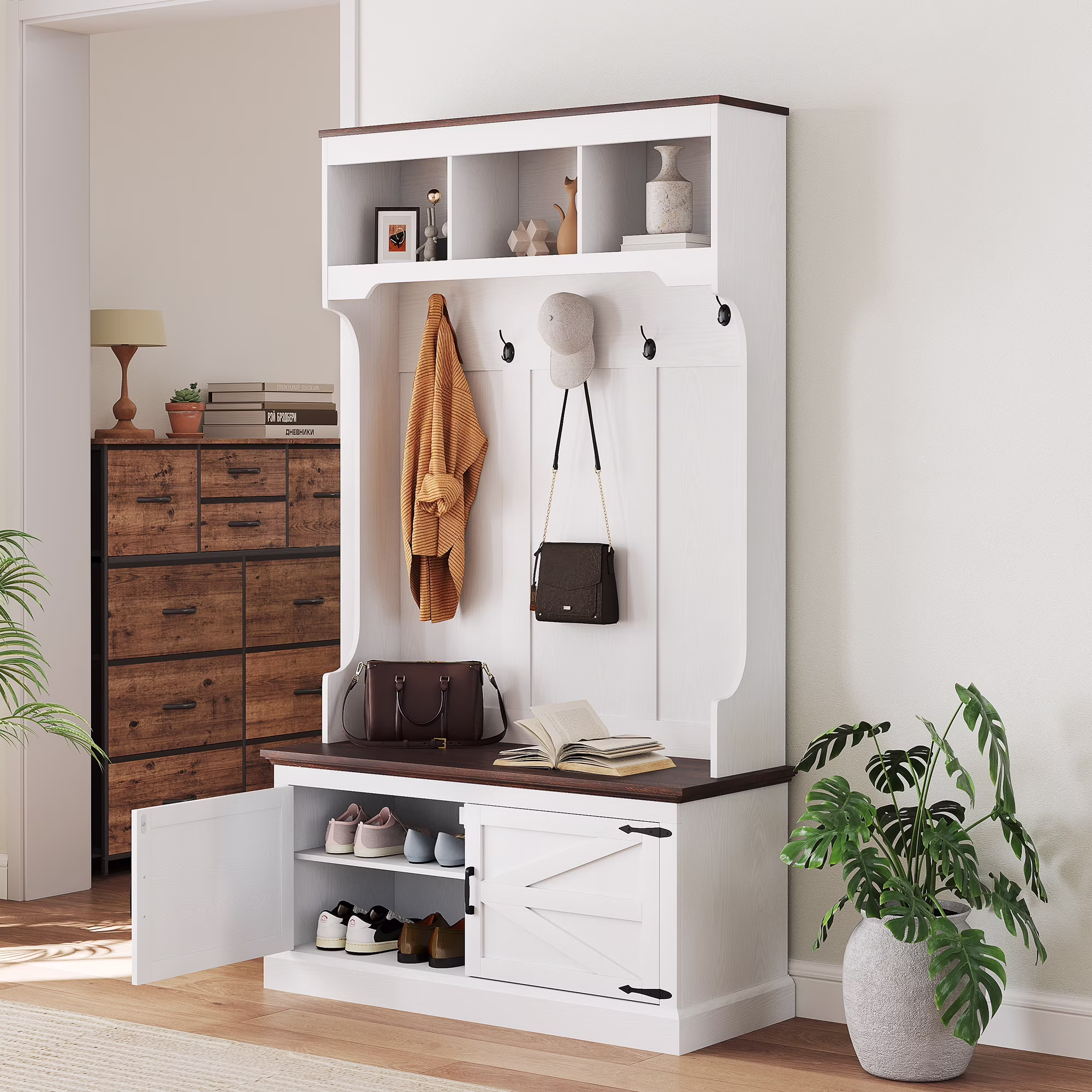 - Farmhouse Charm: This farmhouse hall tree brings a rustic touch to any space. Great for storing shoes and hanging coats in your entryway or hallway.