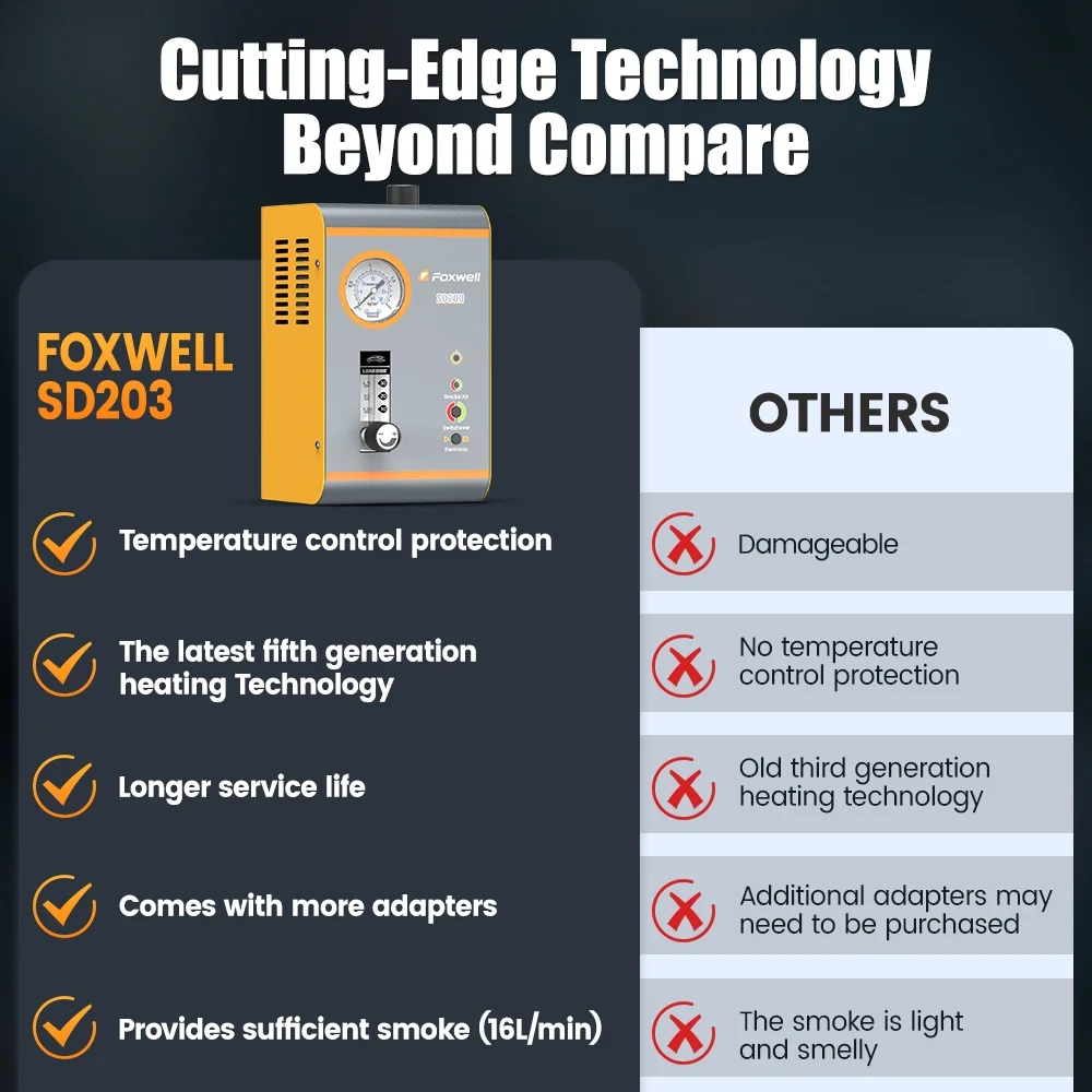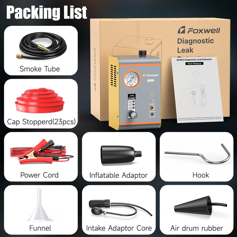 The FOXWELL SD203 automotive smoke tester is designed for all 12V vehicles, including cars, minivans, and light-duty trucks. It delivers thorough leak detection across critical systems such as EVAP, Emission, EGR, vacuum, engine, intake, exhaust, fuel tank, turbo, and more��ensuring your vehicle maintains peak performance and safety.