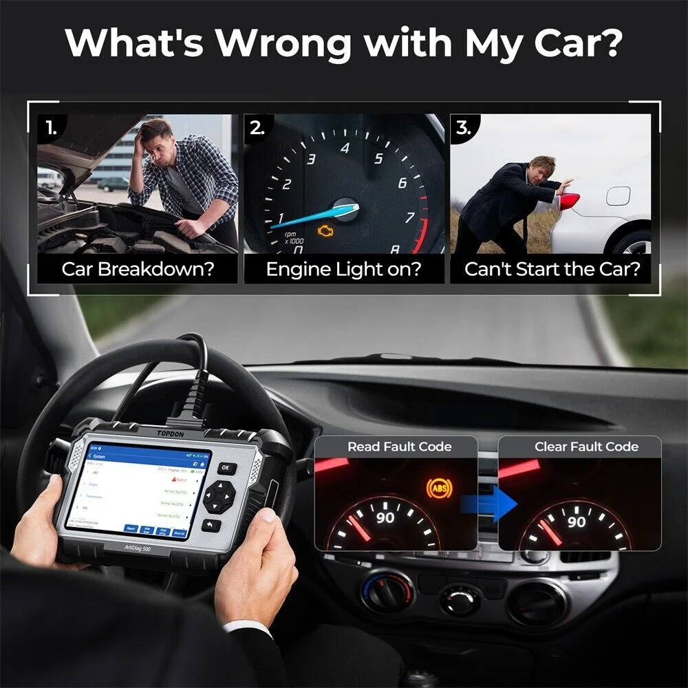 The AD500 OBD2 scanner boasts a 5-inch screen for an immersive display, a user-friendly combination of touchscreen and physical buttons, 2GB RAM + 32GB ROM storage capacity, a long-lasting 3350mAh battery, and a sleek ergonomic design for an aesthetically pleasing appearance. The package dimensions are 10.28.32.4 inches.