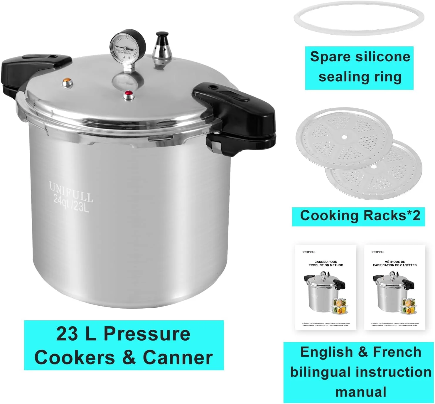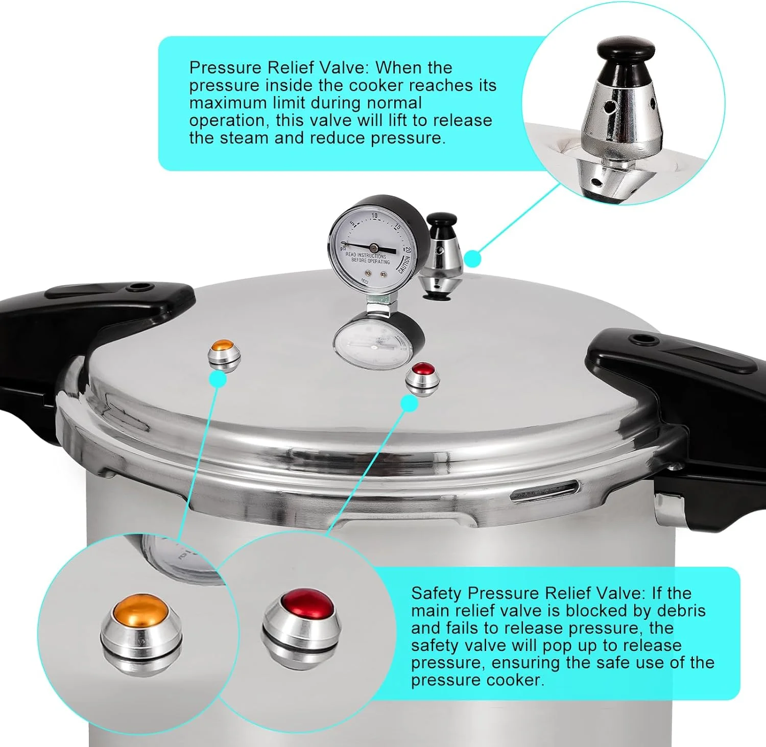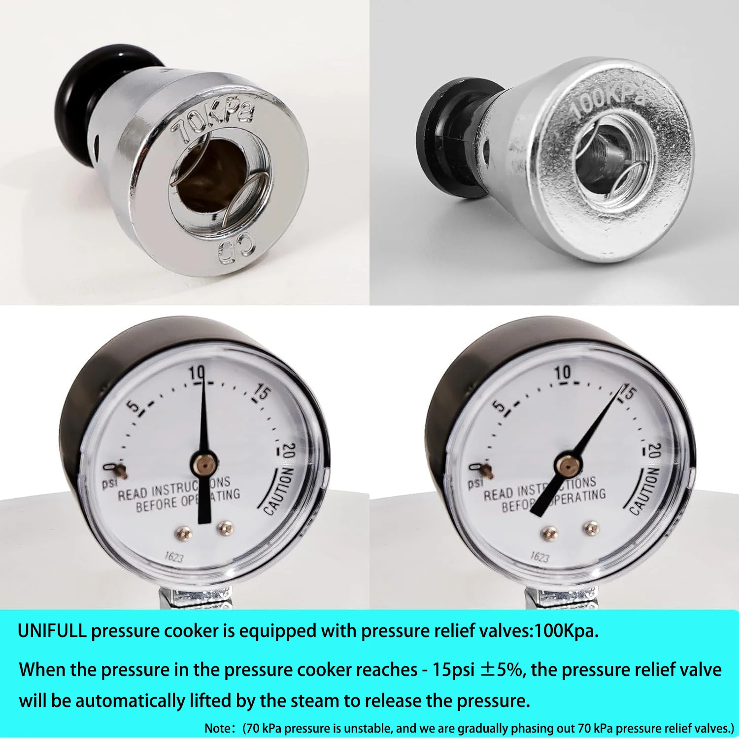 - Pressure relief pressure valve (15 PSI ��5%): UNIFULL pressure cooker is equipped with a 100Kpa pressure relief valve. When the pressure in the pressure cooker reaches 15 PSI, the pressure relief valve will be automatically lifted by steam to release the pressure.