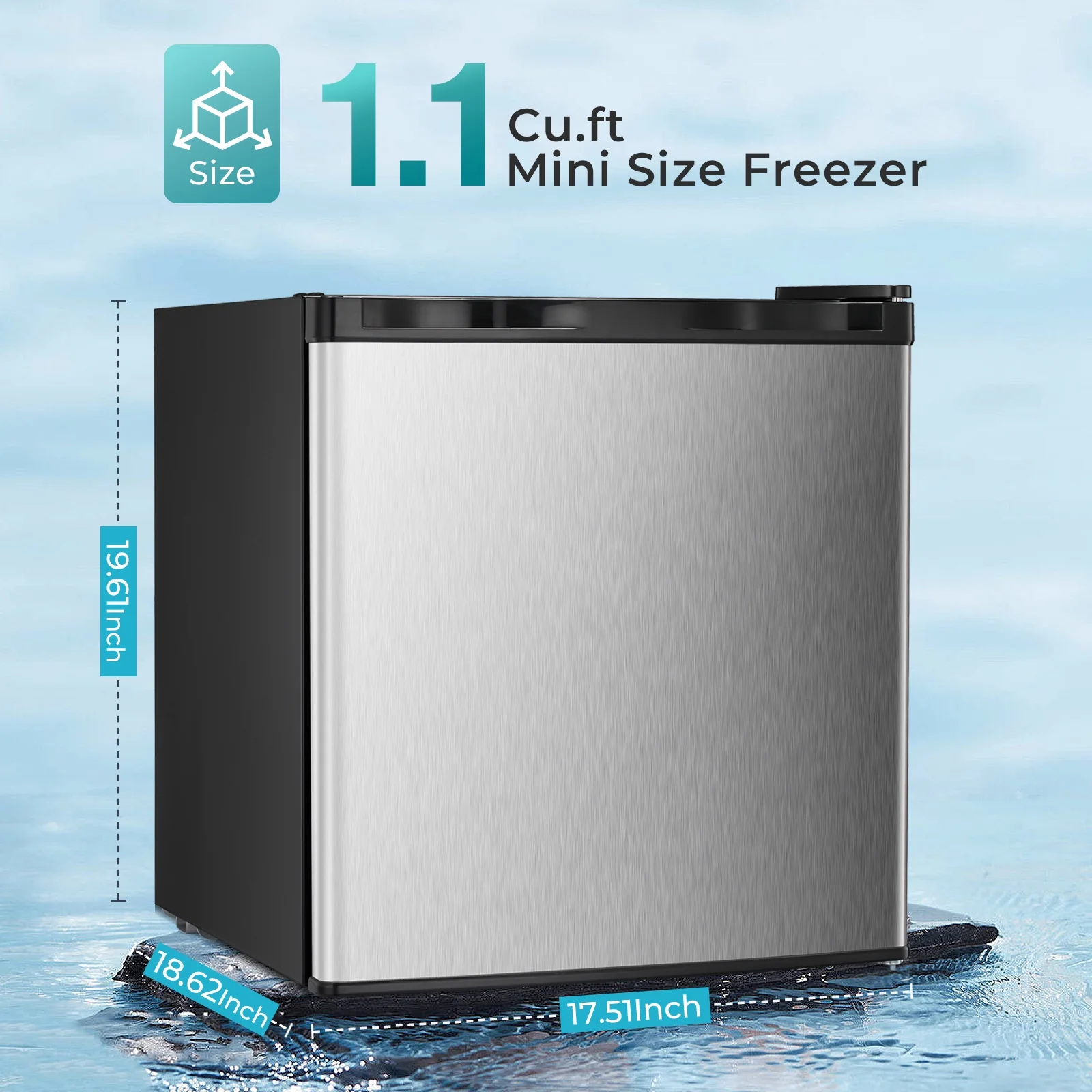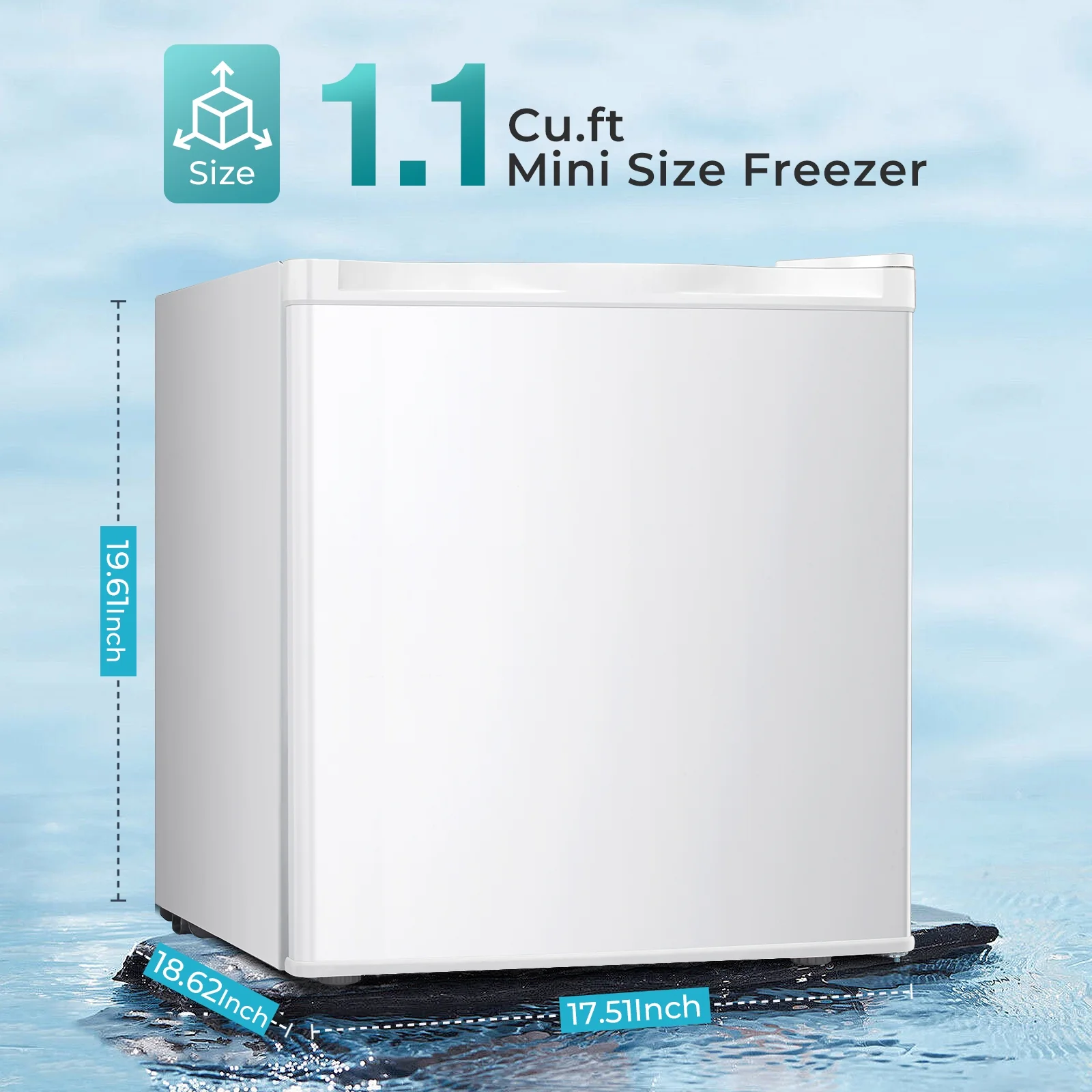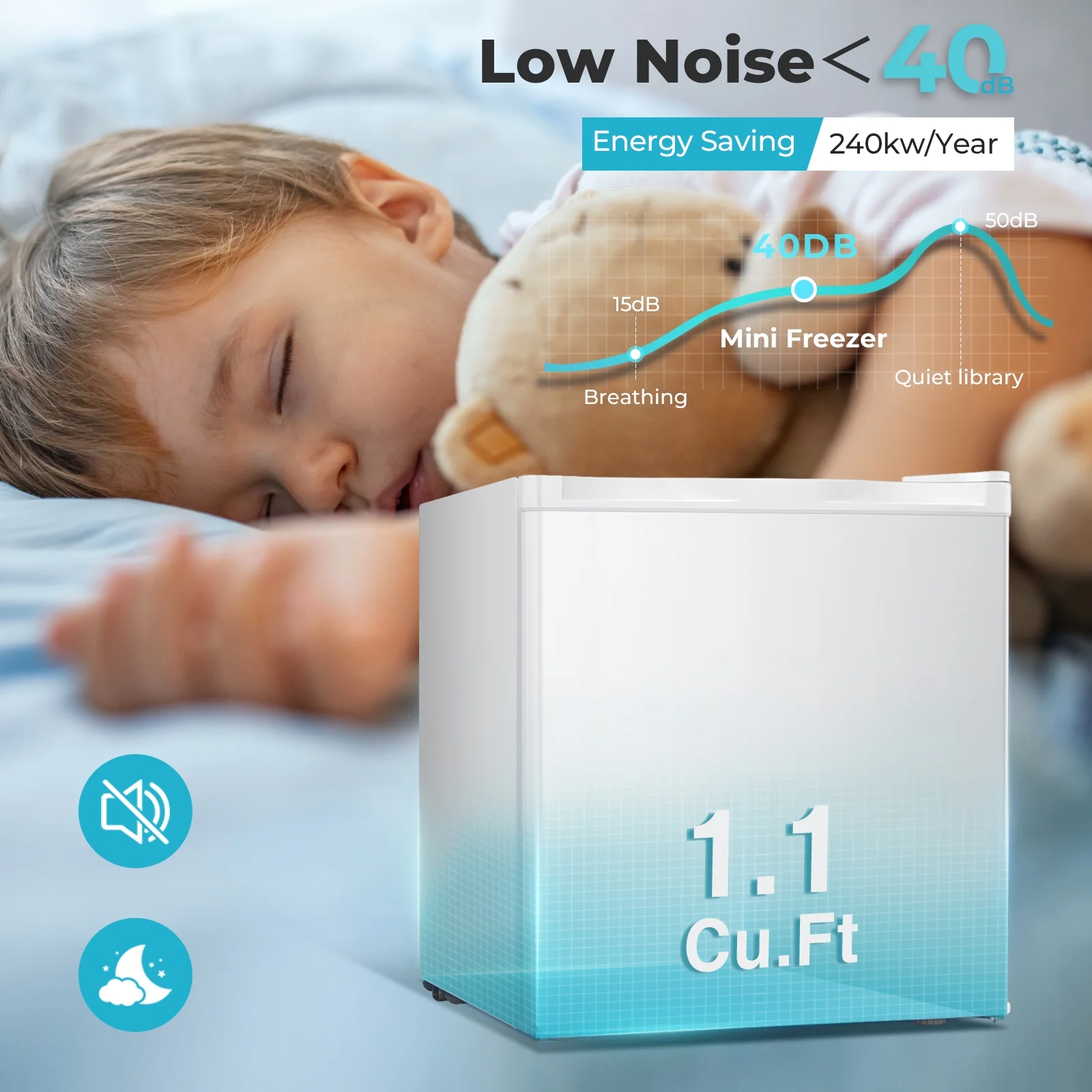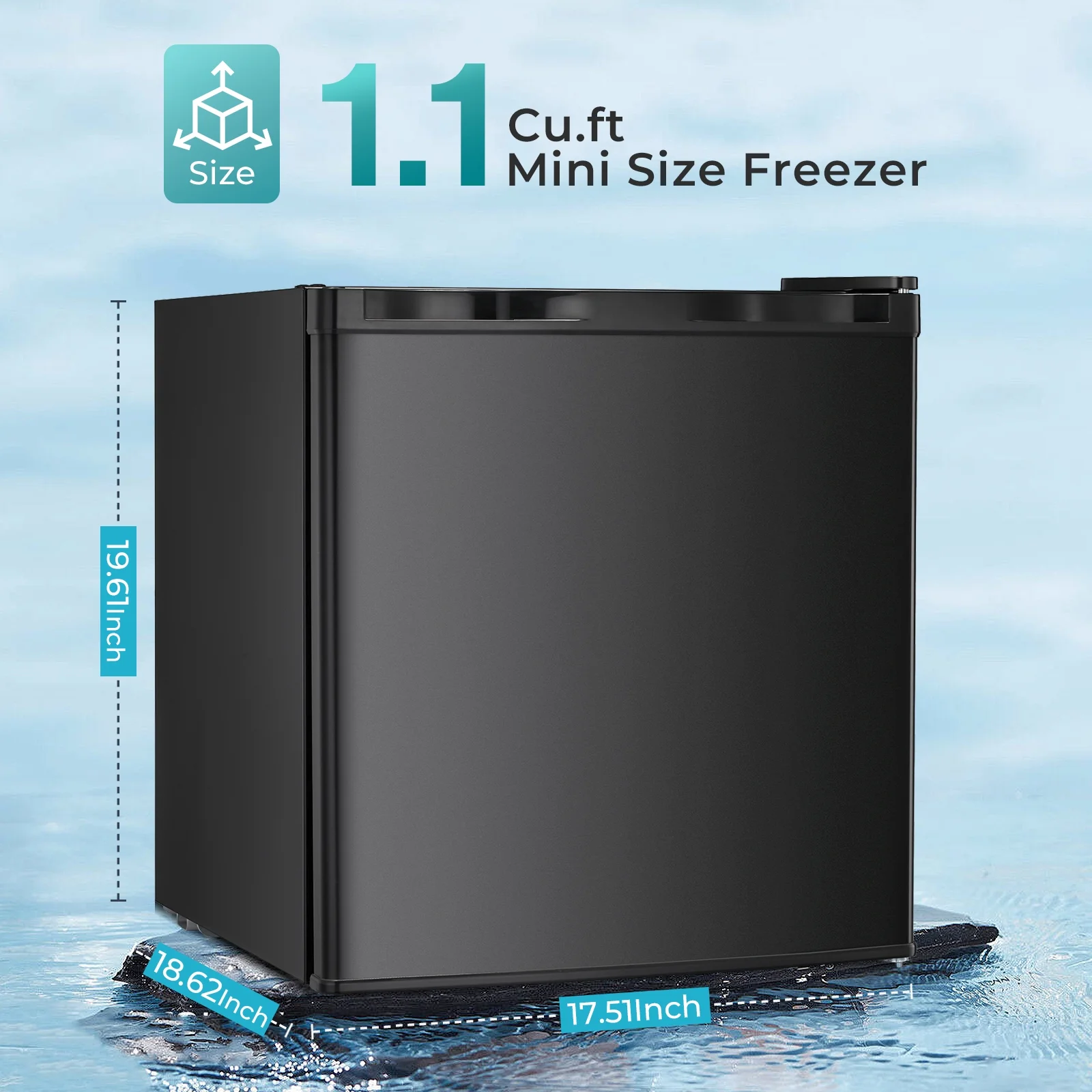 WAA 1.1cu.ft mini freezer (17.32"W��18.11"D��19.29"H) optimizes space with a compact yet roomy interior for bulk storage. Upgraded features include a reversible door for flexible placement, adjustable shelves/feet, and thickened seals to lock cold air and speed cooling. A 7-grade temperature control (6.8��F to -7.6��F / -14��C to -22��C) adapts to diverse needs, from fresh produce to frozen goods. Its energy-efficient R600a compressor uses just 0.45 kWh/day and operates quietly at 40dB. Designed for versatility, the modern, space-saving unit suits homes, kitchens, or small businesses, blending seamlessly into contemporary lifestyles.