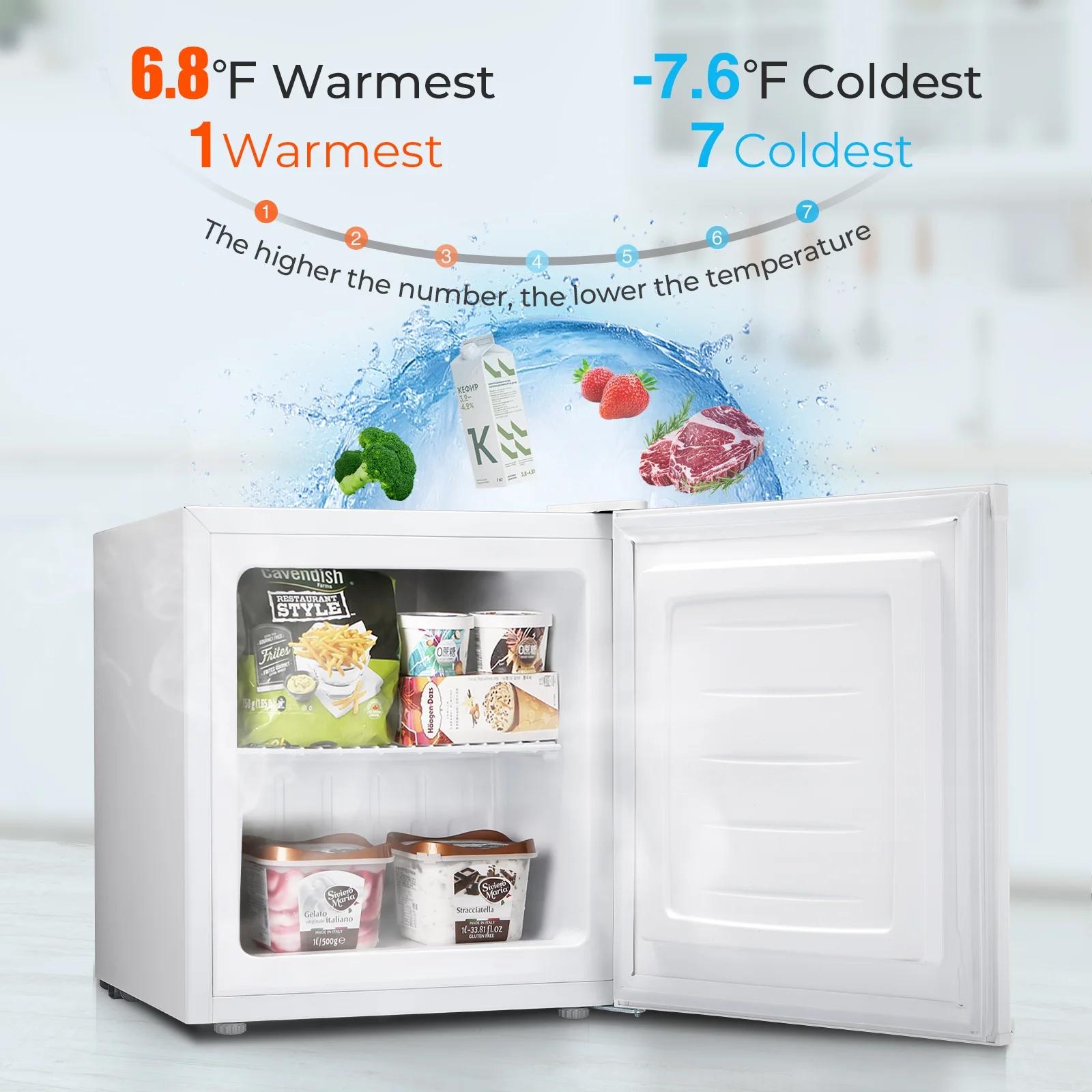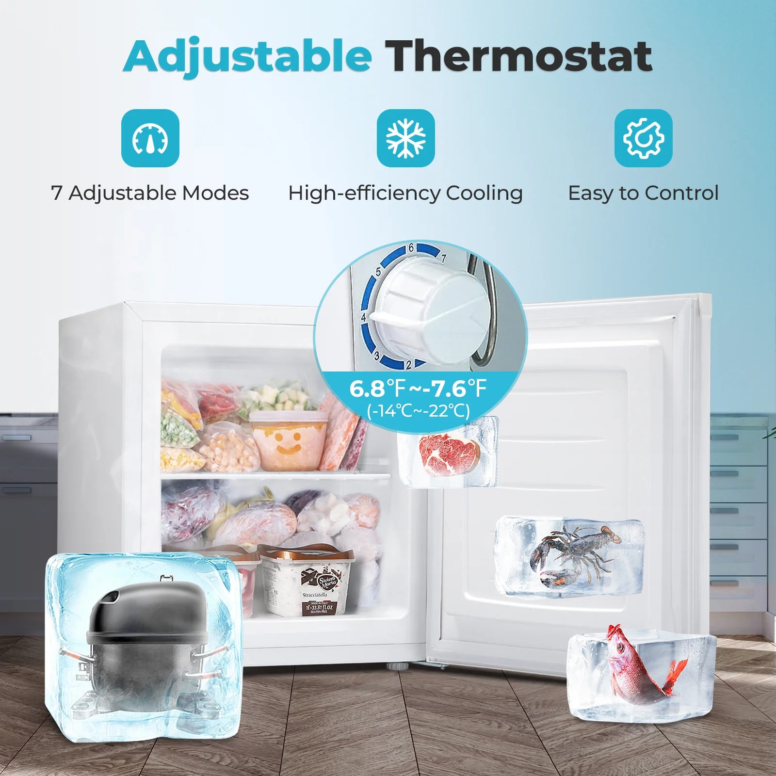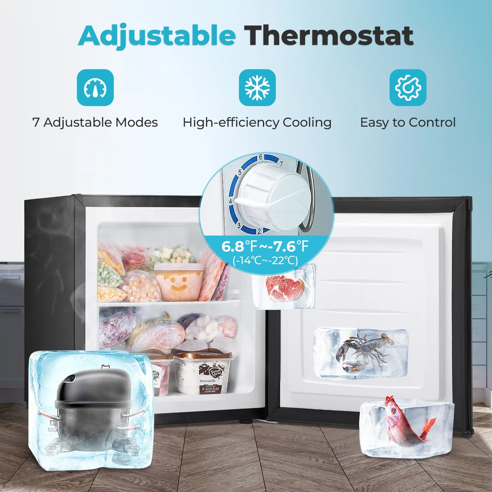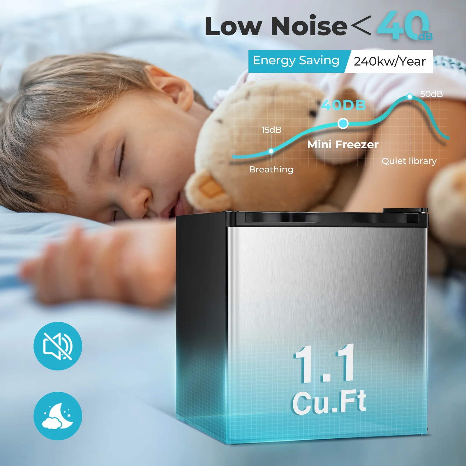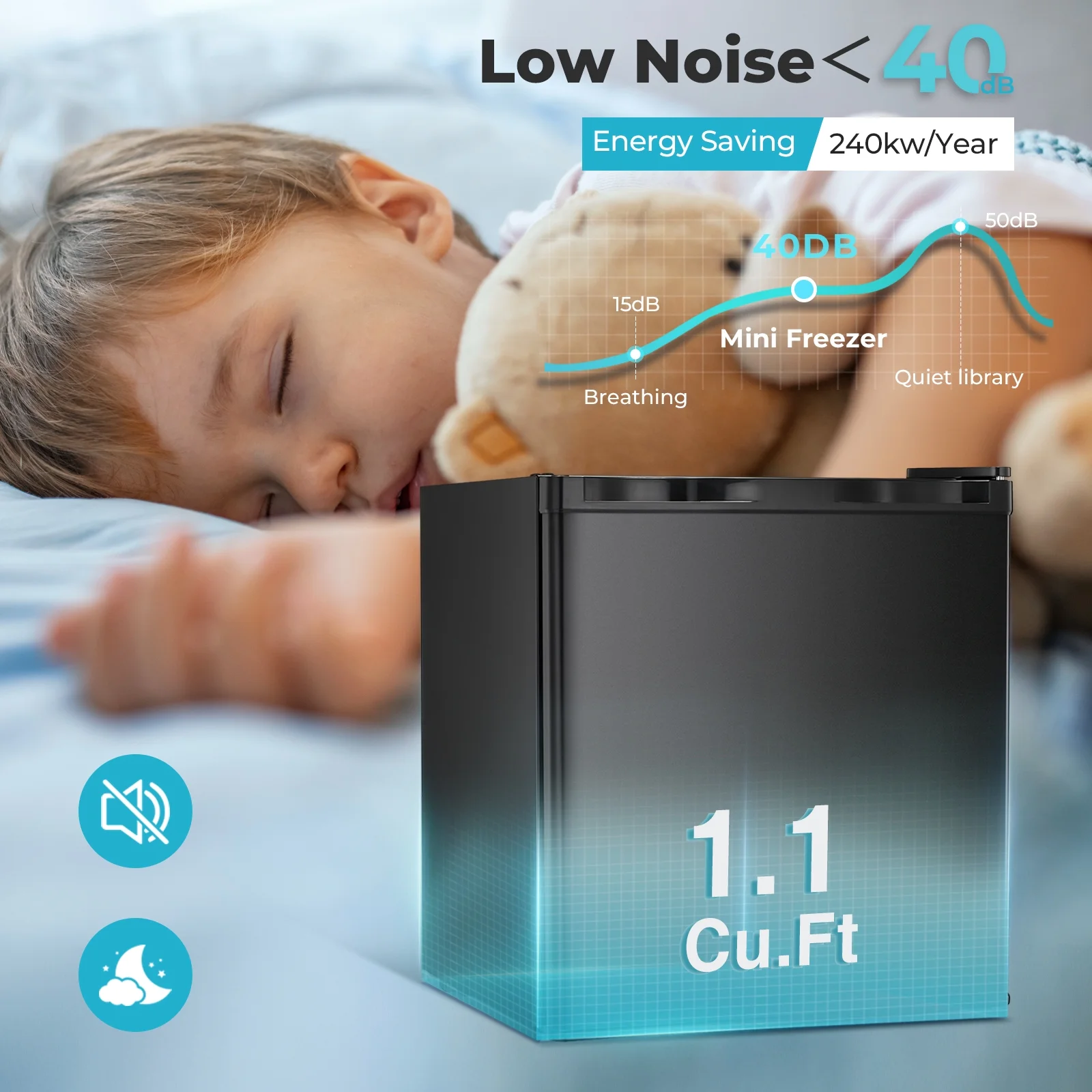 WAA 1.1cu.ft mini freezer (17.32"W��18.11"D��19.29"H) optimizes space with a compact yet roomy interior for bulk storage. Upgraded features include a reversible door for flexible placement, adjustable shelves/feet, and thickened seals to lock cold air and speed cooling. A 7-grade temperature control (6.8��F to -7.6��F / -14��C to -22��C) adapts to diverse needs, from fresh produce to frozen goods. Its energy-efficient R600a compressor uses just 0.45 kWh/day and operates quietly at 40dB. Designed for versatility, the modern, space-saving unit suits homes, kitchens, or small businesses, blending seamlessly into contemporary lifestyles.