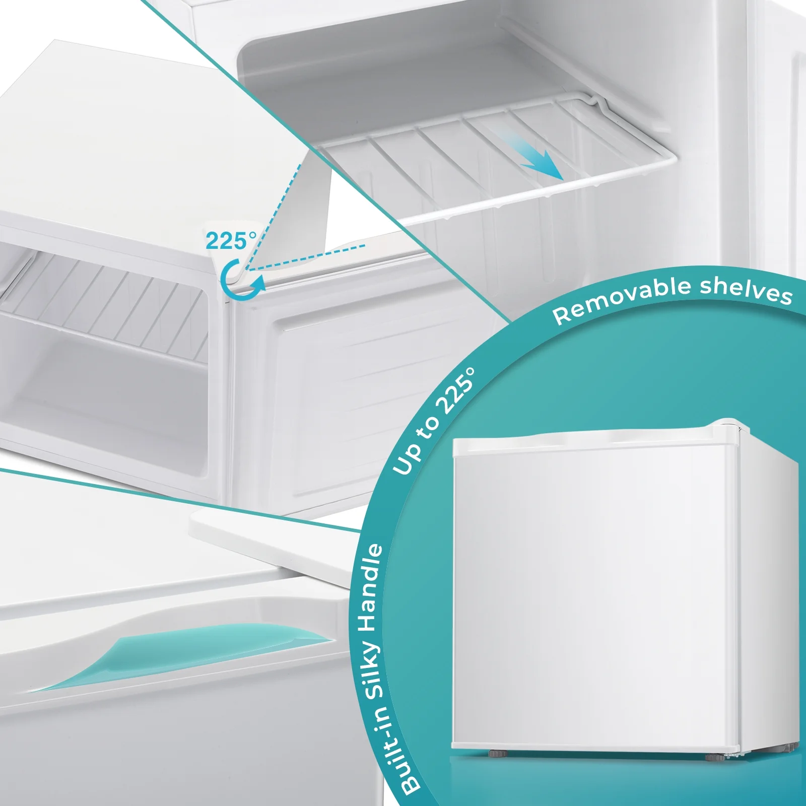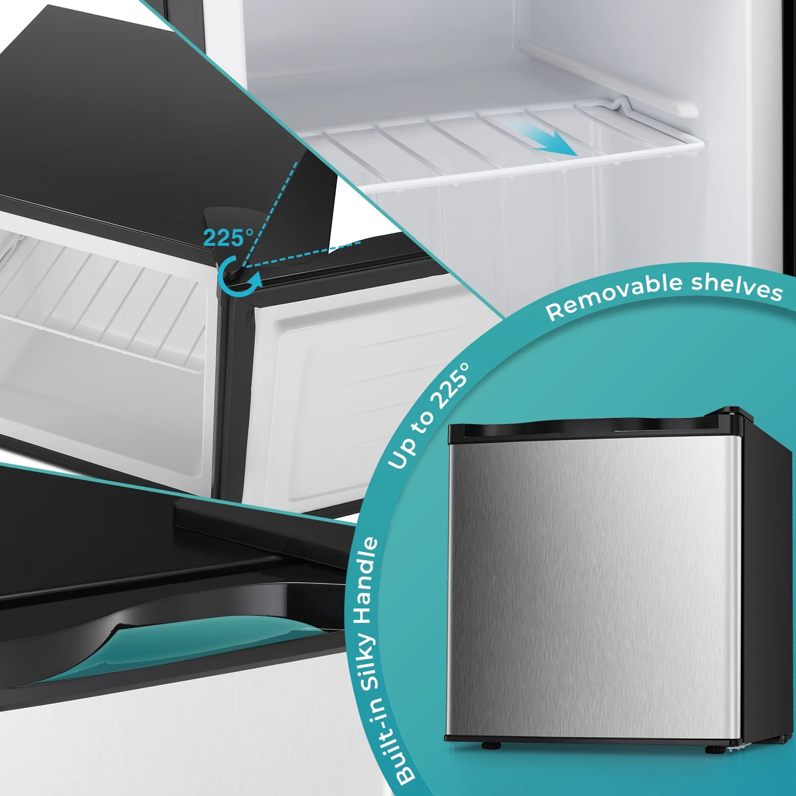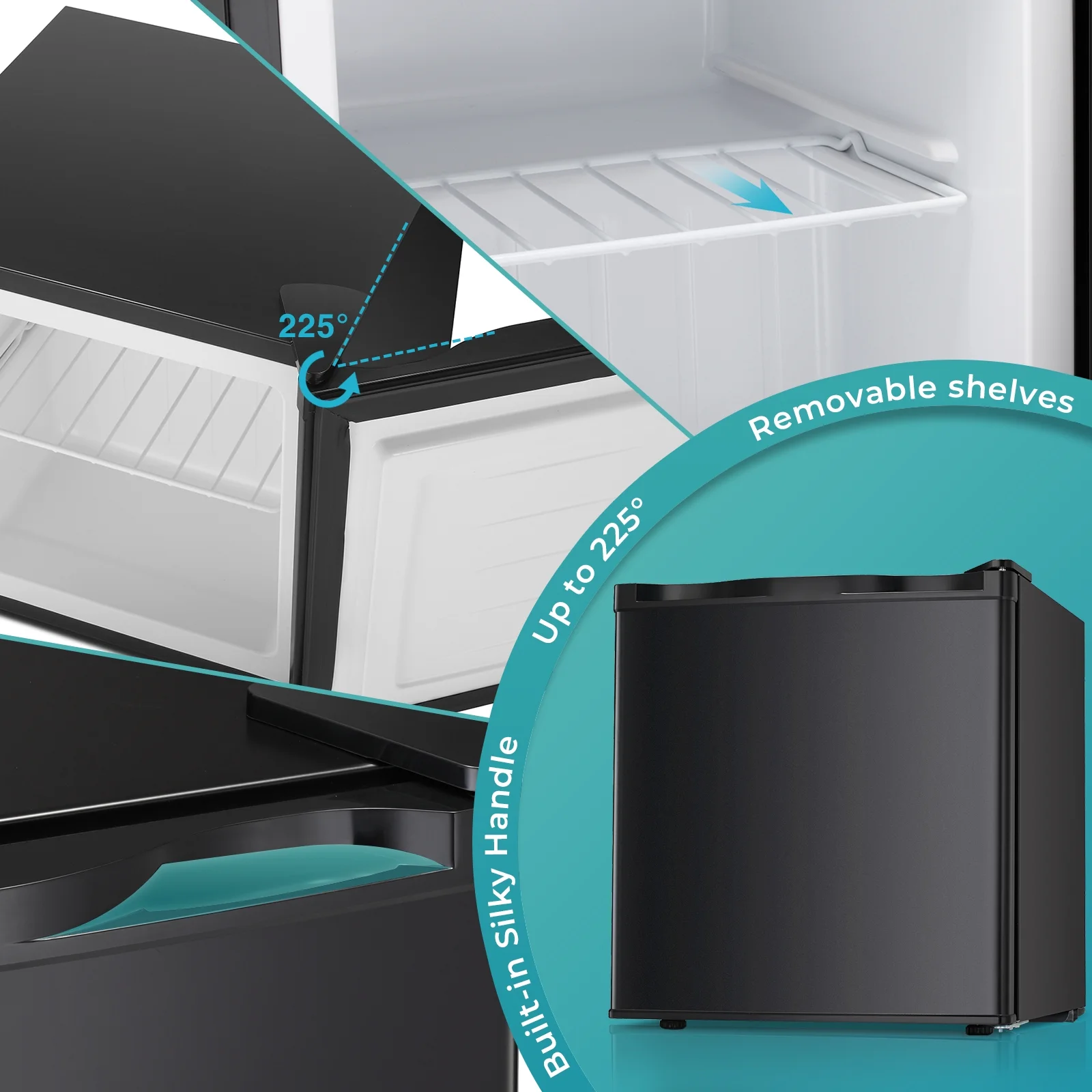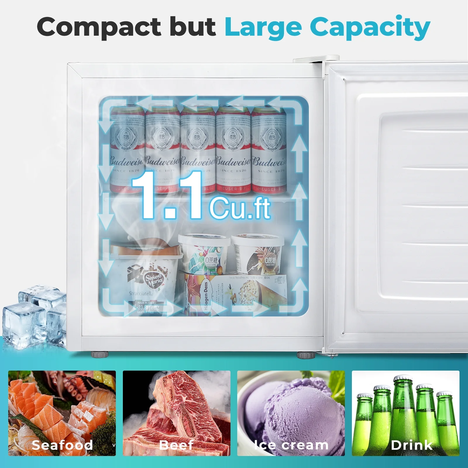 WAA 1.1cu.ft mini freezer (17.32"W��18.11"D��19.29"H) optimizes space with a compact yet roomy interior for bulk storage. Upgraded features include a reversible door for flexible placement, adjustable shelves/feet, and thickened seals to lock cold air and speed cooling. A 7-grade temperature control (6.8��F to -7.6��F / -14��C to -22��C) adapts to diverse needs, from fresh produce to frozen goods. Its energy-efficient R600a compressor uses just 0.45 kWh/day and operates quietly at 40dB. Designed for versatility, the modern, space-saving unit suits homes, kitchens, or small businesses, blending seamlessly into contemporary lifestyles.